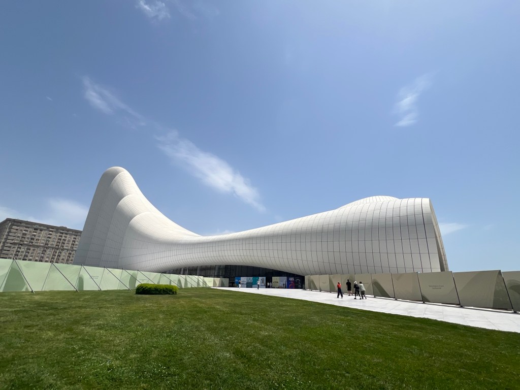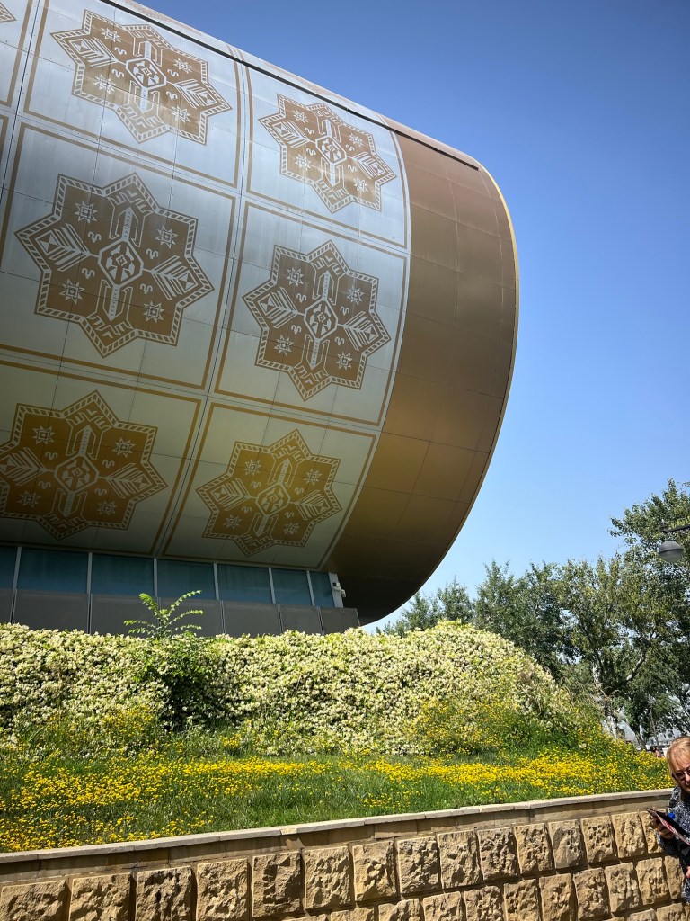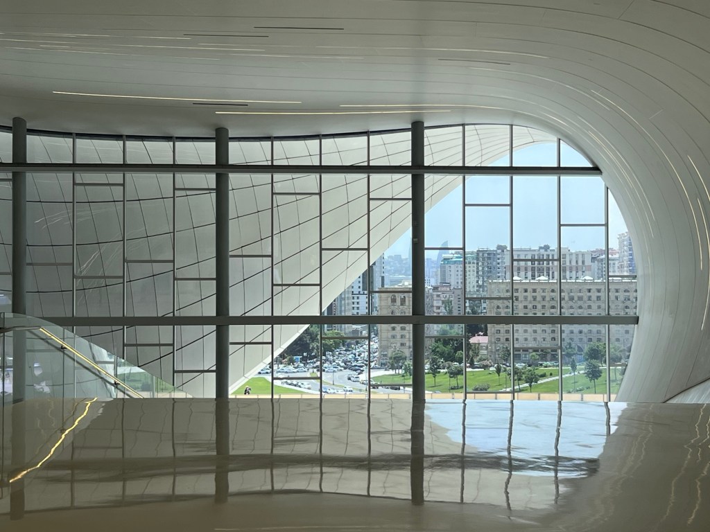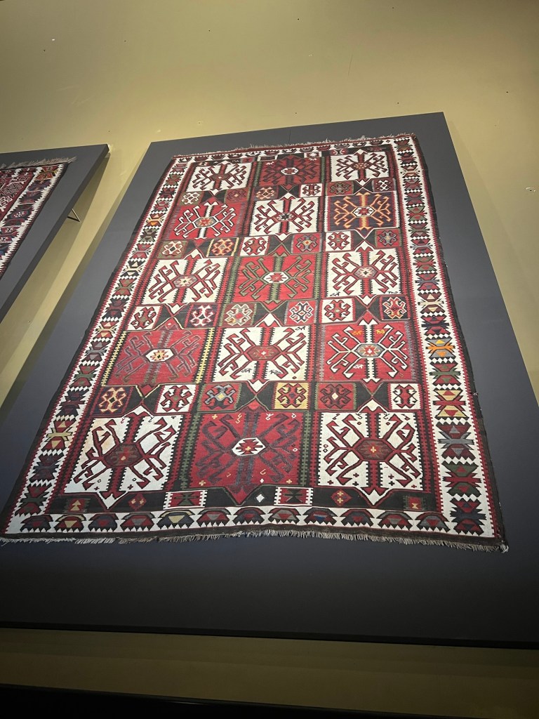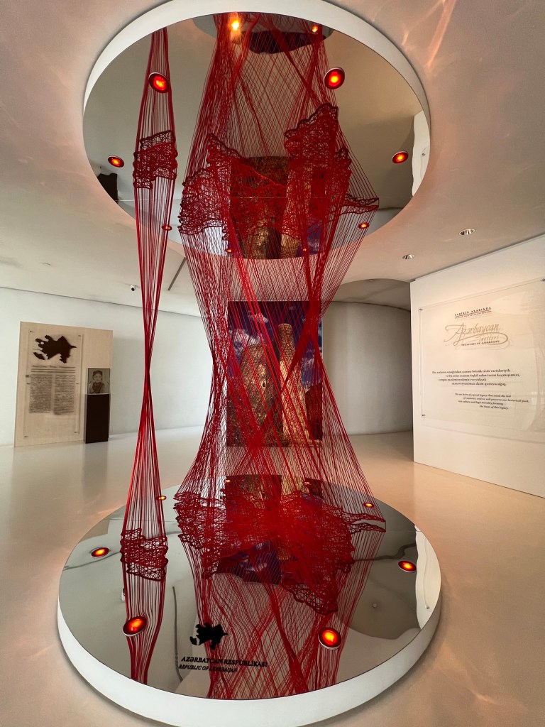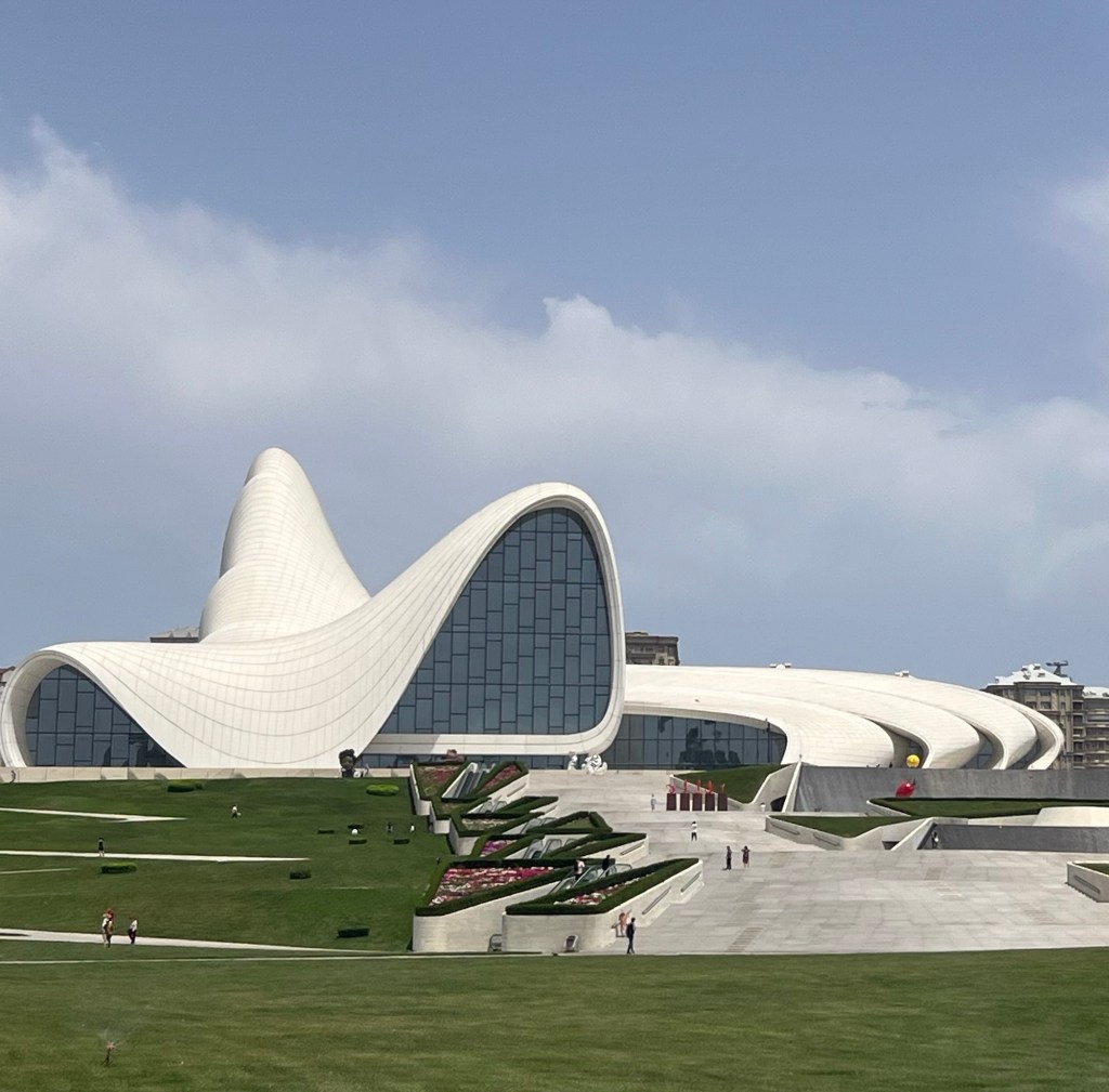 We visited the Heyda Aliyev centre designed by the world renowned architect Zaha Hadid. We had seen this awesome white wavy building as we drove in and around Baku. Entering it was an experience in itself regardless of its contents. It was like being in a cloud. Soaring ceilings, light and white, even the stairs! Not corners just curves. Its design was a direct rejection of the conformism of Soviet rule and Brutalist design. Aimed at accessibility to all and as a space to celebrate Azeri culture and arts.