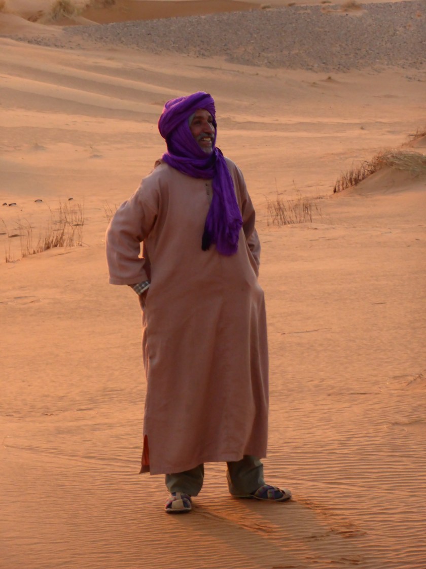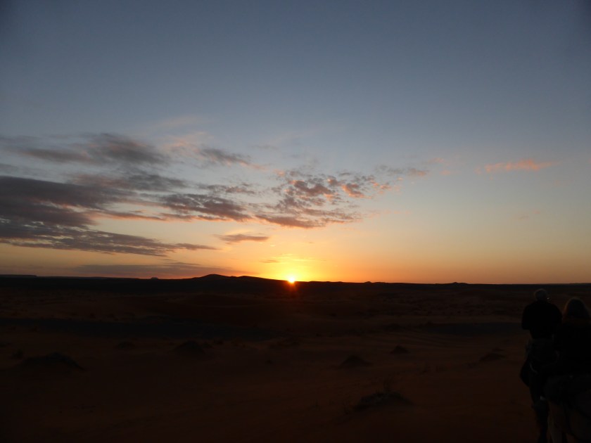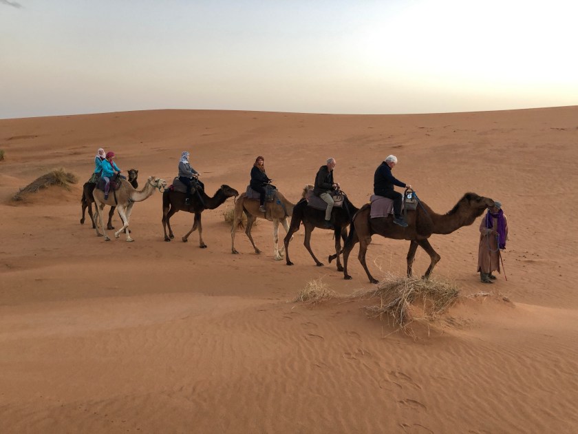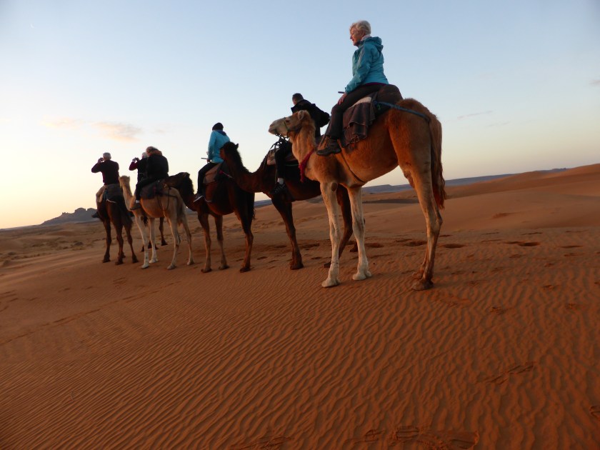 When we arrived at our dessert camp we were all thrilled by the tent accommodation. It was so delightful with a little kettle over our hand basin in our personal tent, and an eco toilet, and shower where you had to pump the water. We were greeted with mint tea and biscuits then we went up onto the top of the sand dune to watch the sunset. We all had our heads dressed in traditional headwear which was fun. Then the cameleer came in with the camels and we took a short ride. Mary was very anxious and screamed every time the camel did something more than walk. At one stage she was going Oh! Oh! And I said she sounded like she was having an orgasm. The cameleer thought it was a huge joke! I loved being on a camel again. Ridouane took photos for us. I was on the last camel.