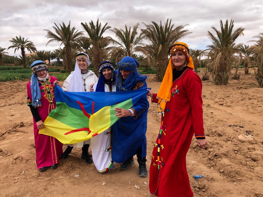 We stopped at a Berber shop where we all got dressed in Berber gear. Unfortunately I had my dress over my clothes and I look a bit like a pregnant midget! We all loved the head dresses though. we posed with the Berber flag which symbolises blue for the sea, green for the land, yellow for the desert, and the Berber symbol which combines the cross of Christianity, Judaism and the crescent for Islam.