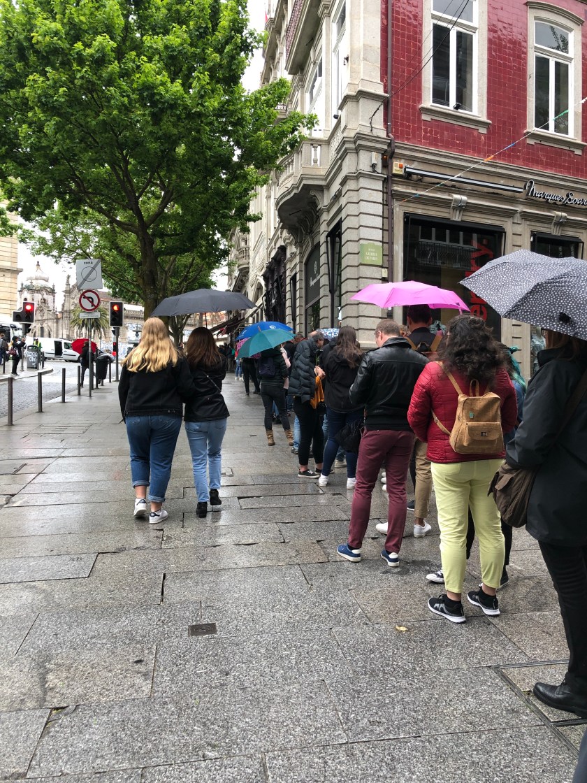 This morning we woke to heavy rain. We intended to visit the Livaria Lello Book shop so we got up early and decided we would eat breakfast out after the visit. When we set off my boots were slipping on the wet pavement tiles and I grabbed Bill’s arm for stability. I felt like a child because he is so tall. I was nervous about falling.