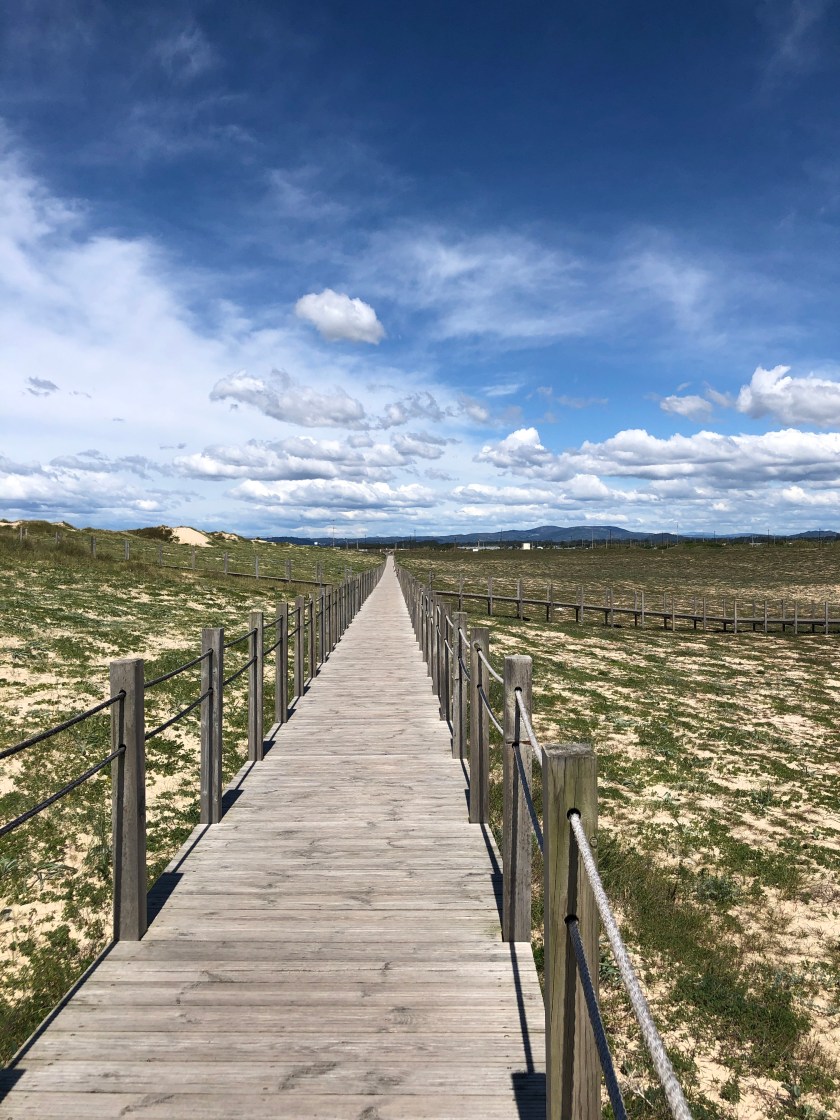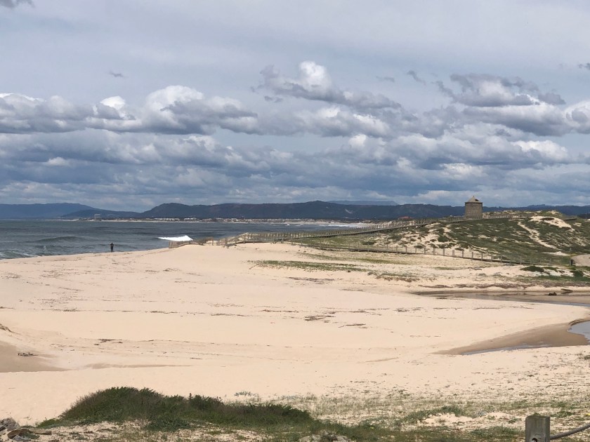 The route lead us out of town to the seaside. There is barely any demarcation from one town to another. Povoa de Varzim was a lovely town with a pretty town square. I loved this sculpture called woman. The way lead to the beach with lots of cafes surrounded by sand bunkers. The beach is very wide and quite flat so there were lots of volley ball courts, and soccer goals all along as we walked.