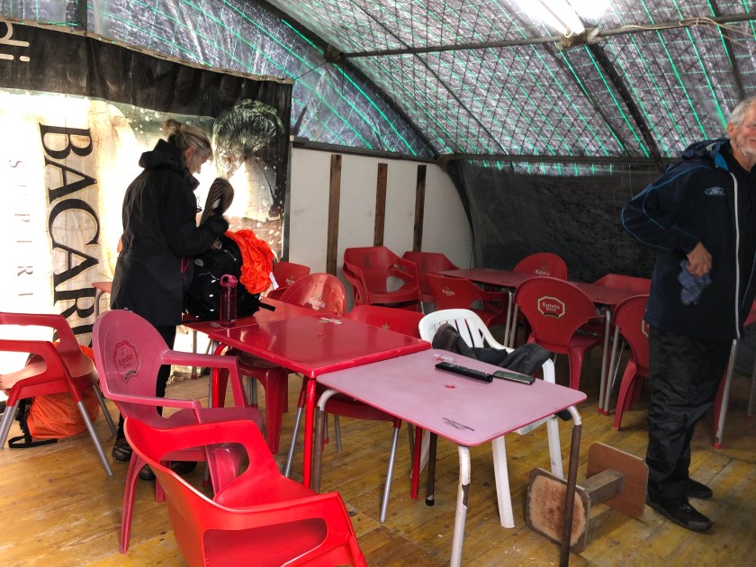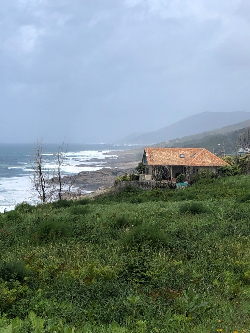 From A Guarda we were on rugged, rocky coastline buffeted by showers, hail and intermittent sunshine. It was quite invigorating but we eventually started to feel cold. In our haste to bypass the Zombies we forgot to stock up on lunch and were contemplating a day of sesame snacks and mixed nuts! We were flagging when we happened on a pop up cafe. An enterprising young lad had converted a container to a shop and added a dome tent for seating and shelter. He offered tortillas, bocadillas, cakes and coffee. It was like an oasis( but no toilet). He sold us lunch with a minimum of words and us pointing to what we wanted. Three? All? €12. He had a captive market and when it was quiet he watched TV or played video games. Soon other pilgrims streamed in and the tent was crowded.
