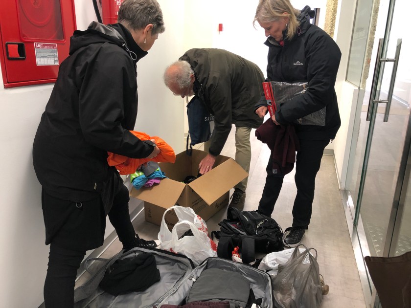 Bill had gone off looking for a place to charge his phone. It is always a bit fraught because he has a Portuguese sim. The three of us had a practice pack to check we could fit all of the ‘stuff’ in the box. Once that was achieved we realised it would be too heavy to carry! In the end we unpacked a suitcase and stuffed the excess into that and a backpack and returned to the post office to pack it there. This time we took umbrellas.