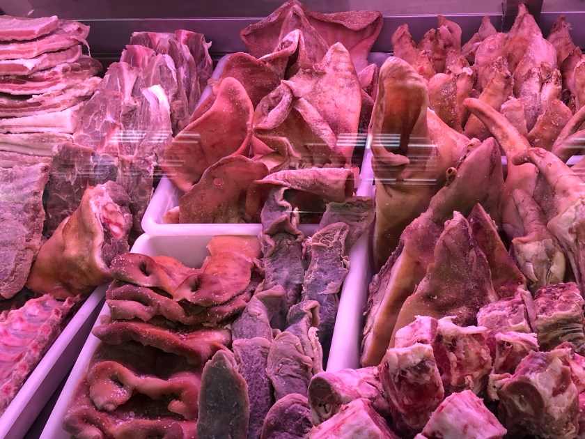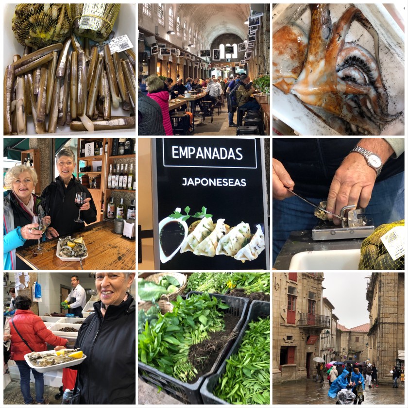 Anne and I tidied up the apartment then departed in the rain to take our bags to luggage storage. Anne had found a plastic bag that she draped over her backpack and I lamented the posting of the poncho! Once the bags were divested, somewhat bedraggled, we headed off to the Santiago fresh food market. We actually found it without a problem. We were getting the hang of the place. What a charming market. All the fruit and vegetables we have craved were spread before us. Even the greens still had dirt. We wandered into the fish part and saw a guy with an oyster and lemon on a plate. It was only 11ish but we decided to buy some too and the oyster seller told us to go down to the end of the hall and get wine to go with them. We did a tasting of two very delicious wines with our freshly shucked oysters. They were fat and juicy and gorgeous. We felt quite decadent! The market has an area where if you buy from the stalls they cook it for you. We passed several people with prawns and octopus and sausages. We ended up at a Japanese stall and had soba noodles and vegetables as well as dumplings. It was so nice for a change.