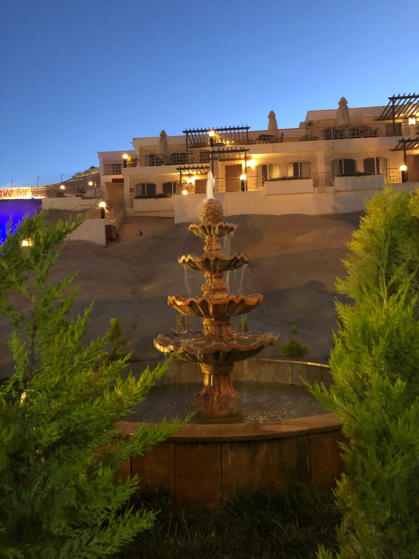 On the way we had stopped for a break at a cafe with tourist (trap) shop like Aladdin’s Cave. The jewellery was fantastic and all the women were abuzz. Kathy H was particularly taken with a square ring of Zultanite, which changed colours in different light. The stone was surrounded by diamantés. It was gorgeous and she bought it for her present. I was particularly taken by the adventurine and silver. The stone is navy blue with mica flecks which makes it sparkle. It was supposed to be good for your health too. So we were celebrating the anniversary with the ring and Champagne and went to the bar after 8.30 when the Ramadan fast was broken and we were able to buy alcohol. Though they proudly produced champagne it was only just cold and Anne, who doesn’t like plain champagne asked for a Champagne cocktail instead. She was horrified when the bartender offered her grenadine and red bull in her champagne! In the end she suggested how to make a champagne cocktail with sugar, brandy and fresh fruit. We resorted to adding ice to it too! It was a good night.