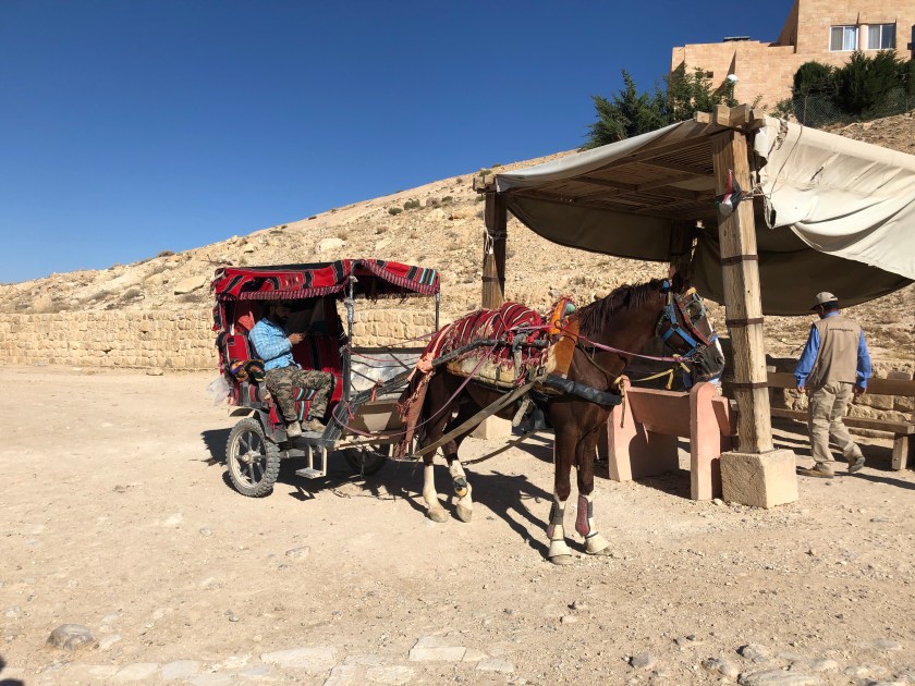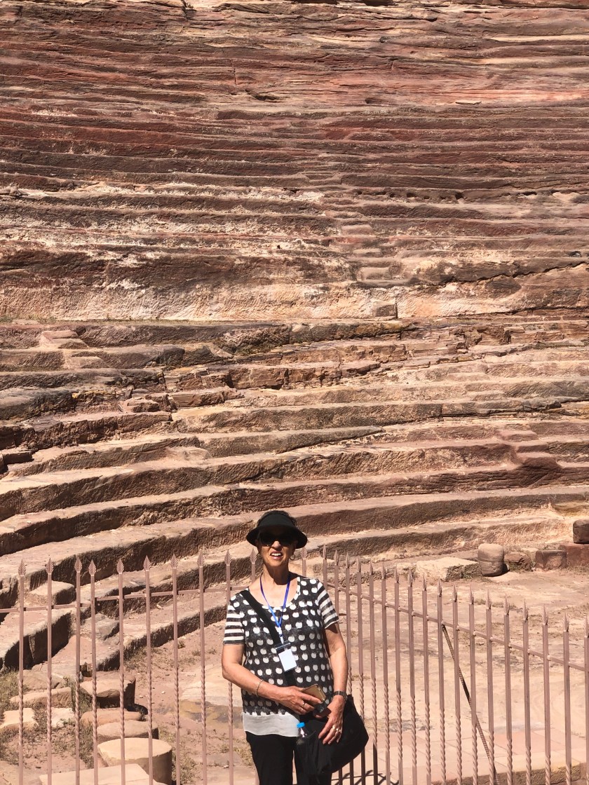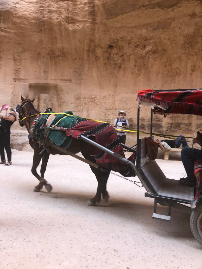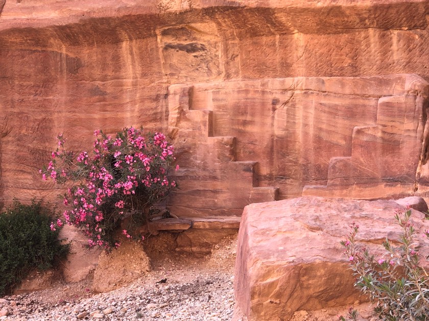 Next morning we set off for Petra which involved a steady descent of about two kilometres through the Siq, the narrow gorge before opening into Petra. The Siq itself is impressive and busy with people, horses and carts dashing down the path and donkeys or horses offered as alternatives to walking. When we arrived at the Treaury, the jewel of Petra, we were suitably impressed. It is hard to believe people would choose to live here but they did for at least 10,000 years and from as early as the 1st Century BC were ruled by the Nabataeans.
