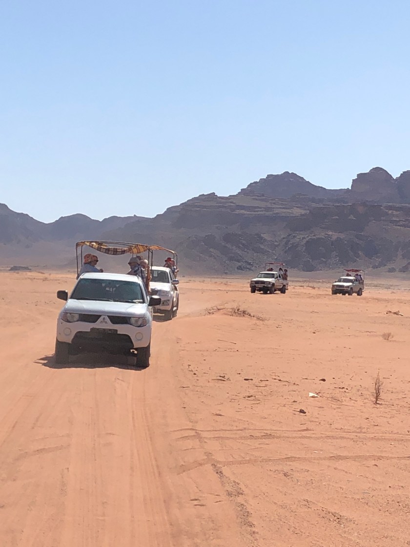 We explored down to the Roman theatre and up to the Royal Tombs but we were getting hungry so we returned to the hotel where our bus was waiting to take us to lunch and then on to Wadi Rum. It was a good drive through arid country and small farms where people had tapped into the ground for water. We were amazed that so much land was not cultivated because they can’t access water. Digging wells is very expensive apparently.