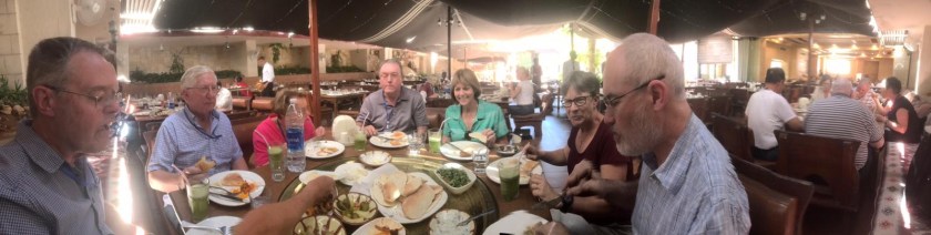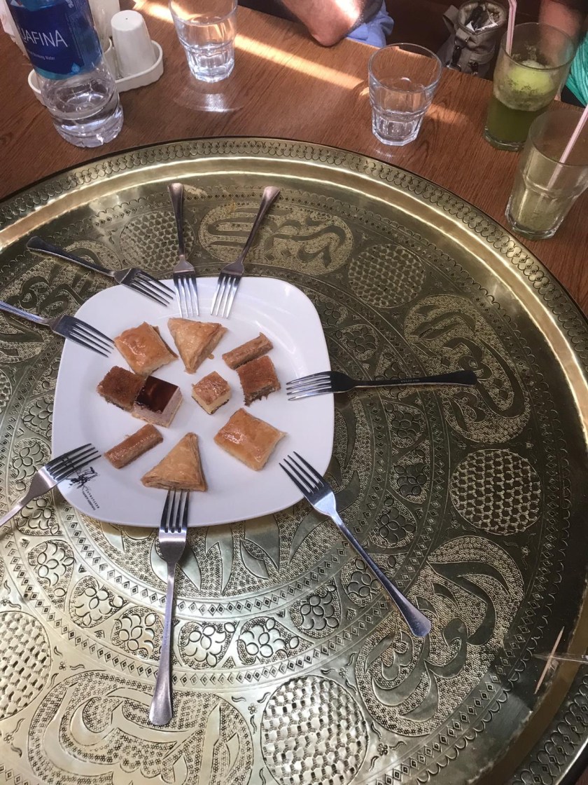 When we had a coffee stop we shared the Torte de Santiago that Anne and I brought from Spain. It was a pleasant change. Not too sweet. When we close to town we stopped at a special restaurant where they served the feast meal of mansef , a traditional dish of slow roasted lamb, yellow rice and hot goat yoghurt sauce. As usual there were many dips served of hummus, baba ganoush, yoghurt and cucumber, smoked eggplant, tiny sausages and chicken wings as a first course with flat bread then the main meal followed by dessert of sweet cakes. Julie and I decided we only wanted the light meal of the dips and we were a bit miffed at the end to find we paid more for less! Anne had had the full meal and only paid 16.50 Dinar including the drink. The waiters hadn’t charged us the special group price. We learned that it is best to be all in or all out. The staff just don’t cope with variations. Some of the others are not having lunch at all but just a drink.