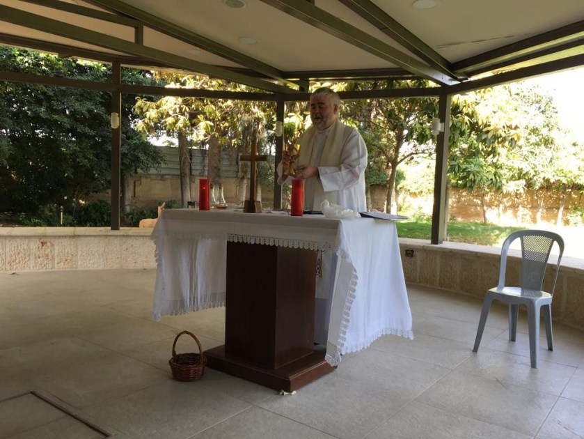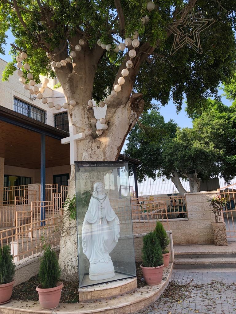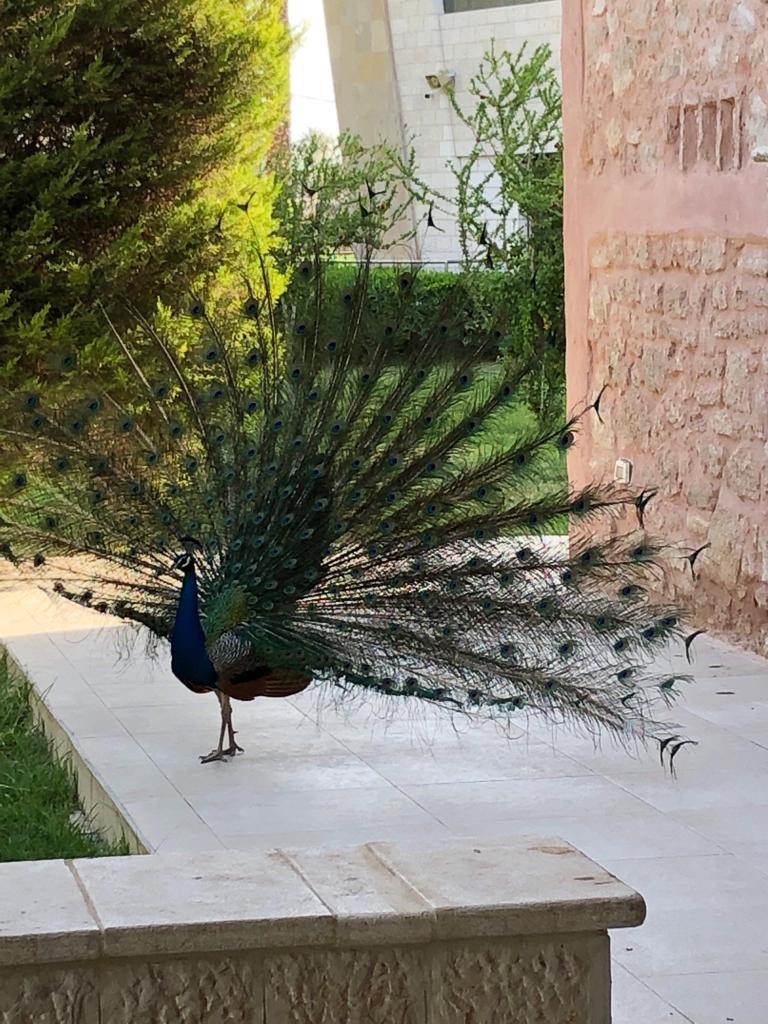 Before we left Jericho we visited a church nearby for morning mass. It was held in the grounds of a primary school. While we were praying the peacocks in the garden screeched and called. The male was quite glorious with his tail up. The church of the Good Shepherd was quite pretty but what caught our eye was the giant set of rosary beads in the tree and the painted white trunks of the trees. The white tree trunks apparently discourage insects from eating the trees.