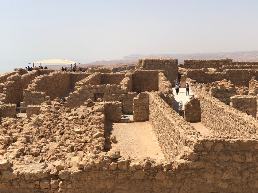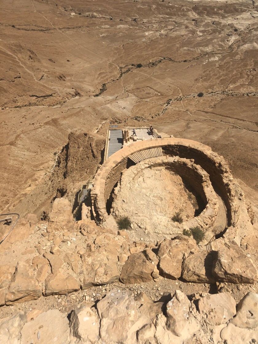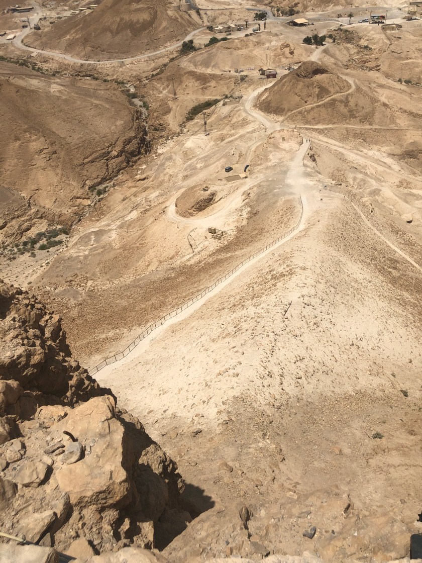 Our destination was Masada, a fort on the top of a mountain that is completely separate from the mountain range so it had a strong defensive position. It was built by Herod as a winter palace and safe haven (https://www.history.com/topics/ancient-middle-east/masada). It is famous for the fight to death of Jewish Zealots who refused to bow to the Romans. Death not slavery was their cry. The siege lasted for nearly three years but eventually the Romans built a ramp and tower with battering ram to breech the walls. The Jewish fighters had strengthened the walls against battering so the Romans decided to burn it instead and eventually the walls were breeched but they found that everyone was dead.