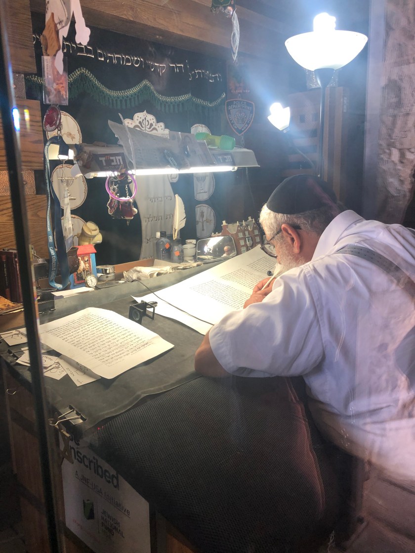 It is an impressive fort even now with ingenious methods for capturing water from the mountains behind it. They stored the water in huge cisterns and had many wharehouses of grain. The way up by foot was called the snake path but as it was nearly 42 degrees Celsius we took the cable car! We were all surprised when exploring the ruins of the synagogue we discovered a room with a Rabi writing Hebrew texts. He said we could take photos and gave Helen a card with her name and her husband’s name in Hebrew and a heart underneath as a gift to celebrate their wedding anniversary. He was the stereotypical grey haired, smiling faced, gentle Rabi with shawl and Yamak. It was so unexpected. He was writing beautiful uniform Hebrew biblical texts for the Torah.