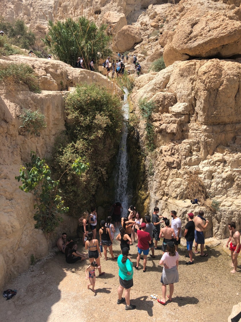 From here we travelled to En Gedi, a place of waterfalls. It seemed unbelievable that there would be water in this desert. It means spring of David. There were lots of young people frolicking under the water fall in the first pool. The water actually comes from a spring in a cave further up the mountain. The pools are shallow and rocky so even when people stood in them they didn’t get muddy. The water must flow because it is a national park but once outside the park it is captured and never enters the Dead Sea. There are wild Ibix (a type of mountain goat) which we actually saw as we entered the park. They were too fast for my camera though.g