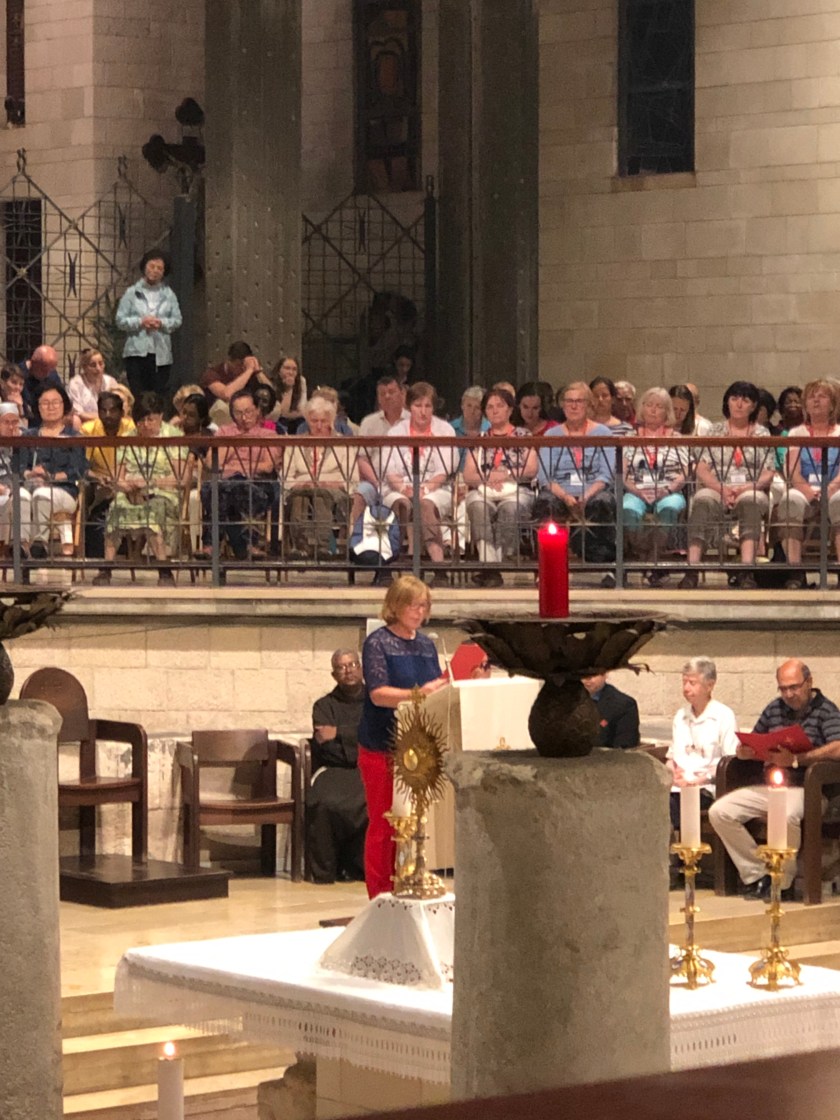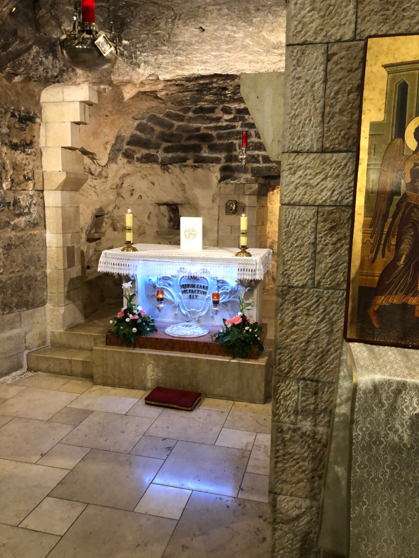 Our hotel was opposite the Church of the Annunciation, which has been built over what was believed to be Mary’s house and where she was visited by the Angel Gabriel. The church has been built and rebuilt over the centuries and has been in the hands of the Franciscan order since 1620. Two of the tour members, Lisa and Joe come from a parish in Melbourne that raises money for the school attached to the church. Lisa also went to school with one of the women associated with the church and so we were told about a service that was the Adoration of the host. A few of us decided to attend thinking it would be silent. However this service was not silent and had three singer musicians with the most exquisite voices. Mary, also one of the tour group, was asked if she would do a reading. Much to her horror she discovered it was being videoed after she had said yes. There were seven speakers with seven different languages. The singing absolutely transported me and I felt like crying. The whole service was so moving I was not the only person to get teary. Afterwards we visited the grotto below.