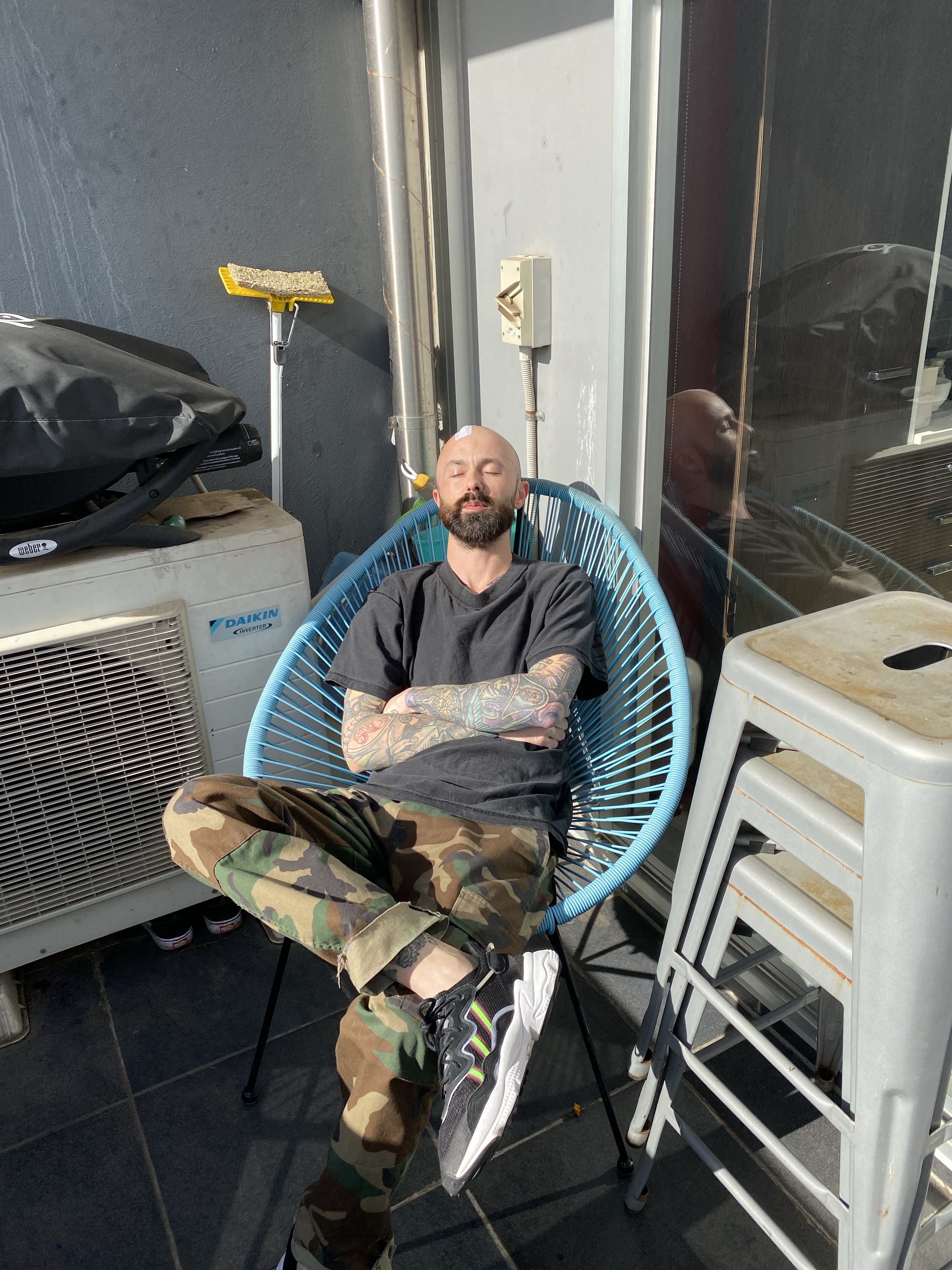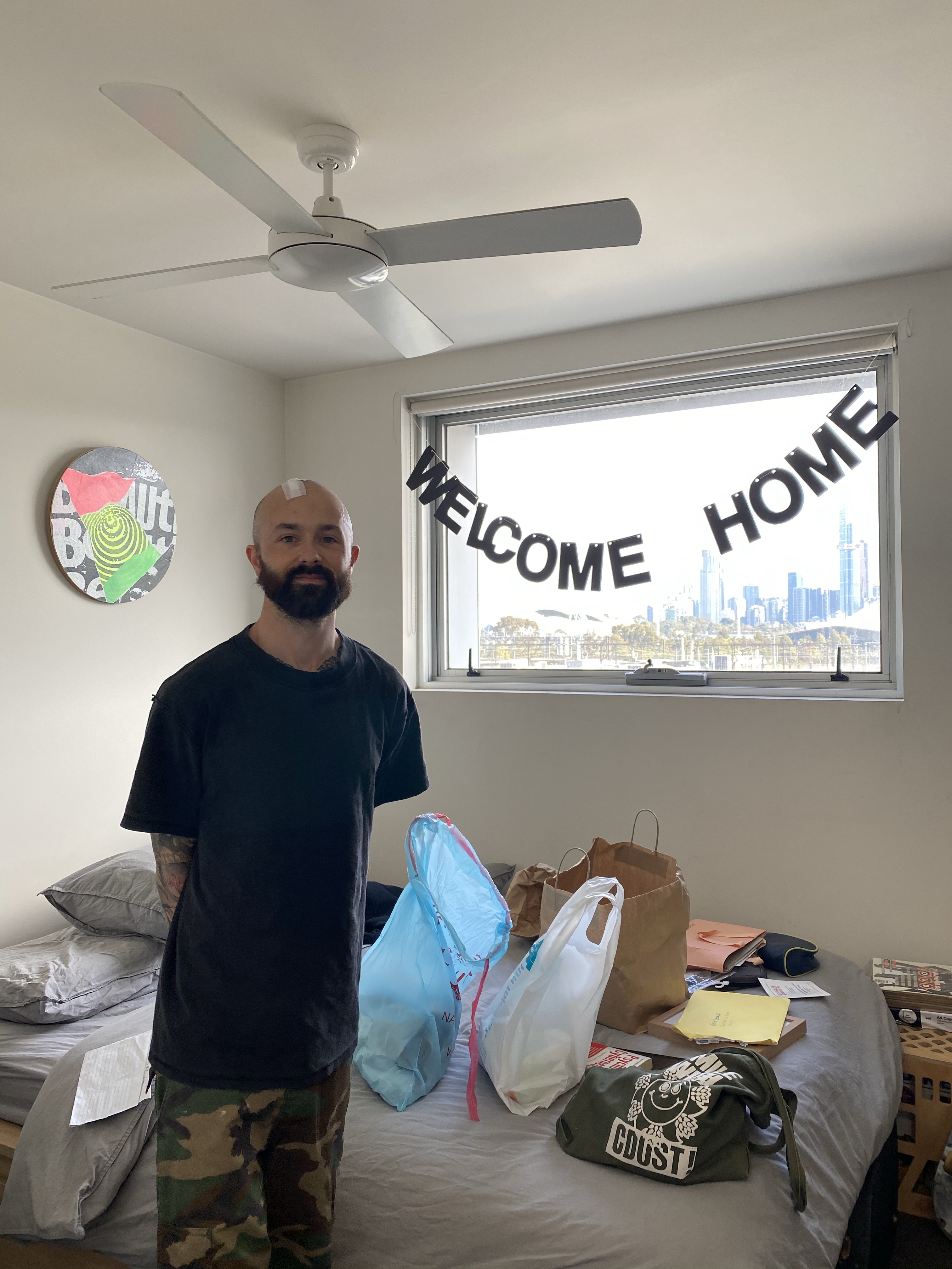 When I returned him to his home, Georgia and Josh his flat mates, had put up a welcome home sign in his room. His first stop was the balcony to soak up the sun in his ‘lizard’ chair. He was so relieved to be outside. He kept comparing it to being in prison for a long time and how weird it seemed to be in the world again.