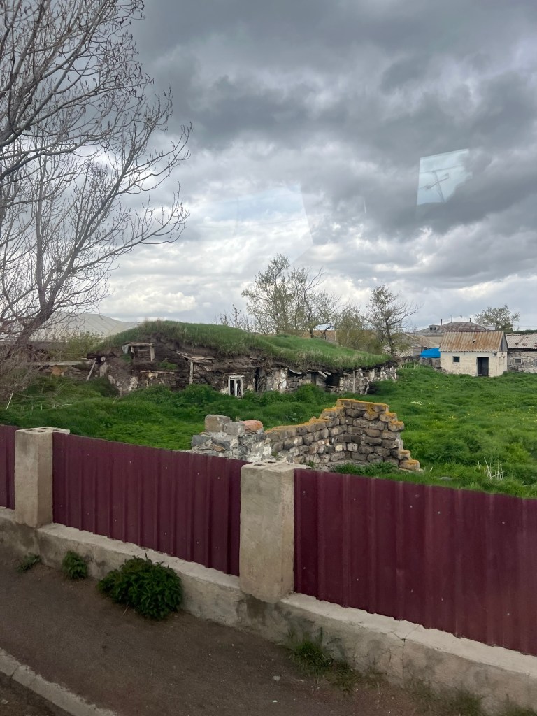 We crossed the border at Bavra. A windswept barren looking place but a major crossing point for trucks etc. We said goodbye to Ani our wonderful guide in Armenia. We met our new guide Nino (woman) and entered Georgia passing through very poor hamlets of farms with houses that had grass for roofs. A Soviet thing apparently.