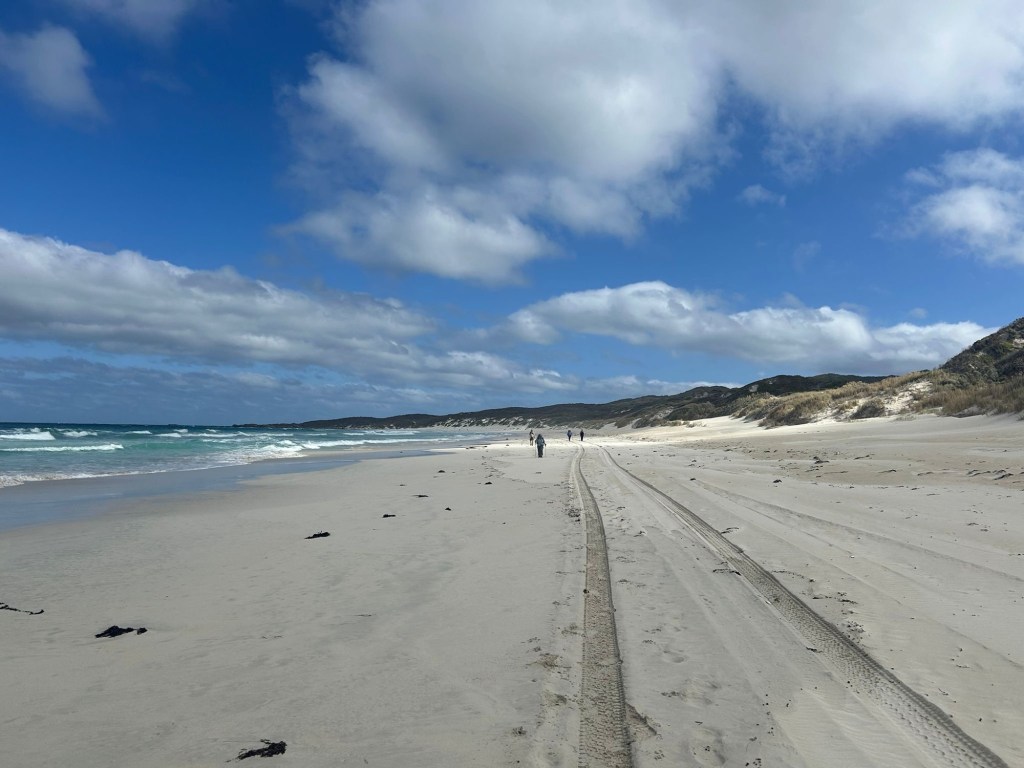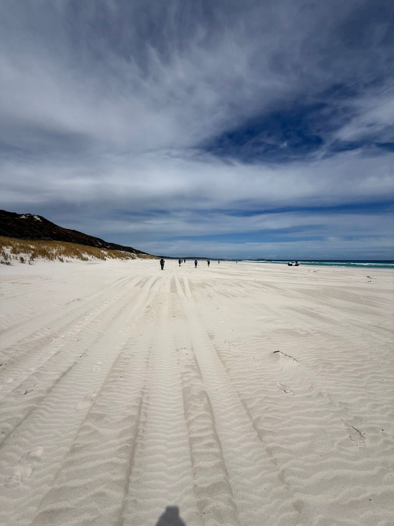 This was the leg tiring slog we imagined. The sand is soft and even by the waters edge it barely gets hard. We tried walking in the 4WD tracks or other footprints. None really made it easy.