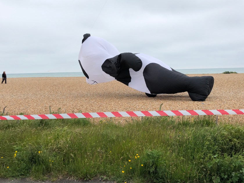 This wild flower garden on the shore was so picturesque. We passed a kite event where all sorts of shapes are being put into the air. Lots of kids are trying their hands at flying kites. The stiff breeze is filling the larger kites and getting them airborne. We were amused by the flapping of the legs of the large panda. He seemed to be running on his toes.