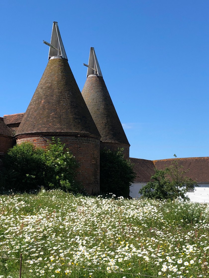 Although the garden is classically designed in squares or rooms, the planting is exuberant and lush with such a mixture of textures and flowers that it is a feast for the senses. Sissinghurst is also a working farm with cattle, sheep and pigs as well as home to rare species of wild flowers, insects and birds but we didn’t have time to walk around the fields as well. They have preserved the Oast houses that were used to dry hops. There are many of them in Kent and at Sissinghurst they are surrounded by wild daisies. My Australian roots surfaced when I saw the long grass and wild flowers. Good place for snakes!
