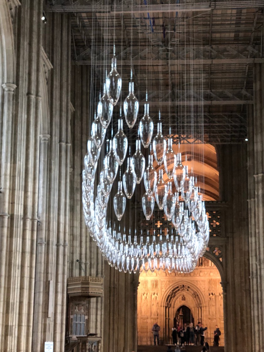 The installation of 100 clear glass amphorae, Boat of remembrance, commemorates 100 Years since 1918 and is a memorial for the people of all nationalities who died in the First World War. It also draws on the idea in Christianity that the Church is a place of sanctuary. The word nave comes from the Latin word for ship, navis.