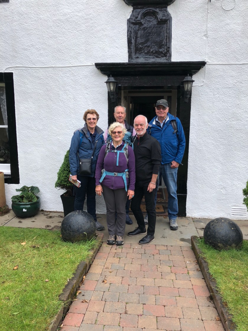With Allen injured Paul decides to take a different descent across the alpine meadows for which we are all grateful. A 5 km slog over steep rocks would be miserable! The ground is boggy and spongy to walk across so it is a test for ankles but easy underfoot. Allen starts to fall behind so Paul rings for a car to meet us at the bottom. It is slow going and by the time we get to the bottom we are an hour late. Allen is collected( wish we were too) and we meet the others for the last stage. Now we are walking through cows, sheep, and even horses through paddocks and over stiles- about 8. Having to climb some was a real effortbecause everyone is tired. Shap still seems a long way off! We pass the ruins of Shap abbey built around12 th Century. Finally at 6 pm we arrived at The Kings Arms Hotel.