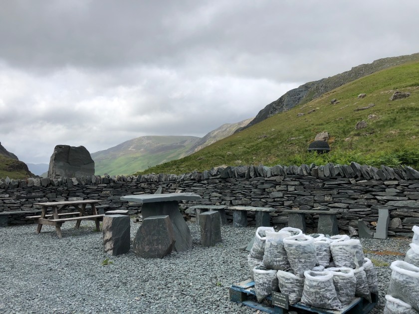 From the top we walked across alpine type grass to then descend. On the far hill was the Hontess slate mine and at the foot of our mountain they have a slate mill and shop for tourists, and a cafe! It was a very steep descent again and Kathy the retired Maths teacher took a tumble on the grass, jarring her shoulder. We were all impressed with the slate products, even slate art was quite fabulous. From this point the walk into Stonethwaite was about five kilometres but some was very rugged and at one point a chain was fixed to the rock wall to help you avoid slipping into the river.