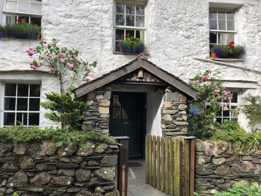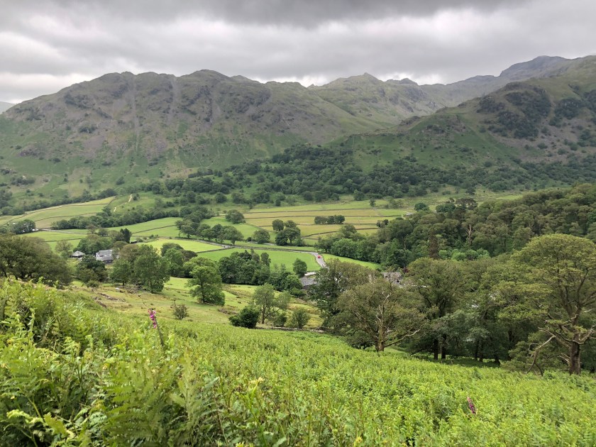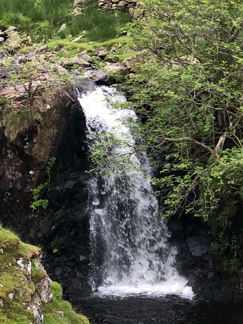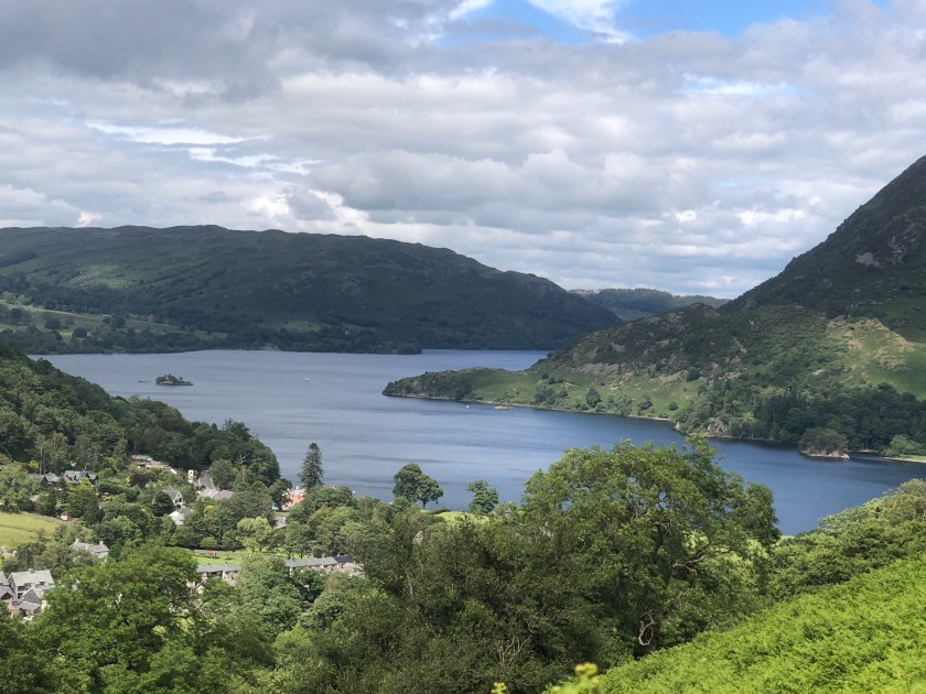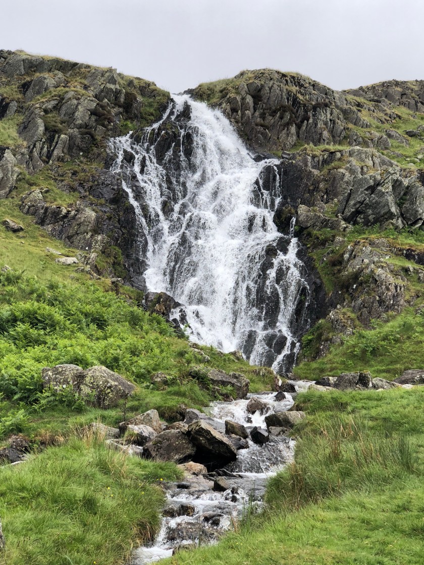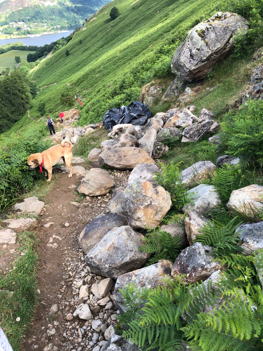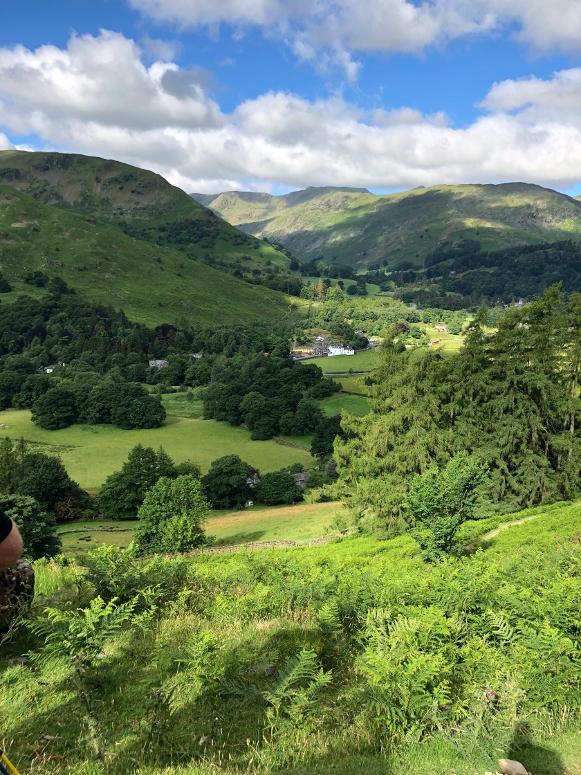 The path is shorter today but just as steep and rocky. We were going to climb Hellvellyn but the clouds rolled in and it got colder and there was no chance of seeing the view for the effort it would take. We took the way down to Patterdale ( with some relief as we are all a bit tired from the first few days efforts) that ended in a beautiful view over the town and lake. The lake was blue! The sun had come out. This town was obliterated by a flood recently and seeing the force of water from the last few days I can understand how it happened. They are building a high wall along the banks now to protect the town.