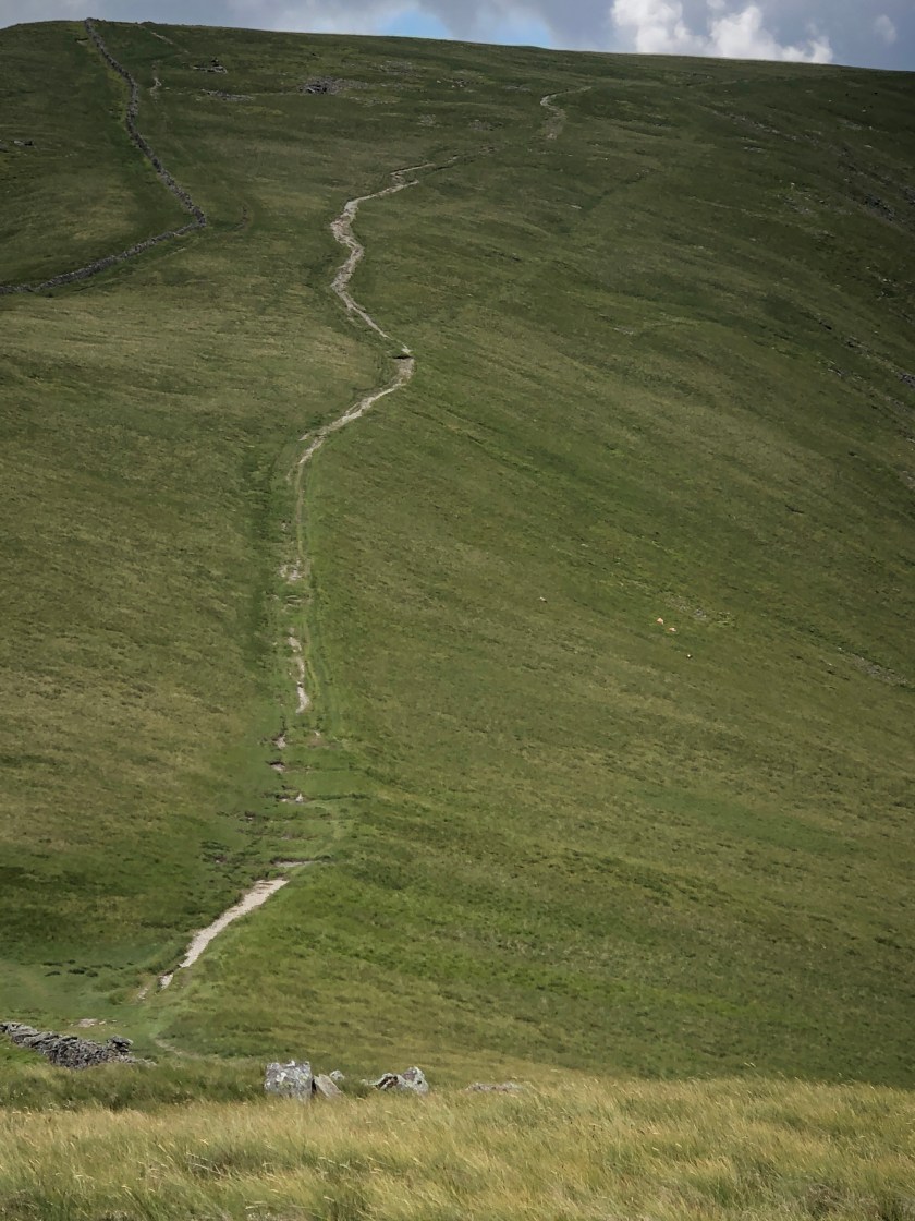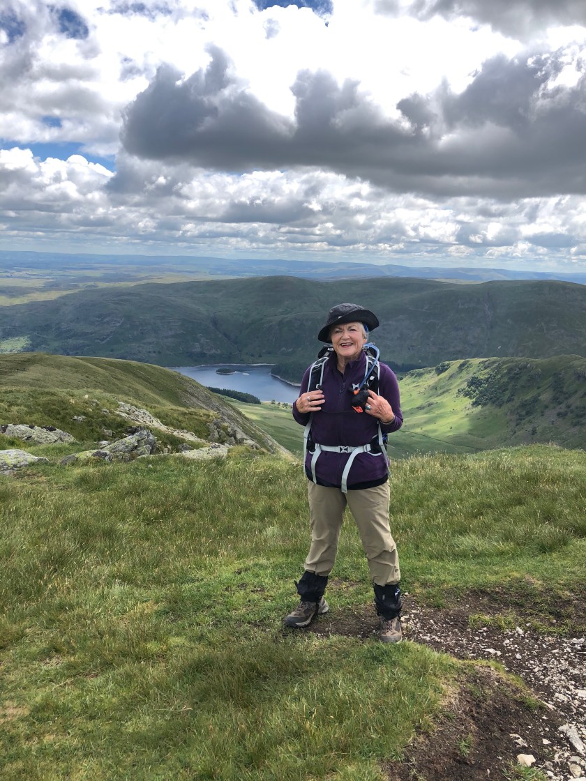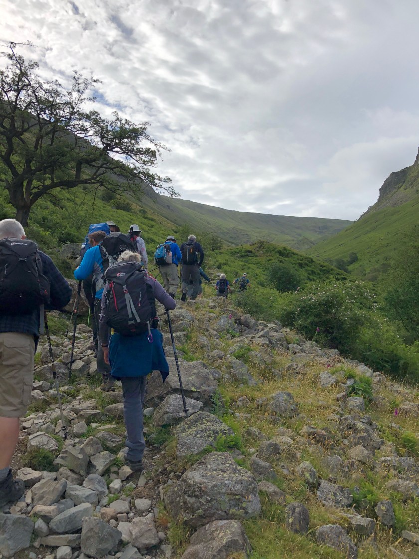 Woke to a glorious sunny day. They do have them! Our B&B was very good, efficient, well organised and spotless and she made great breakfasts too. Today is the shortest day of the year- summer solstice but one of our longest walking days. We have a 9 hour walk ahead of us. We are walking up to Kidsty Pike(2559 feet) and High Raise (2631 feet) which mark the edge of the Lakes district. The going will be steep and the descent long so a few of the group have opted to spend the day doing alternative activities such as taking the oldest steam driven ferry in working order across Uldswater and back, then catching a taxi to meet us for a flat five miles walk to Shap. Moria was still struggling with her cold, Lyn was anxious about the descent ( that it the guide book looks straight down!) Dennis and Stuart wanted to see something different.