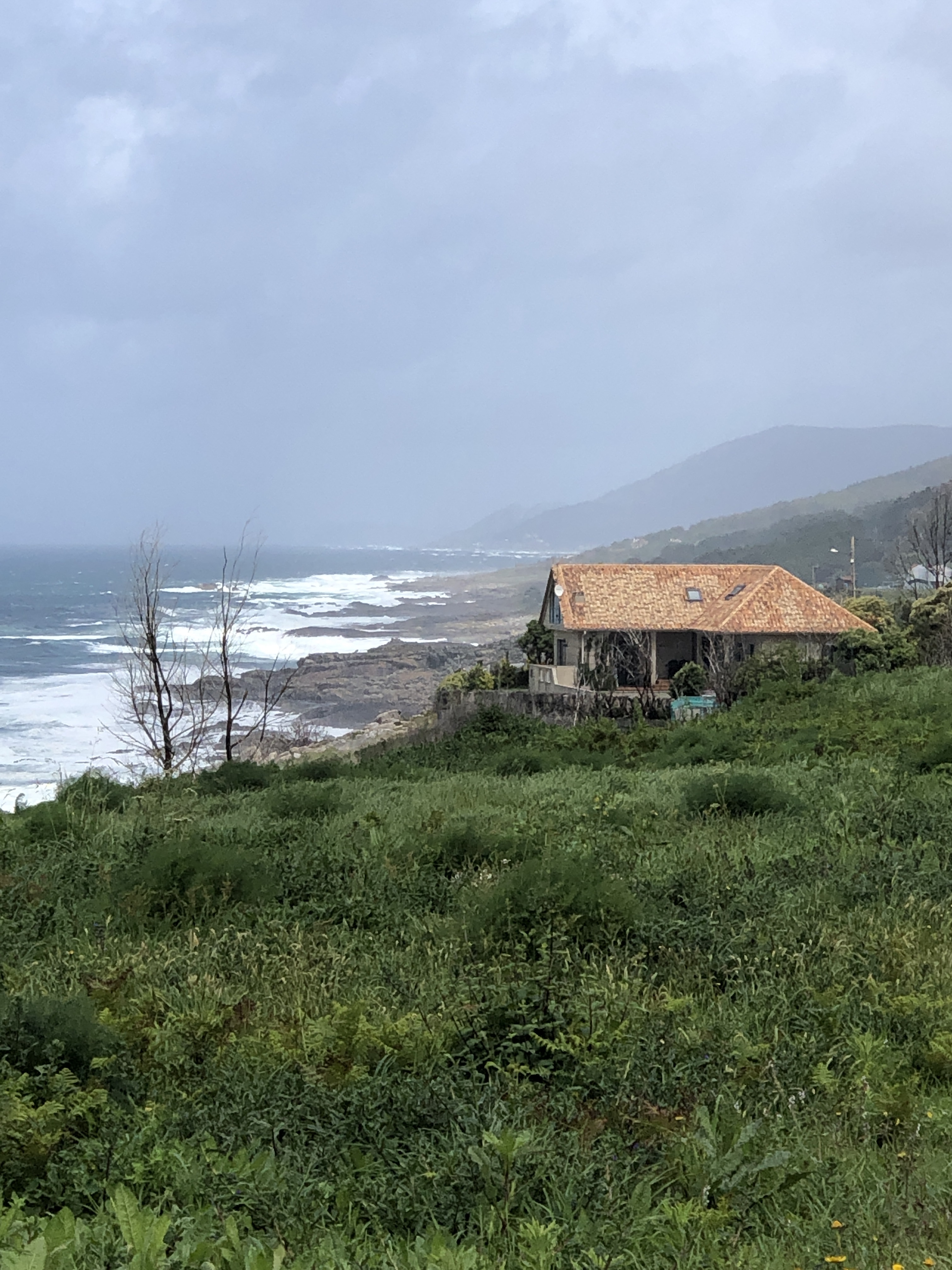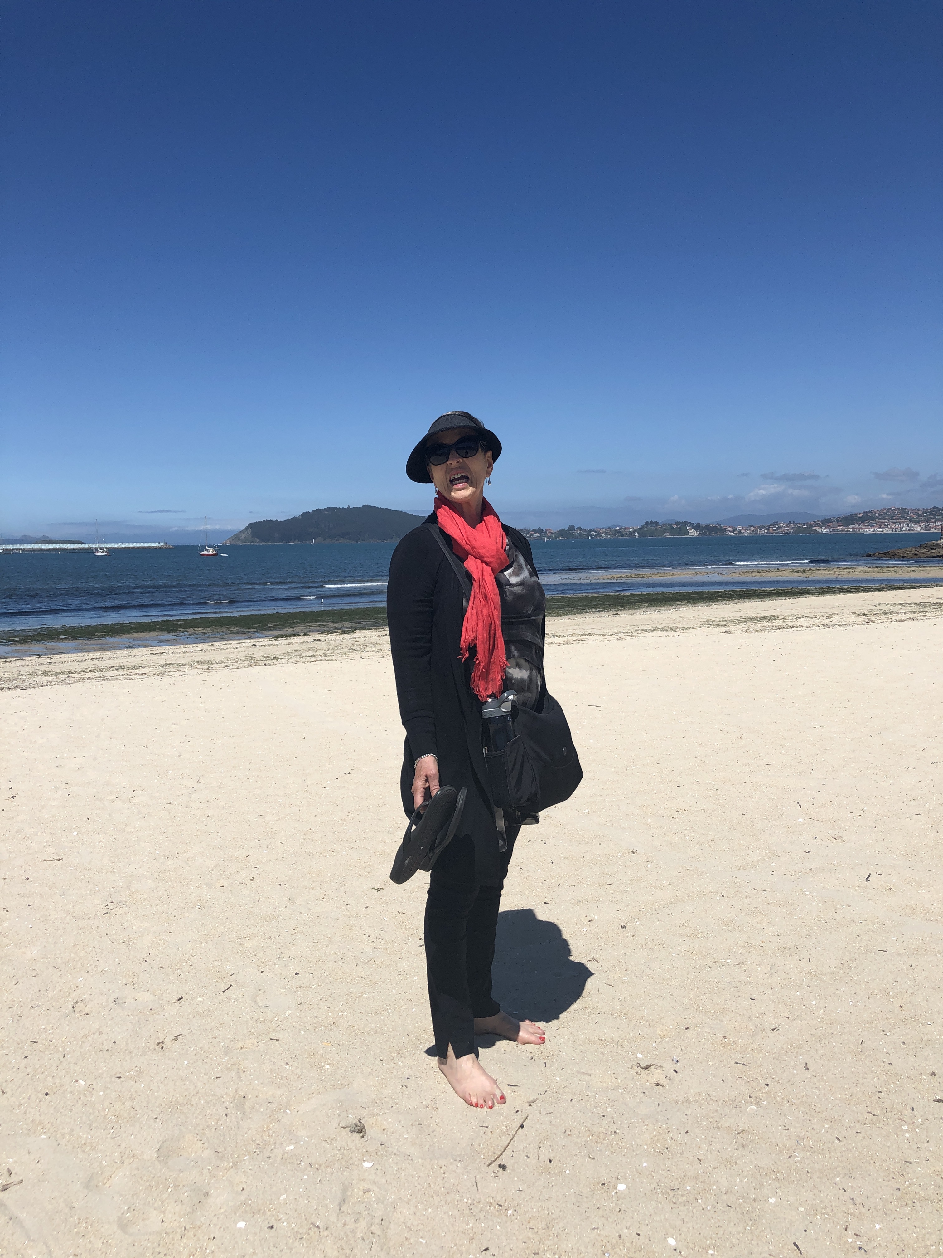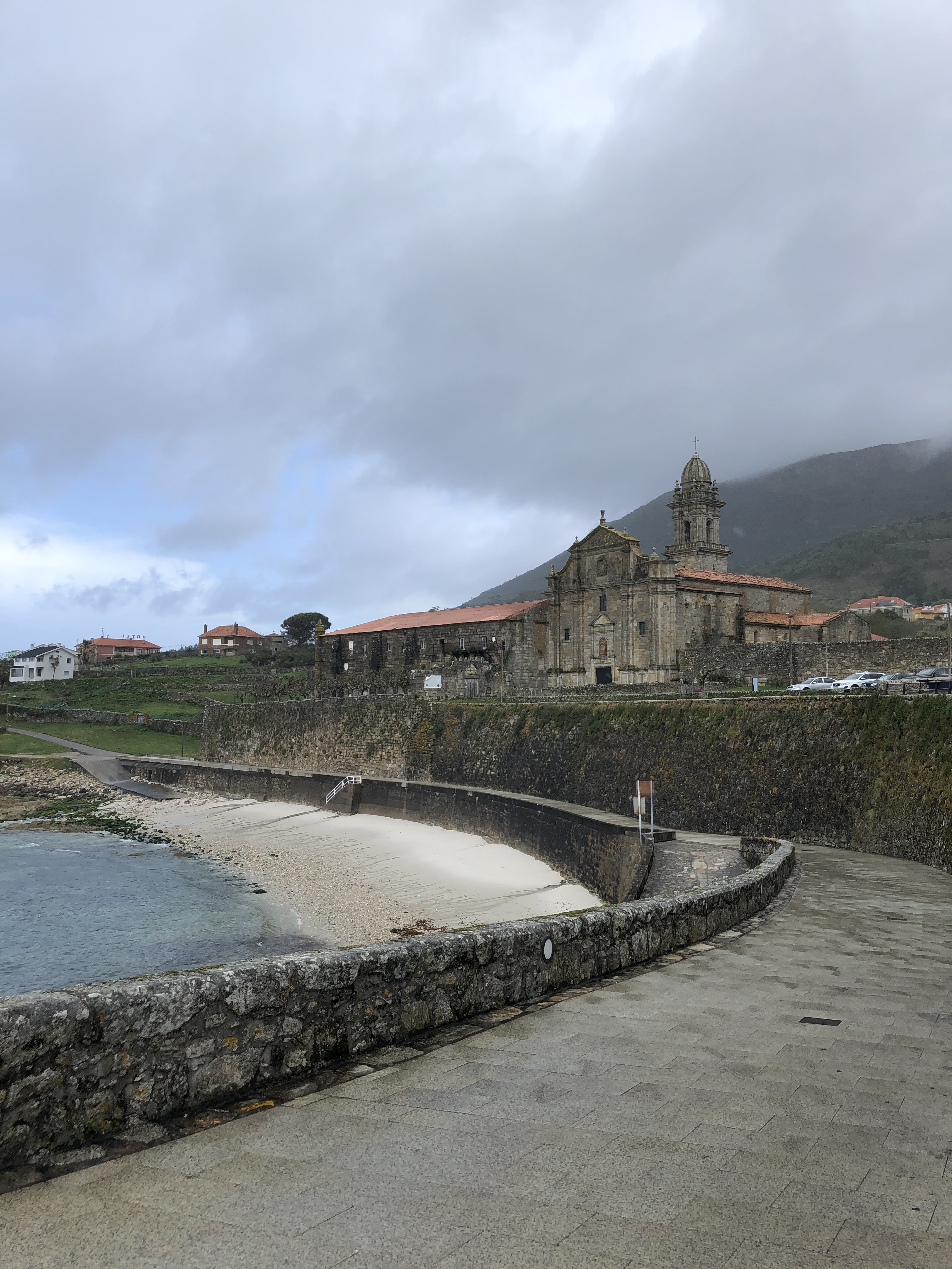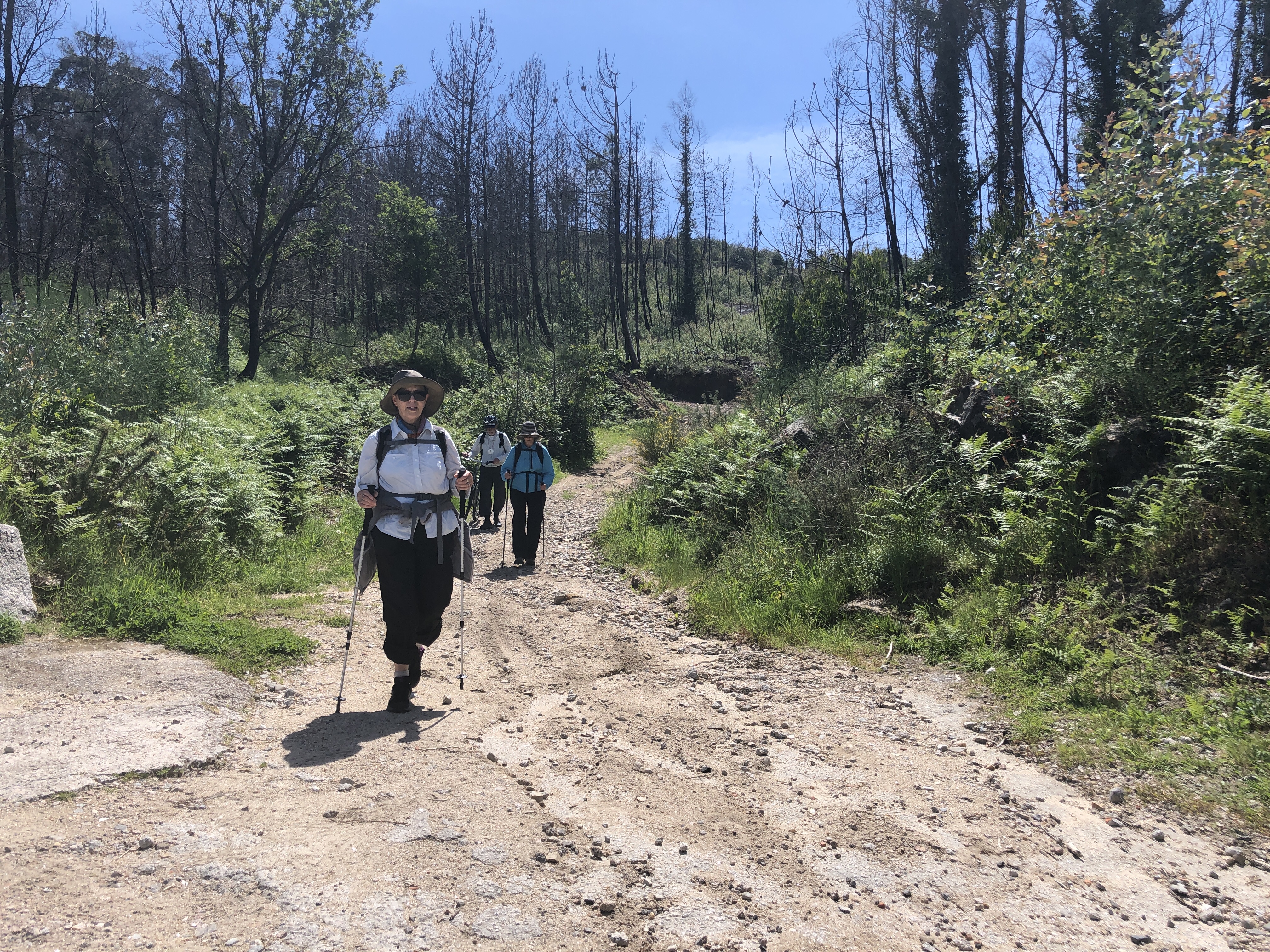 More rain then blazing sunshine. After very clear markings we lost the arrows but continued towards the beach. As we emerged from our street we saw a whole posse of pilgrims stream past. We wondered what route they had taken because we haven’t seen any for at least 15 minutes. These were in fact a new group we think started in A Guarda, perhaps a parish pilgrimage. They were of all ages and in high spirits and crowded the path. Anne and I took to the road to pass them but the group engulfed Irene and in her attempt to get out of the group she slipped on wet boardwalk and tumbled down, grazing her arm. We all eventually overtook them and looking back they seemed like a group of zombies after us!