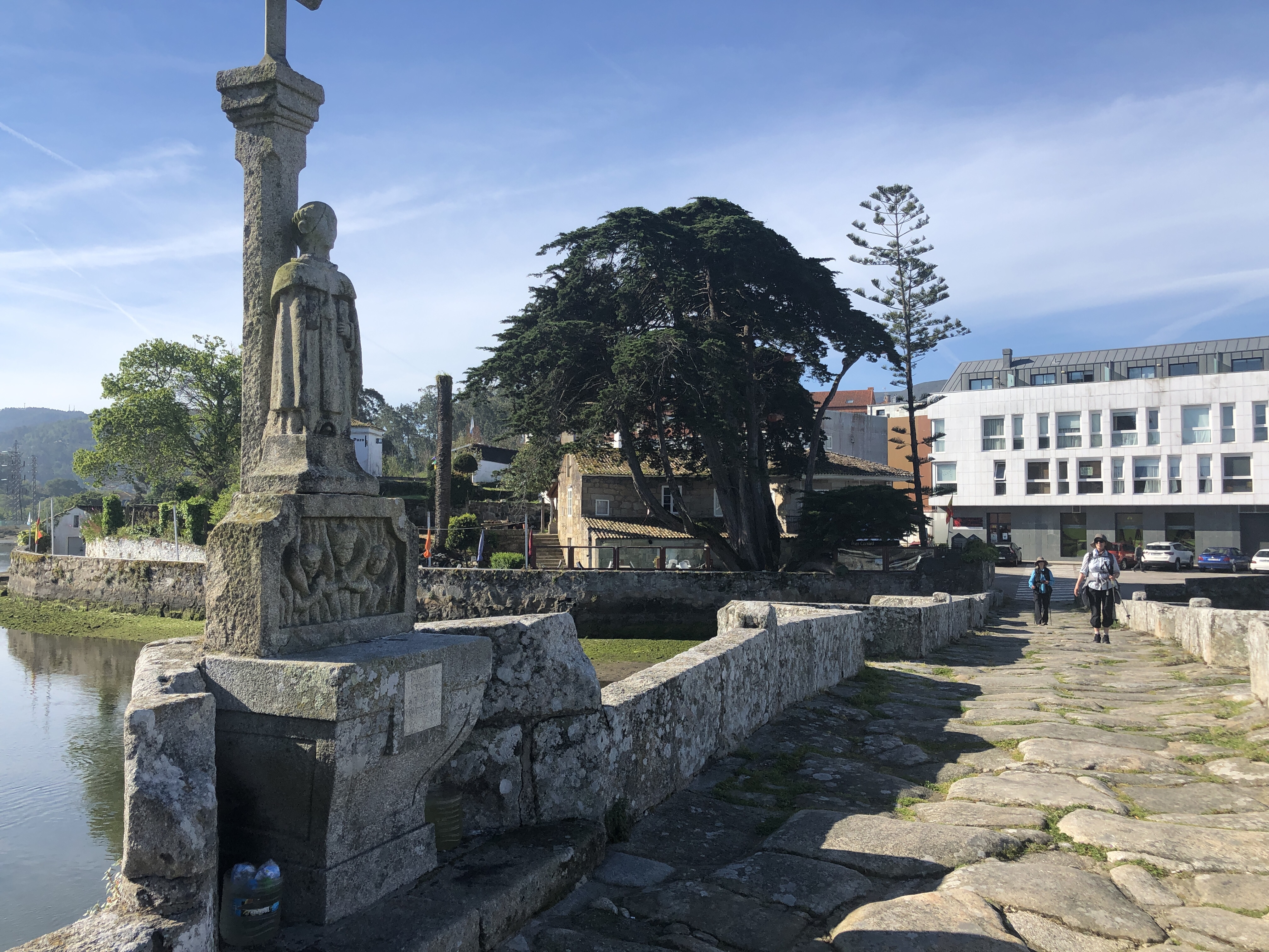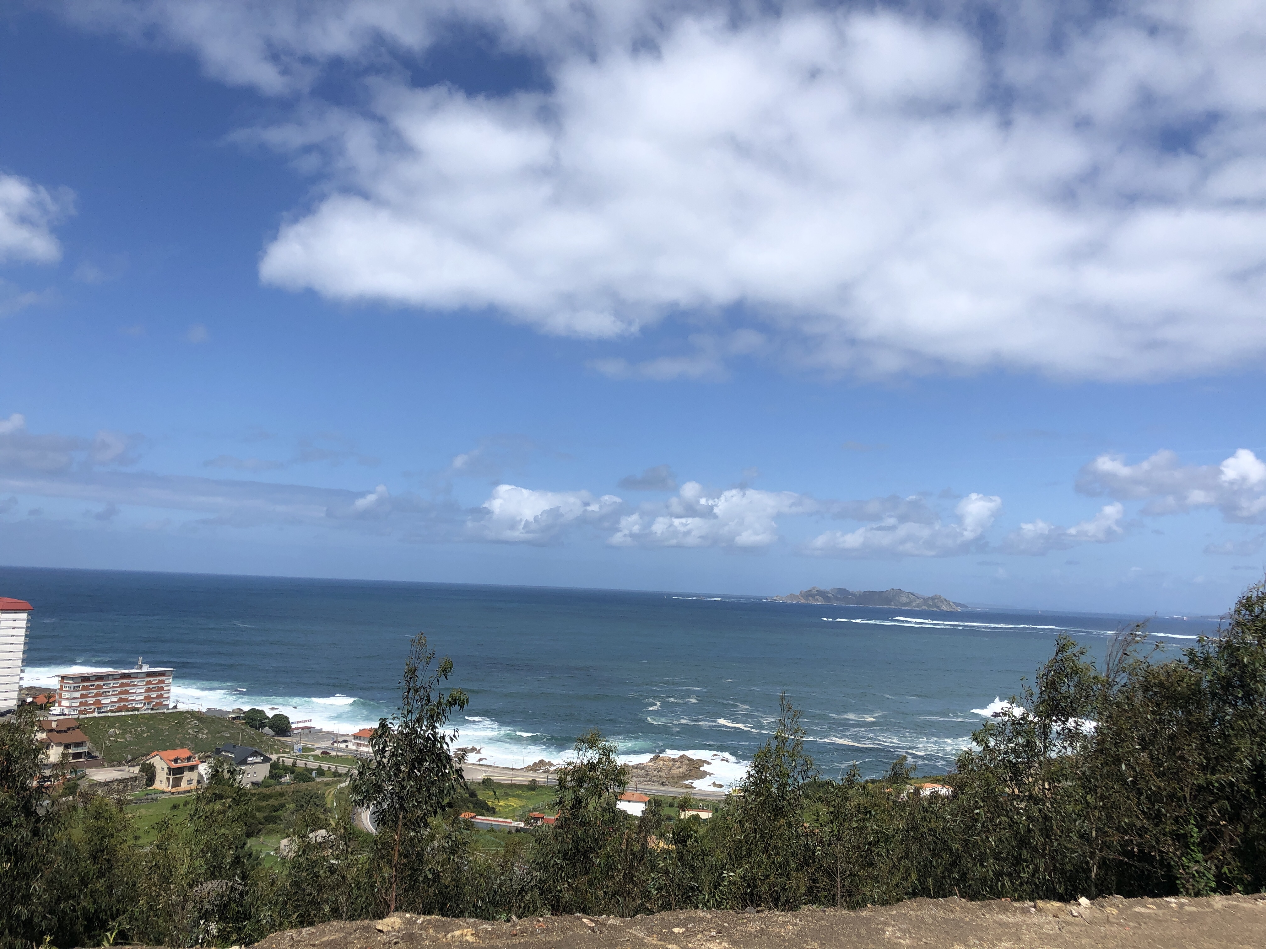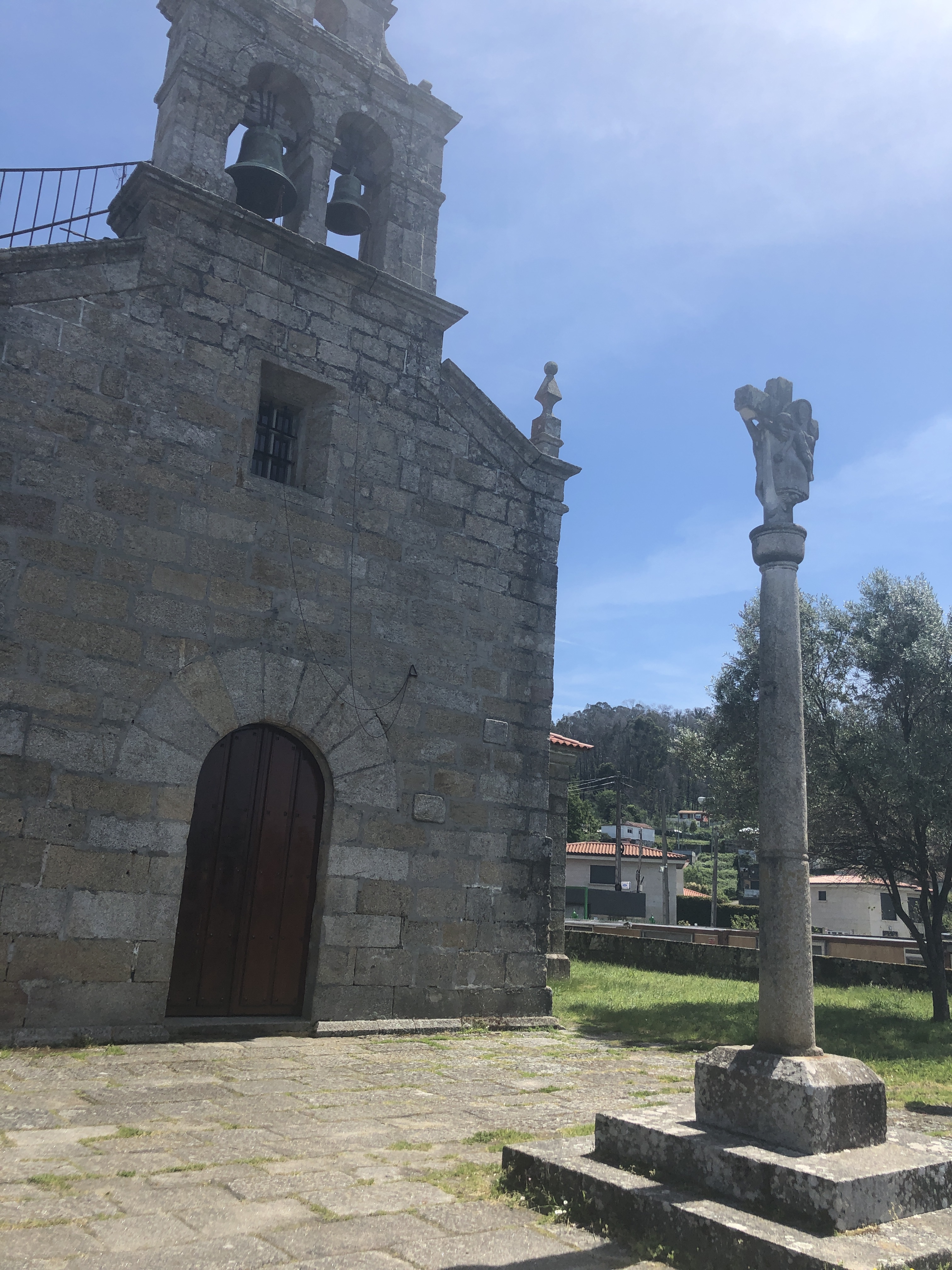The walk out of Vigo was uphill as most pilgrimages are and we soon found ourselves in a road above Vigo, able to see down into the river most of the way. I keep thinking it is a harbour but it is actually the Rio Vigo estuary and it is very wide ( 7 km at its widest) and extends 35 kms north east. It is famous for boating, fishing and shell fishing. We saw lots of oyster farms or mussel farms all around the estuary. It had the most mesmerising blue, especially today because we had a perfect walking day. Blue skies and sunshine, but not more than low 20s in temperature and as well, quite a bit of forest shade too.