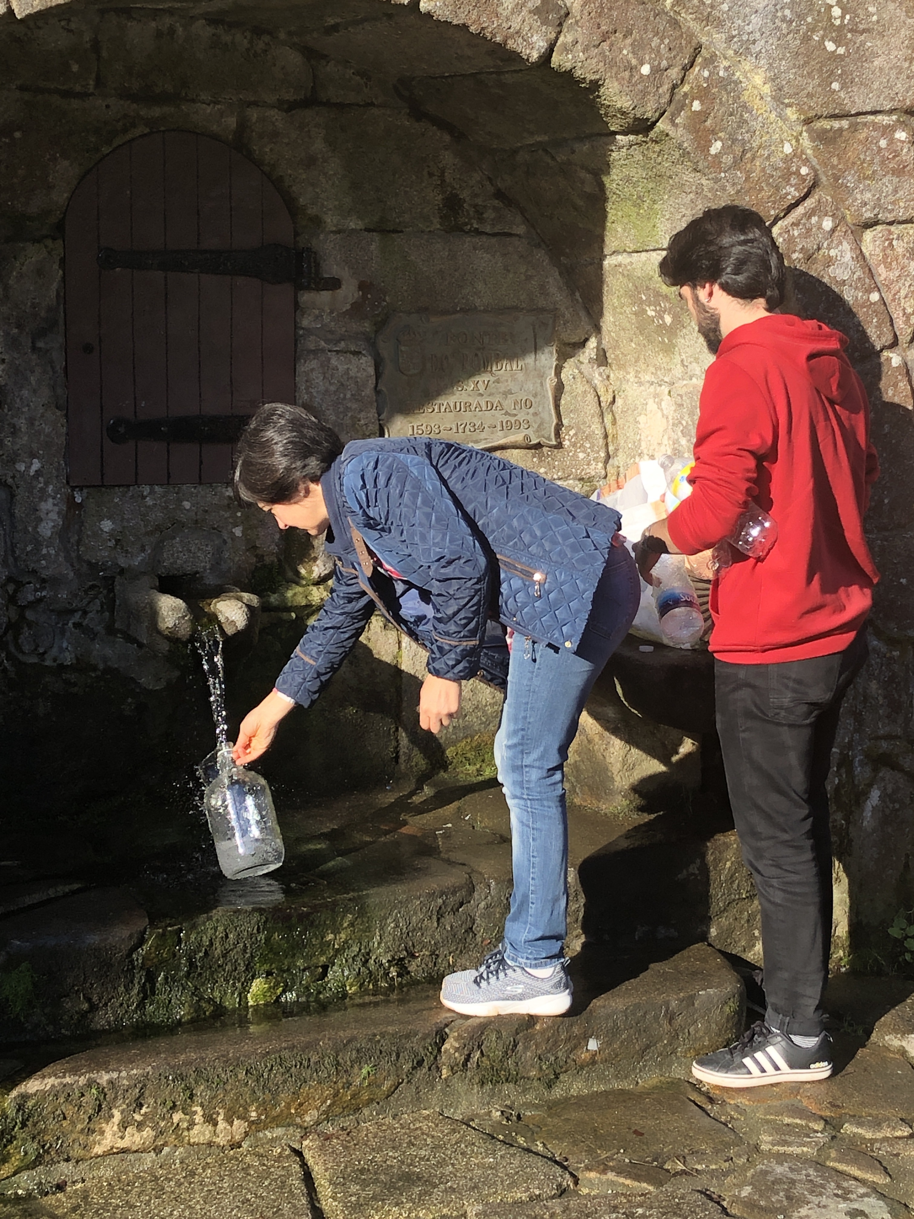 The walk out of Vigo was uphill as most pilgrimages are and we soon found ourselves in a road above Vigo, able to see down into the river most of the way. I keep thinking it is a harbour but it is actually the Rio Vigo estuary and it is very wide ( 7 km at its widest) and extends 35 kms north east. It is famous for boating, fishing and shell fishing. We saw lots of oyster farms or mussel farms all around the estuary. It had the most mesmerising blue, especially today because we had a perfect walking day. Blue skies and sunshine, but not more than low 20s in temperature and as well, quite a bit of forest shade too.