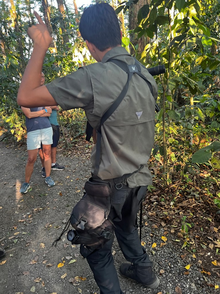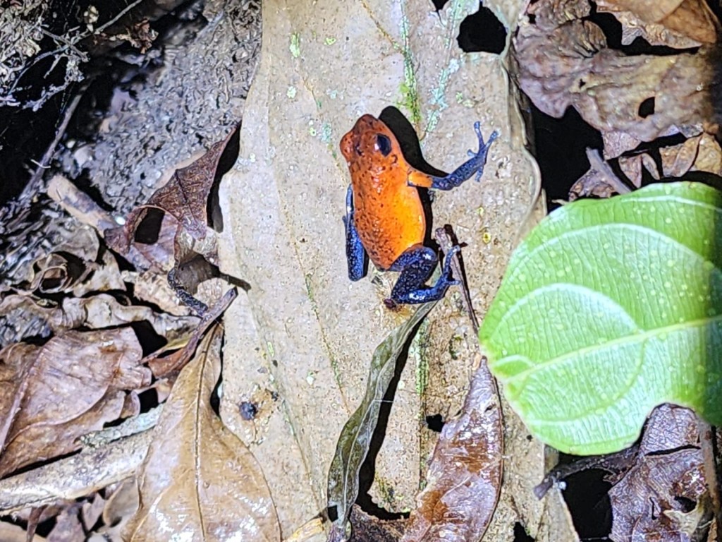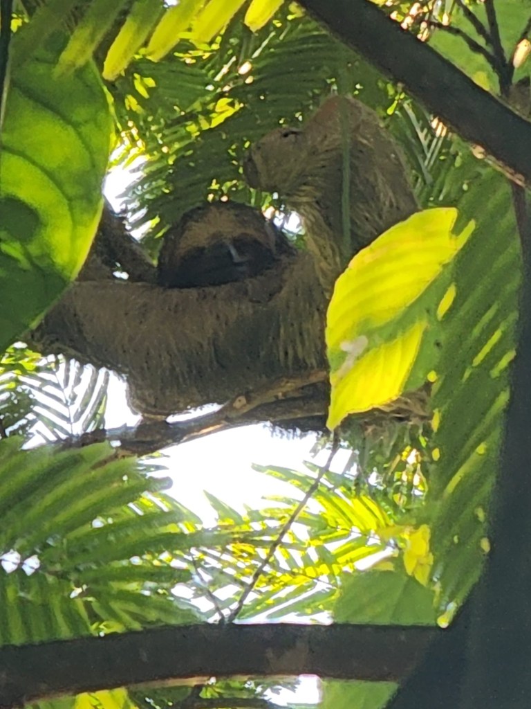 We had time to visit the Sloth Park. Our original intention was to do a self guided walk but Ronny organised a special price and so we had a guide. He was a young guy full of enthusiasm with sharp eyes and a spotter scope. Without him we would have seen nothing. Sloth are asleep very high in the trees and so are hard to discern. Our guide was very excited to see a few animals not always around. We saw a leaf frog( very creepy with red eyes), a poisonous red and blue frog which was only as big as a 50cent piece, wood pecker, owl, vultures and a few I can’t remember. The sloths were exciting to see but they are very hard to spot.