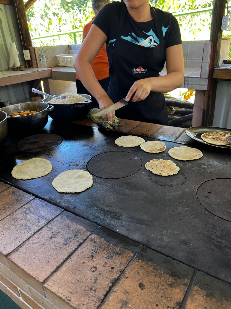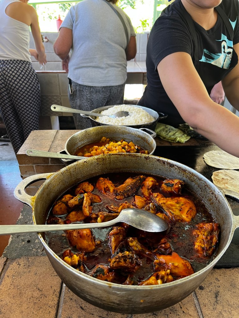 Our teacher had prepared food beforehand and we got to eat it after throwing our tortillas on the stove. It was so hot in the kitchen. Our food was really delicious. Best chicken ever and lots of vegetables.