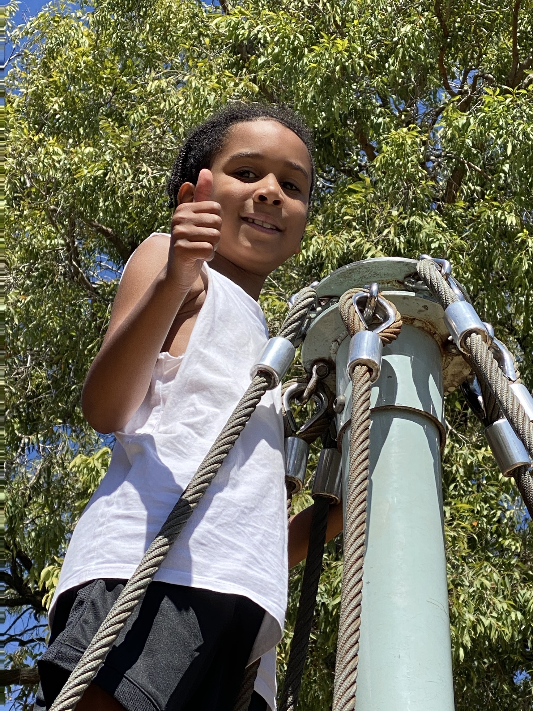 Swinging high by his own effort.