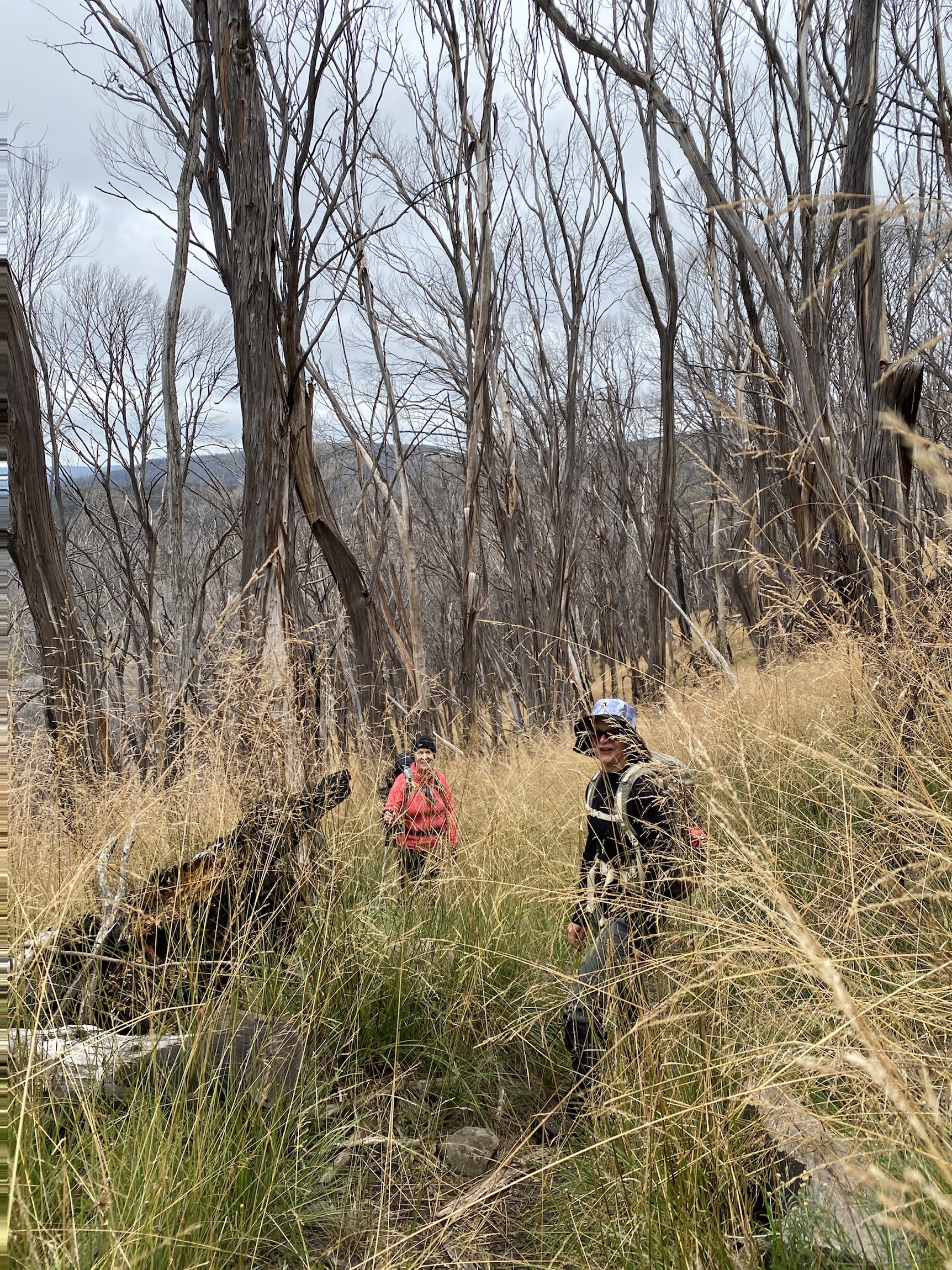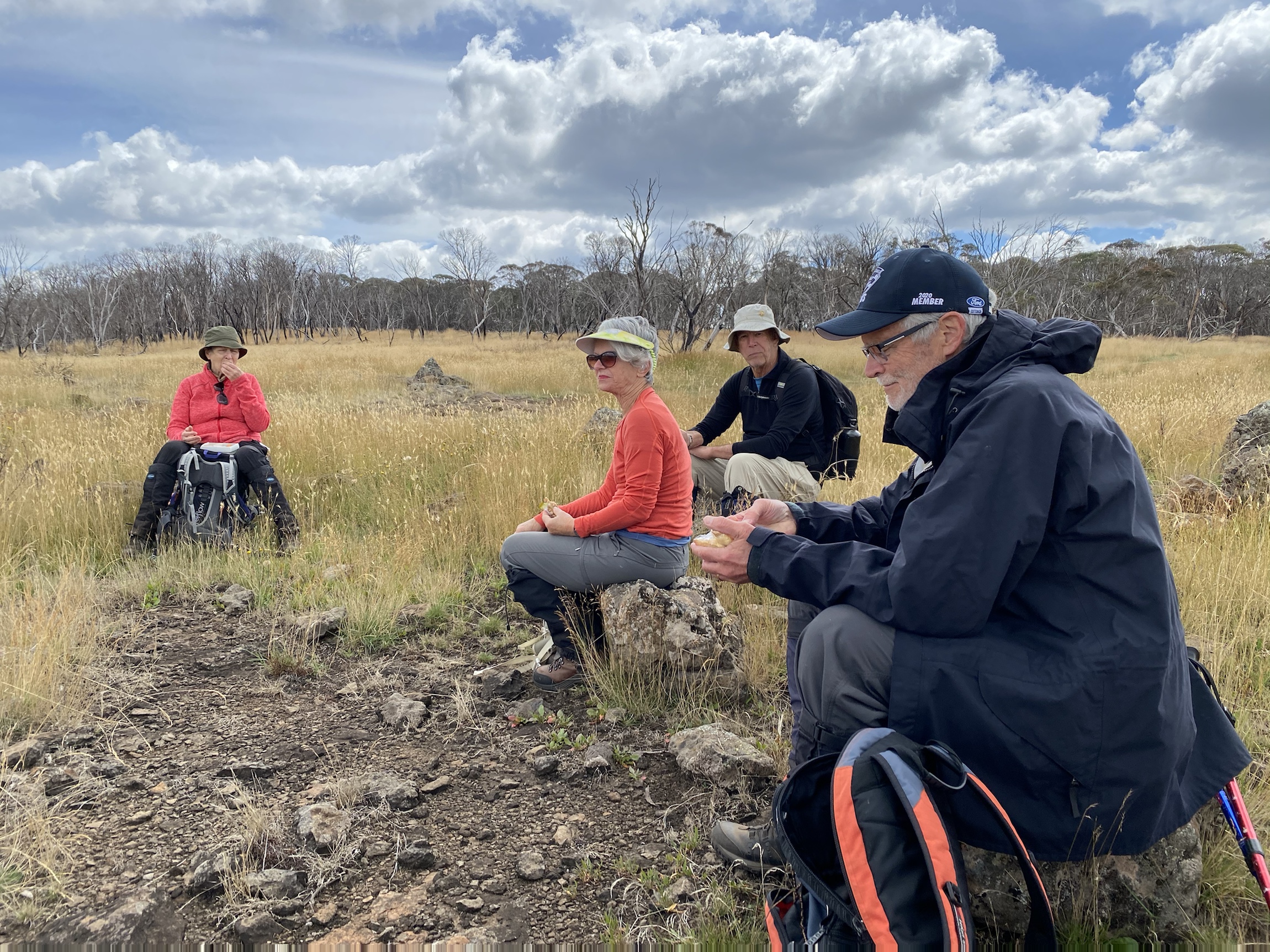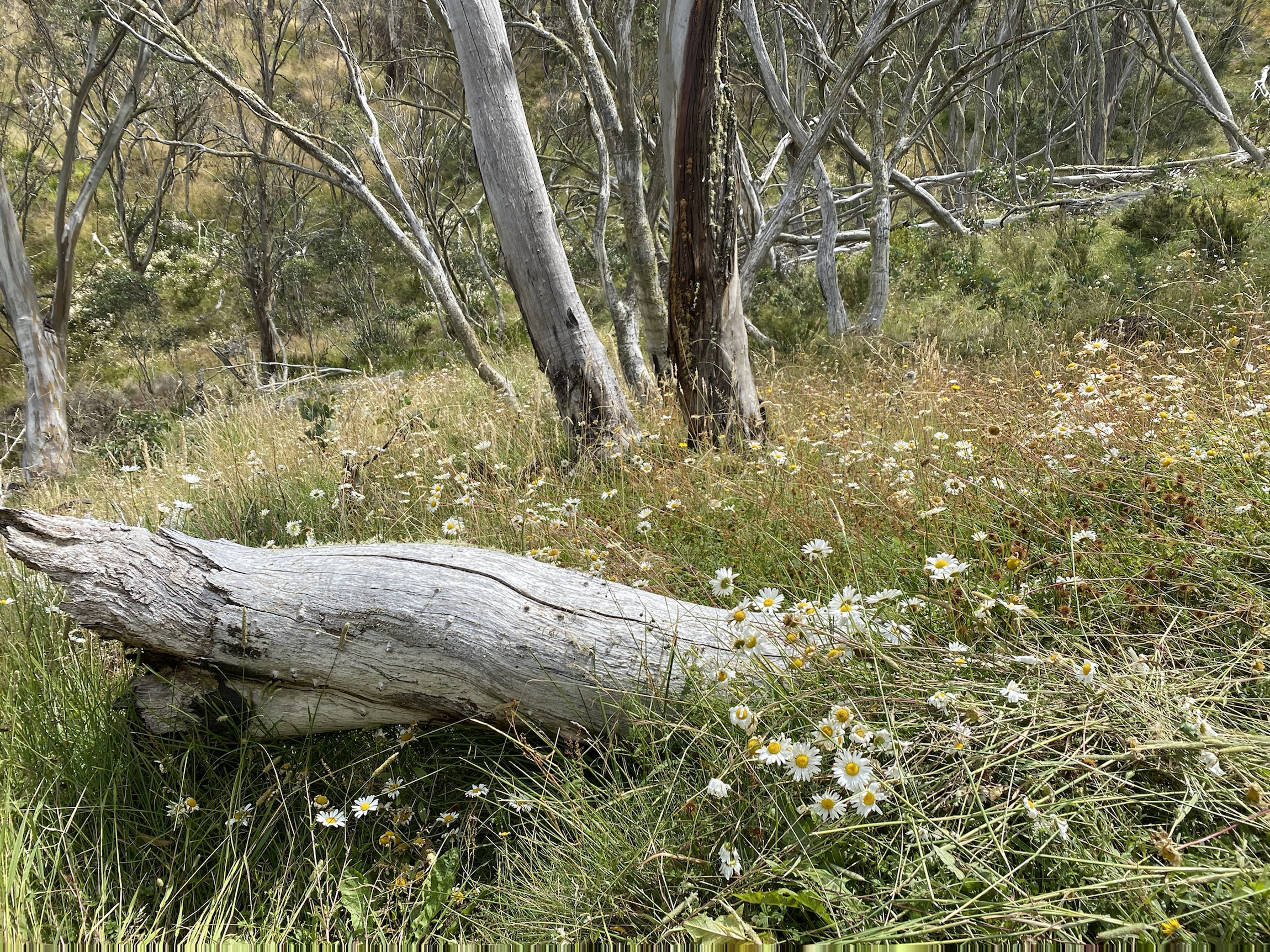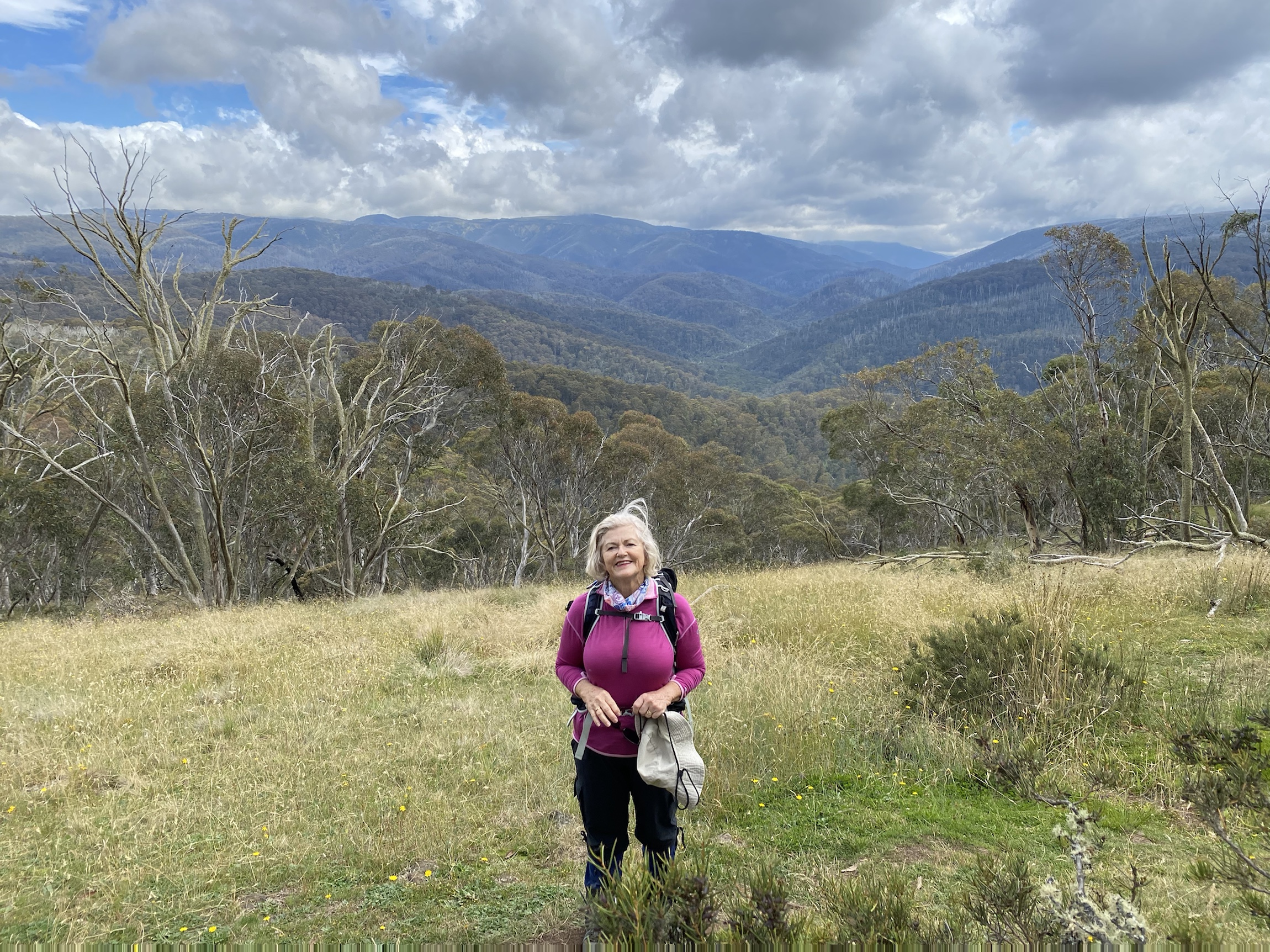 The lifting of restrictions also meant we could take our planned trip to Dinner Plain in the high country. I had booked a lodge for five friends and myself so we could do some bushwalking. We were all so excited to be getting out of the city into some bush. I am very fond of Dinner Plain which is a small mountain village outside the National park and near Mt Hotham. The homes are somewhat controlled in their design so they blend into the environment. It is pretty quiet but the hotel has a couple of spas out the back in the open which we used after our walks. It was so indulgent but worth the relaxing effects on our rusty walking legs. We had planned three dinners in and one out at the hotel to celebrate Bill’s imminent birthday. Everyone cooked delicious meals with a rather strong emphasis on pulses. Consequently some of our walks became very fast jaunts between trees! It was totally delightful to be in such fresh air and the quiet was also soothing. The weather was sunny but the breezes were very cool and on one of the walks my hands were white with cold until I walked for a good half hour. I hadn’t taken a warm enough jacket for maintaining body heat while lunching. The grass on some of the paths was over my head or in my mouth. We were conscious of being alert for snakes because one of the workers at the village had remarked that there had been more snakes around this year. Perhaps another response to fewer humans in the environment during CoVid! I was glad of my gaters after I heard that.