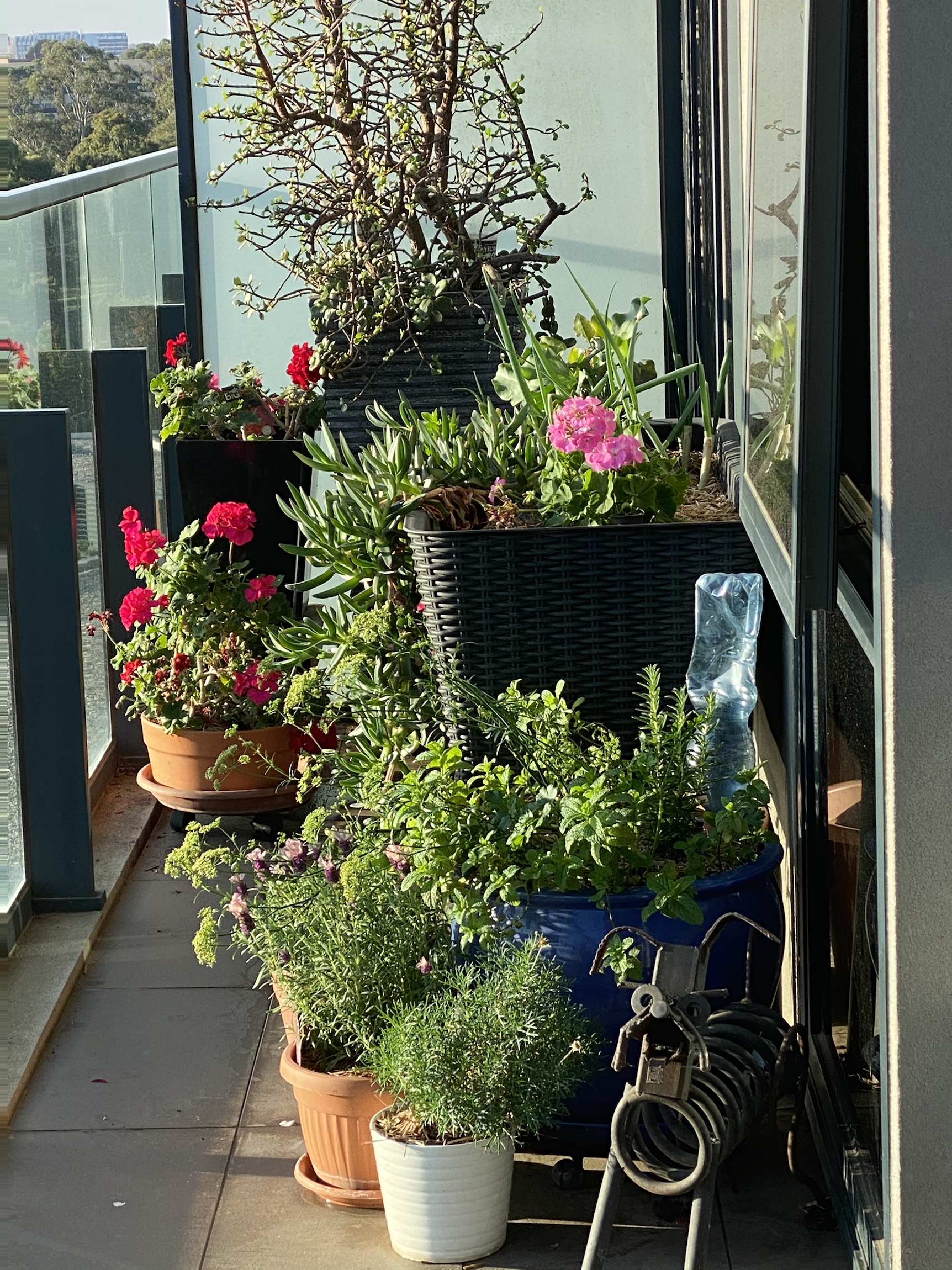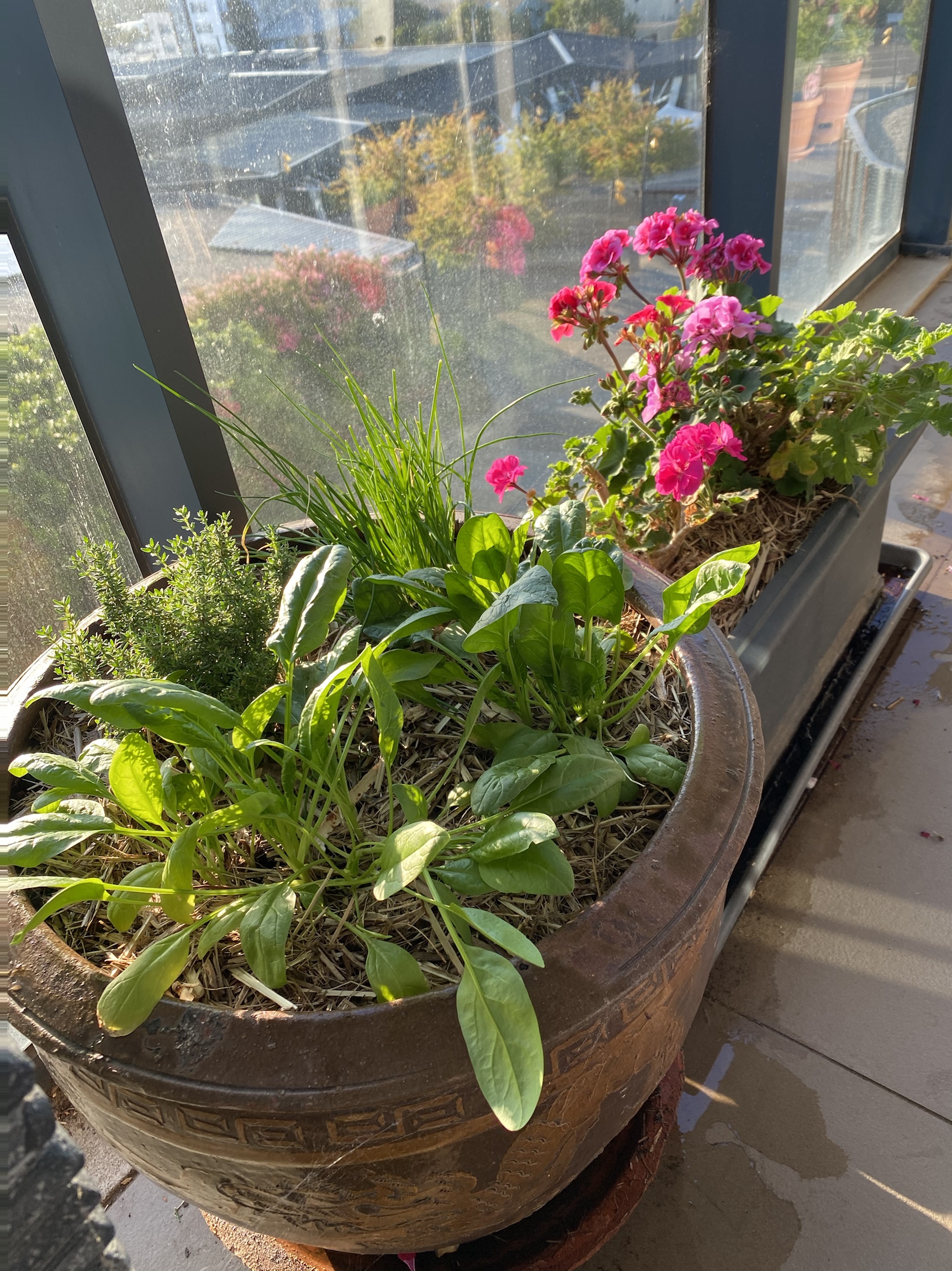 My perpetual spinach, herbs and flowers. I beat the caterpillars for the time being.