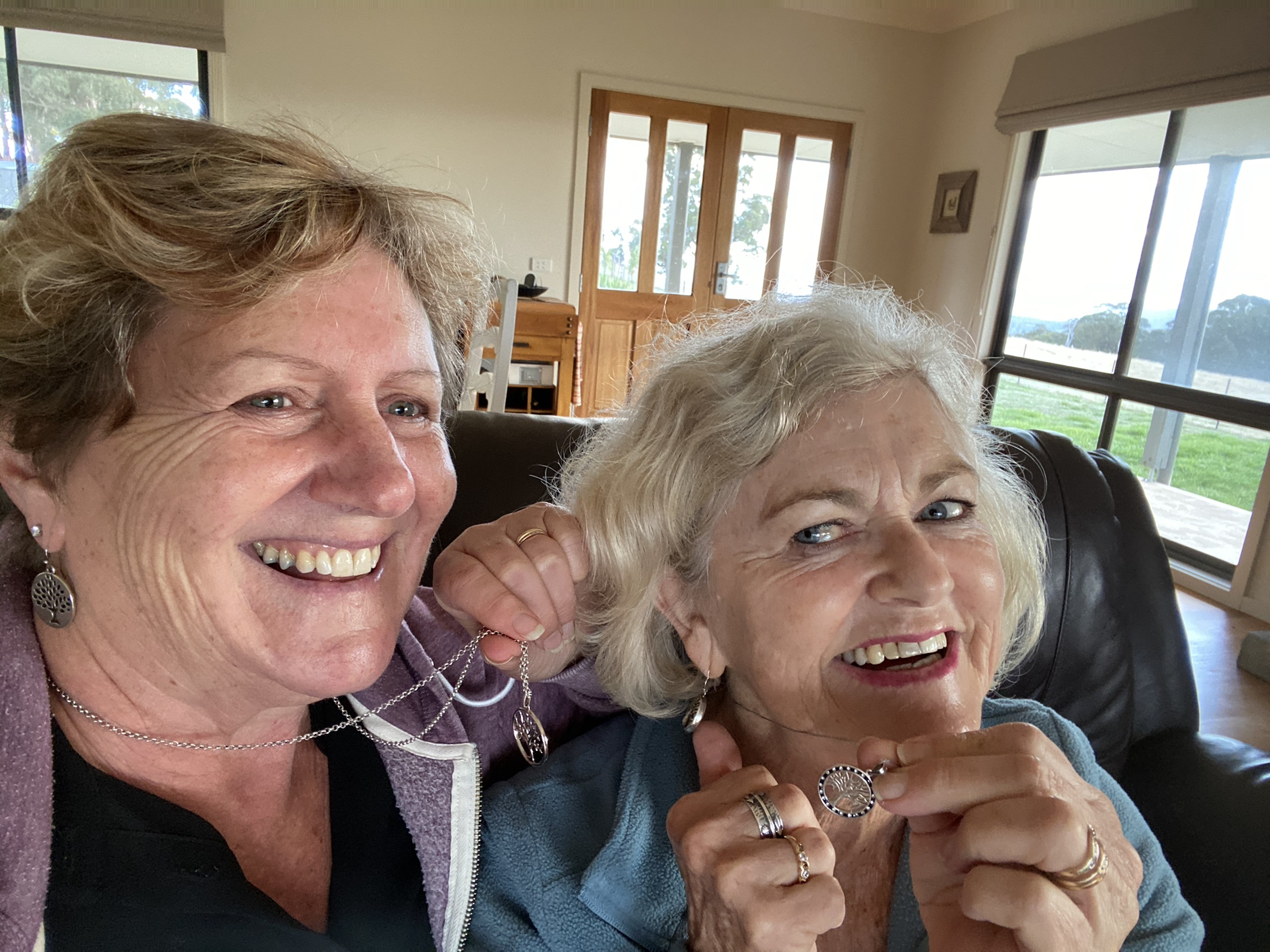 Kangaroos in the paddock, the homestead and studio, alpacas, Scout the black groodle, Pam and I wearing the same symbols on earrings and pendants-the tree of life! Coincidence or soul sisters?