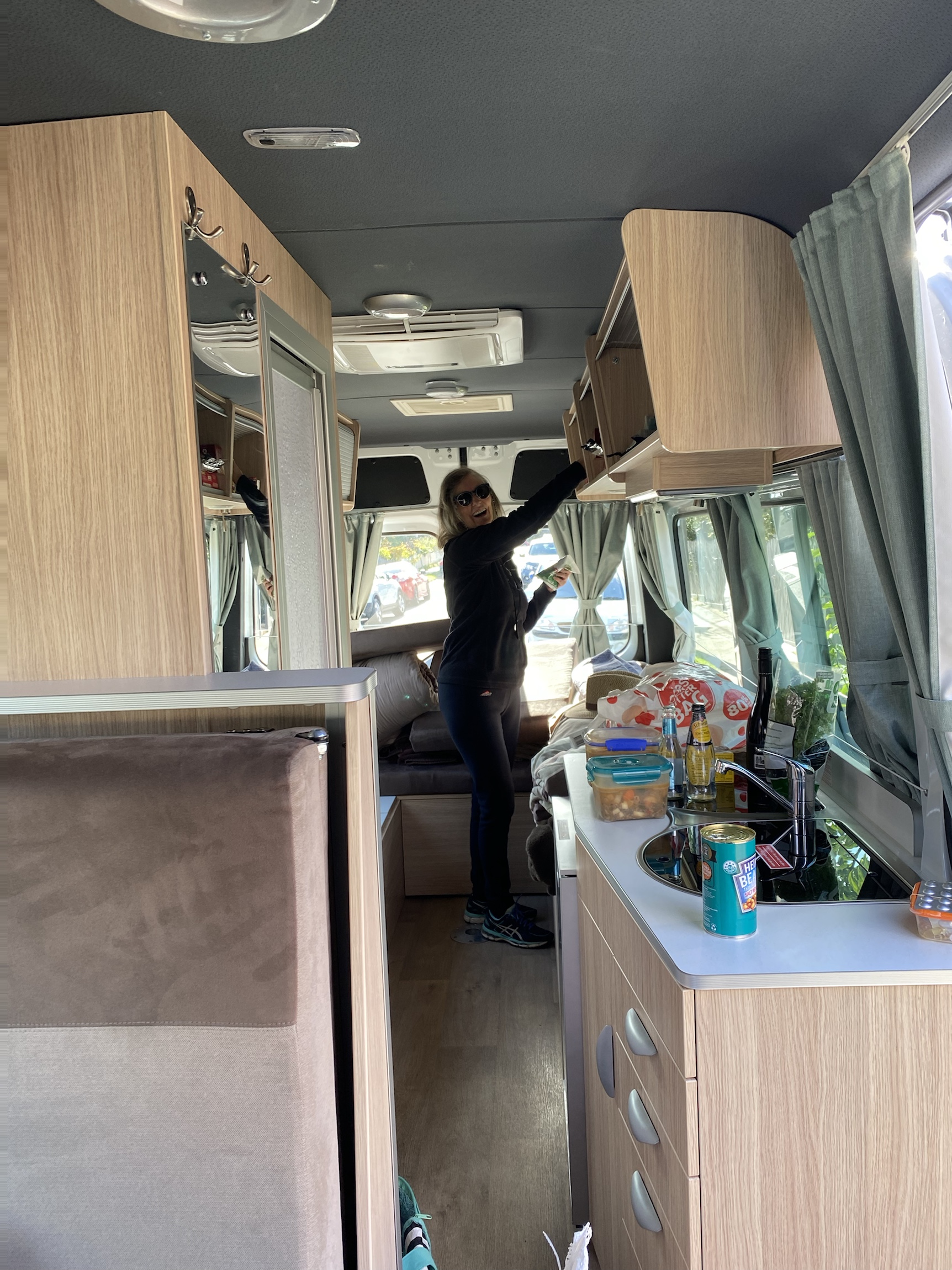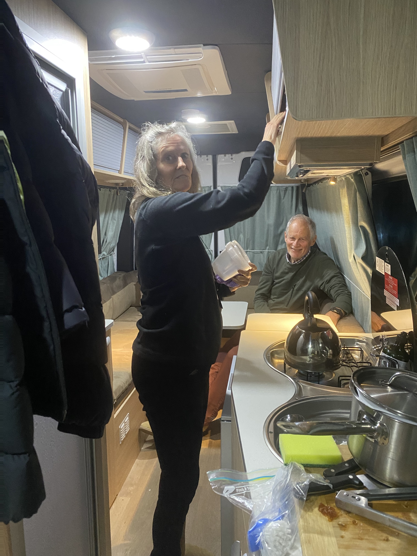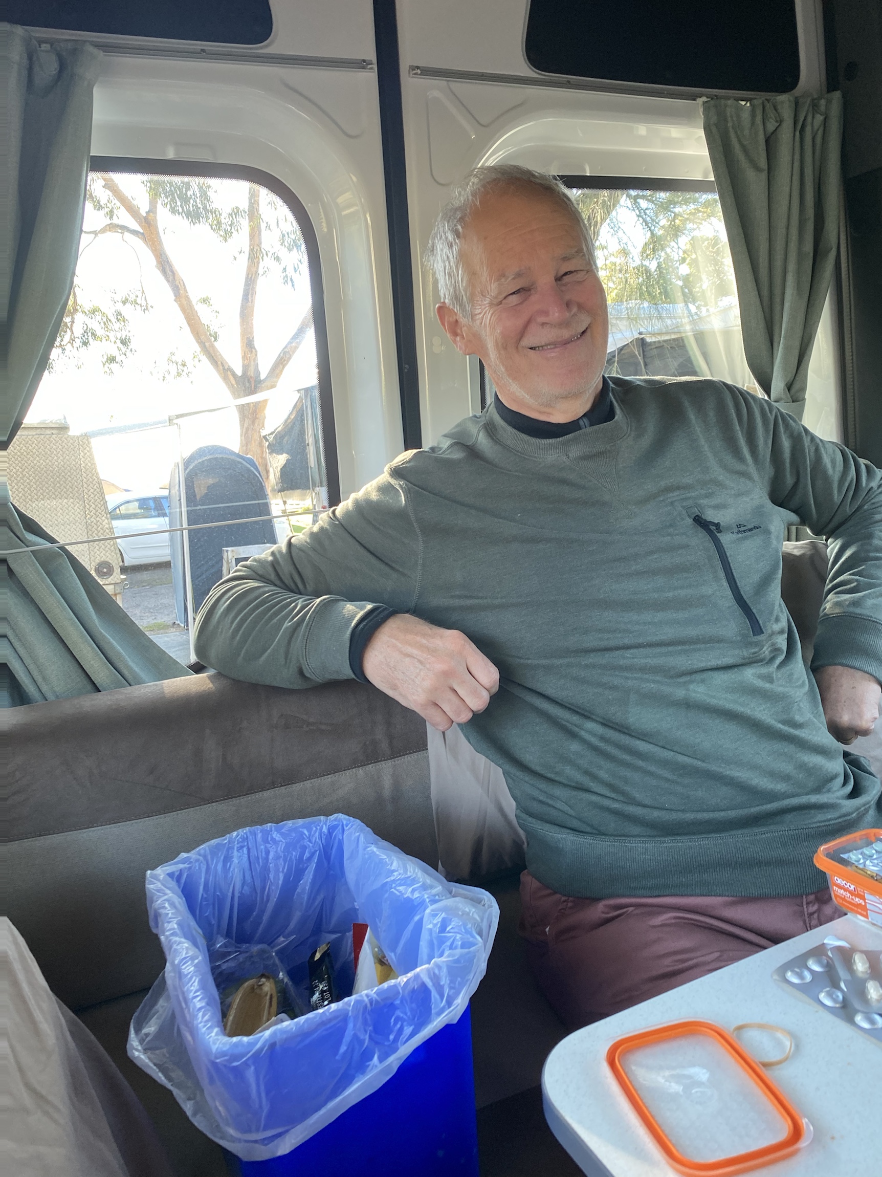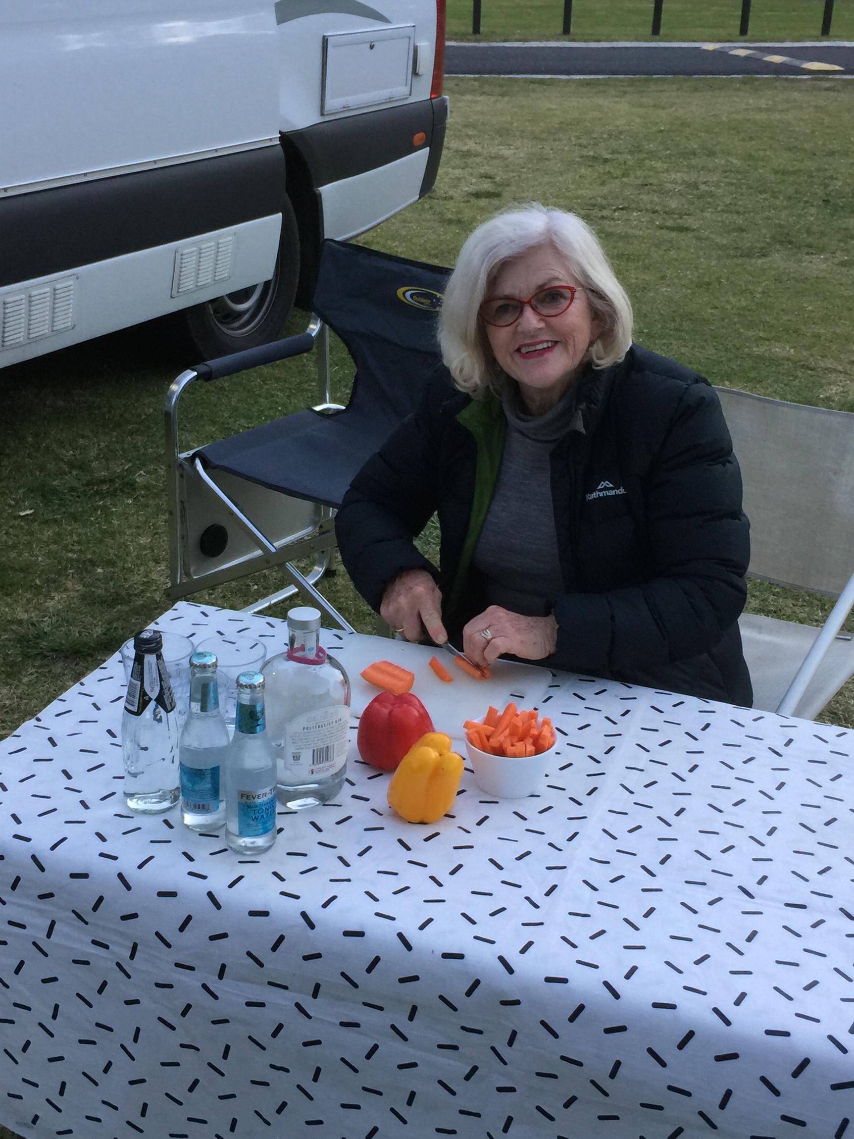 The van has a shower and toilet but we are all too nervous to use it and terrified of emptying the toilet cassette. We got set up so quickly that we were all very impressed- so much easier than the tents we normally use. Bill was delighted with the convenience of the rubbish bin at his elbow while he peeled vegetables. We quickly slipped into a little routine with each having a task but not underfoot.