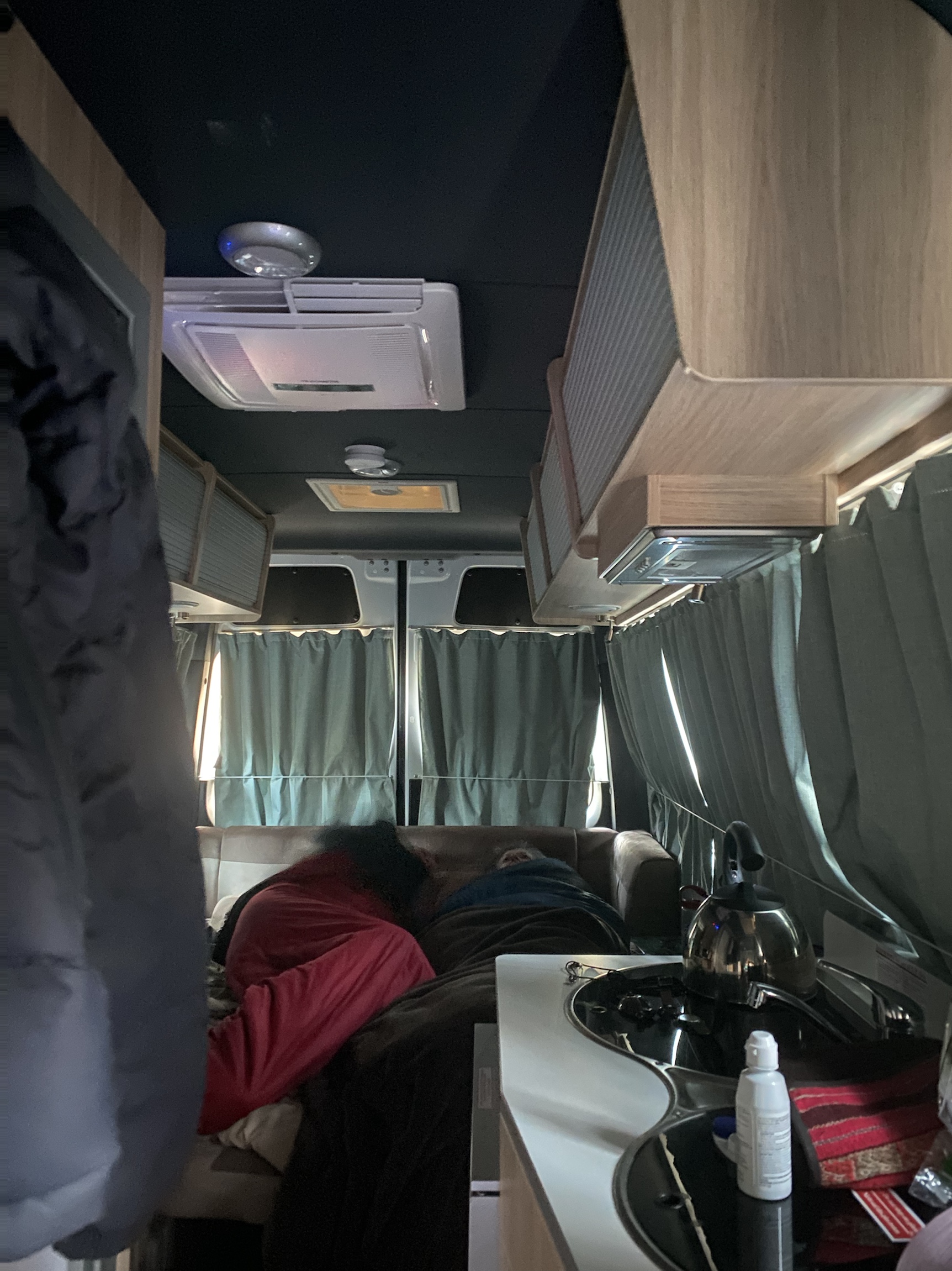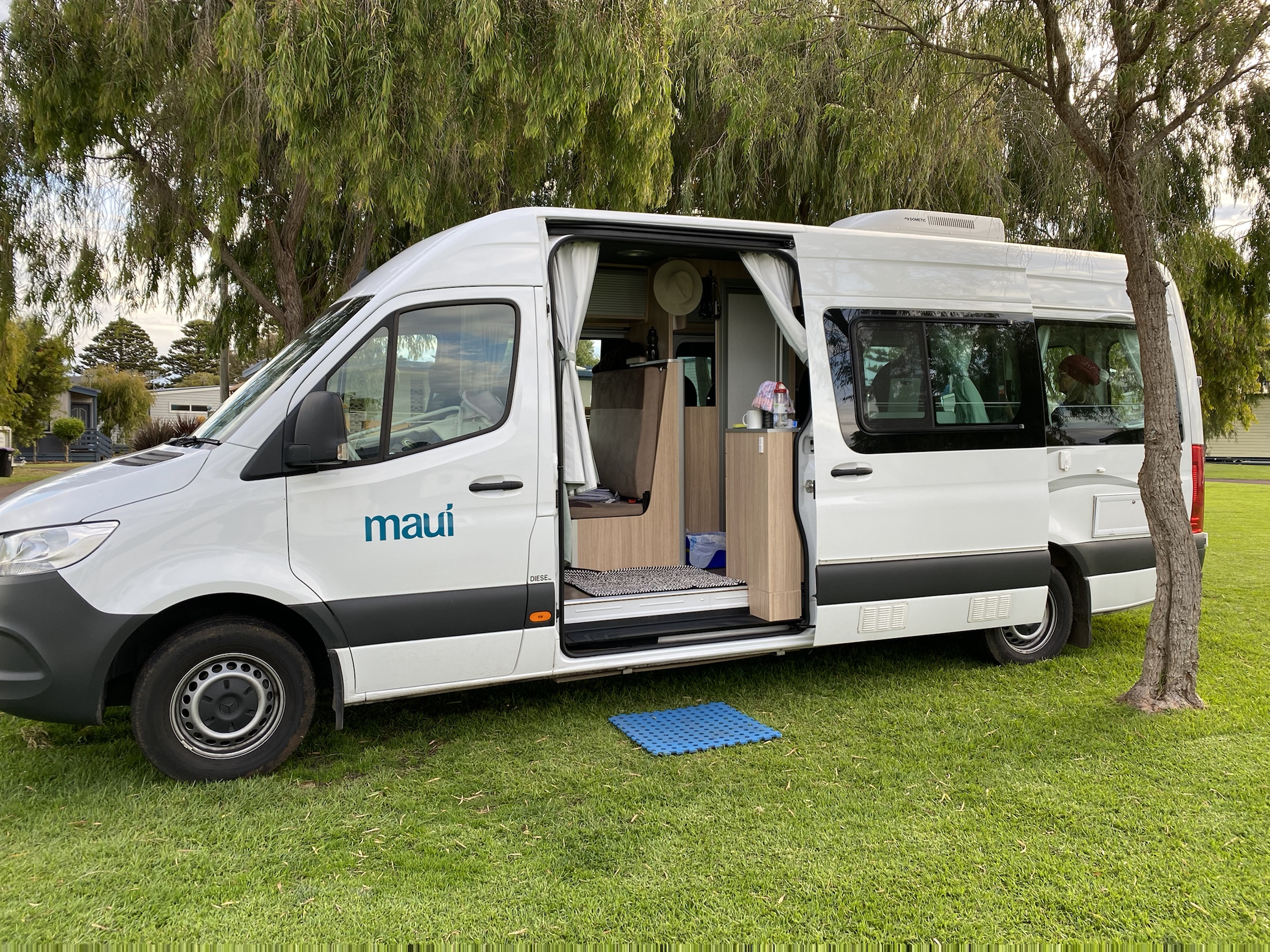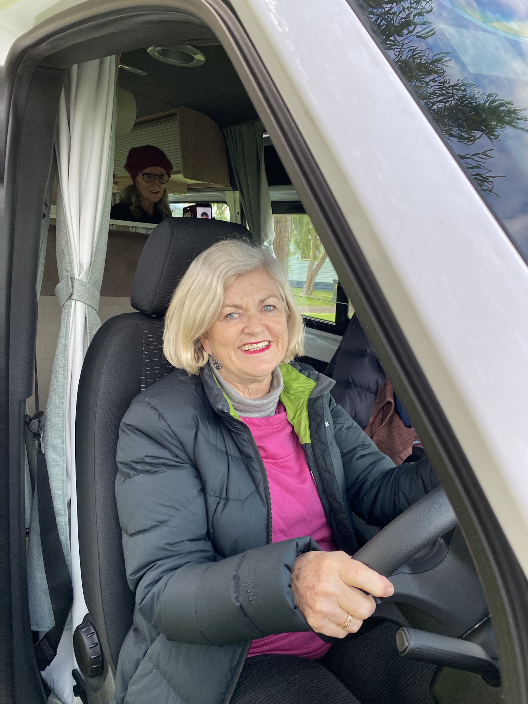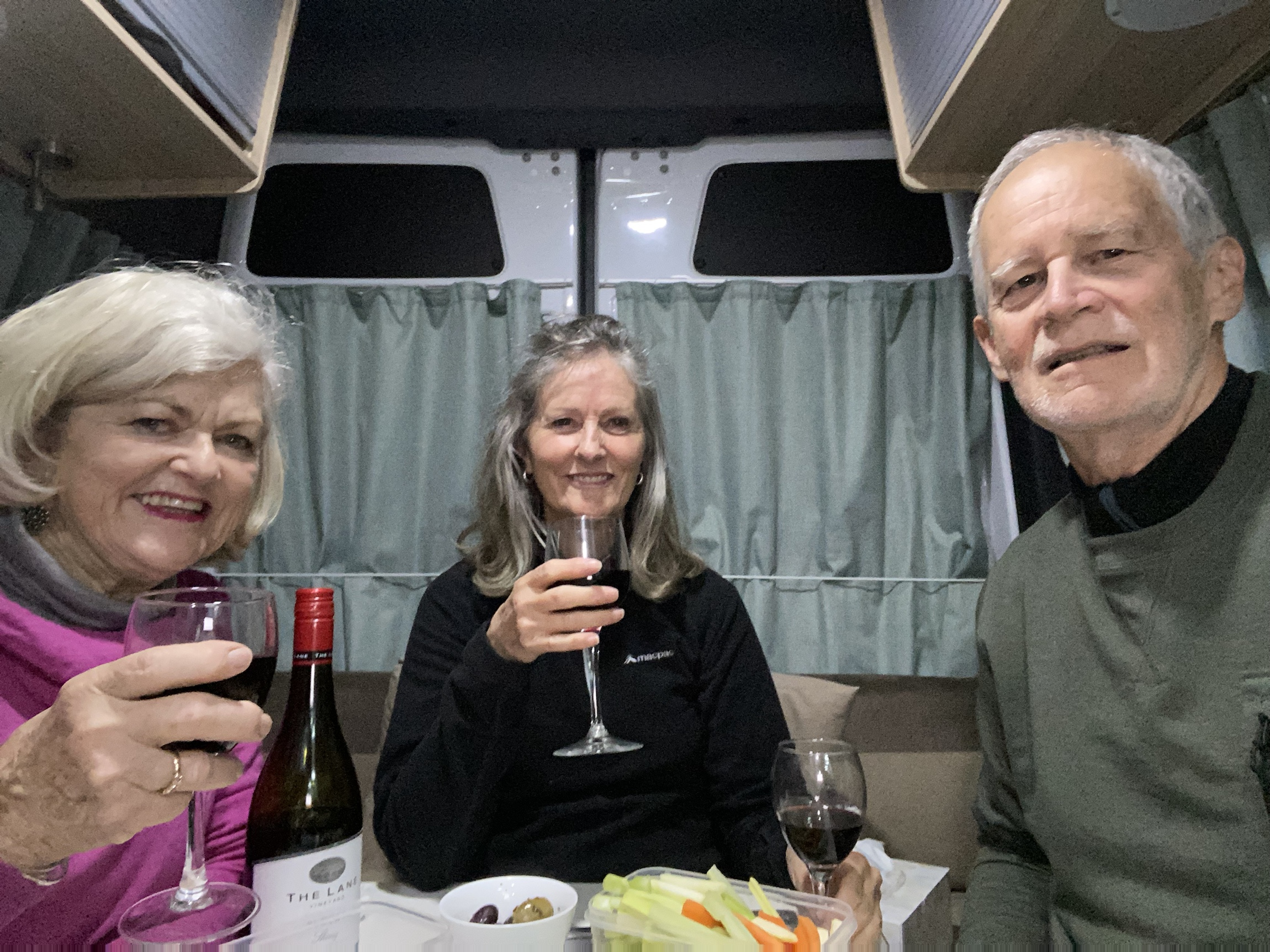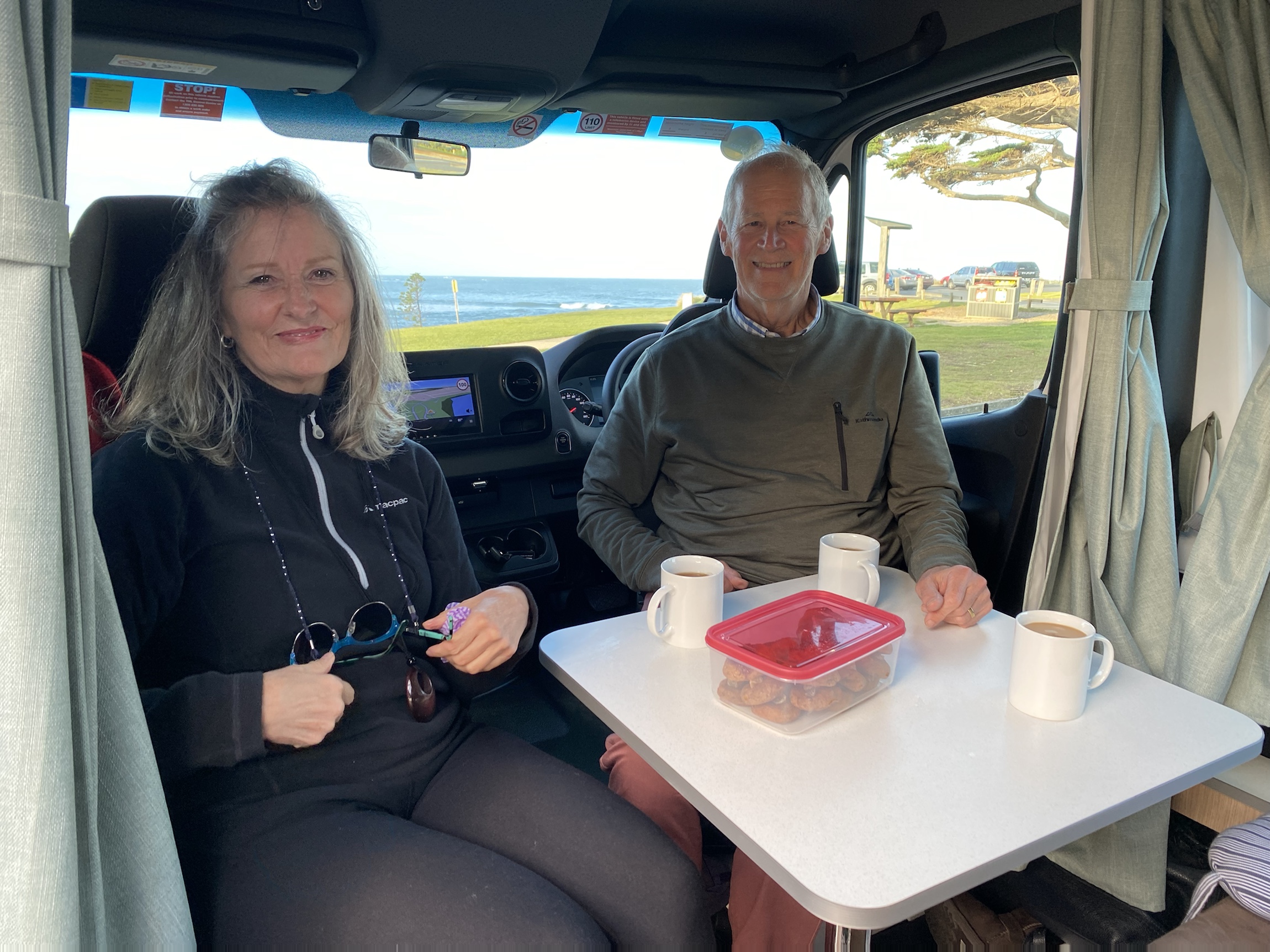 The van has a shower and toilet but we are all too nervous to use it and terrified of emptying the toilet cassette. We got set up so quickly that we were all very impressed- so much easier than the tents we normally use. Bill was delighted with the convenience of the rubbish bin at his elbow while he peeled vegetables. We quickly slipped into a little routine with each having a task but not underfoot.