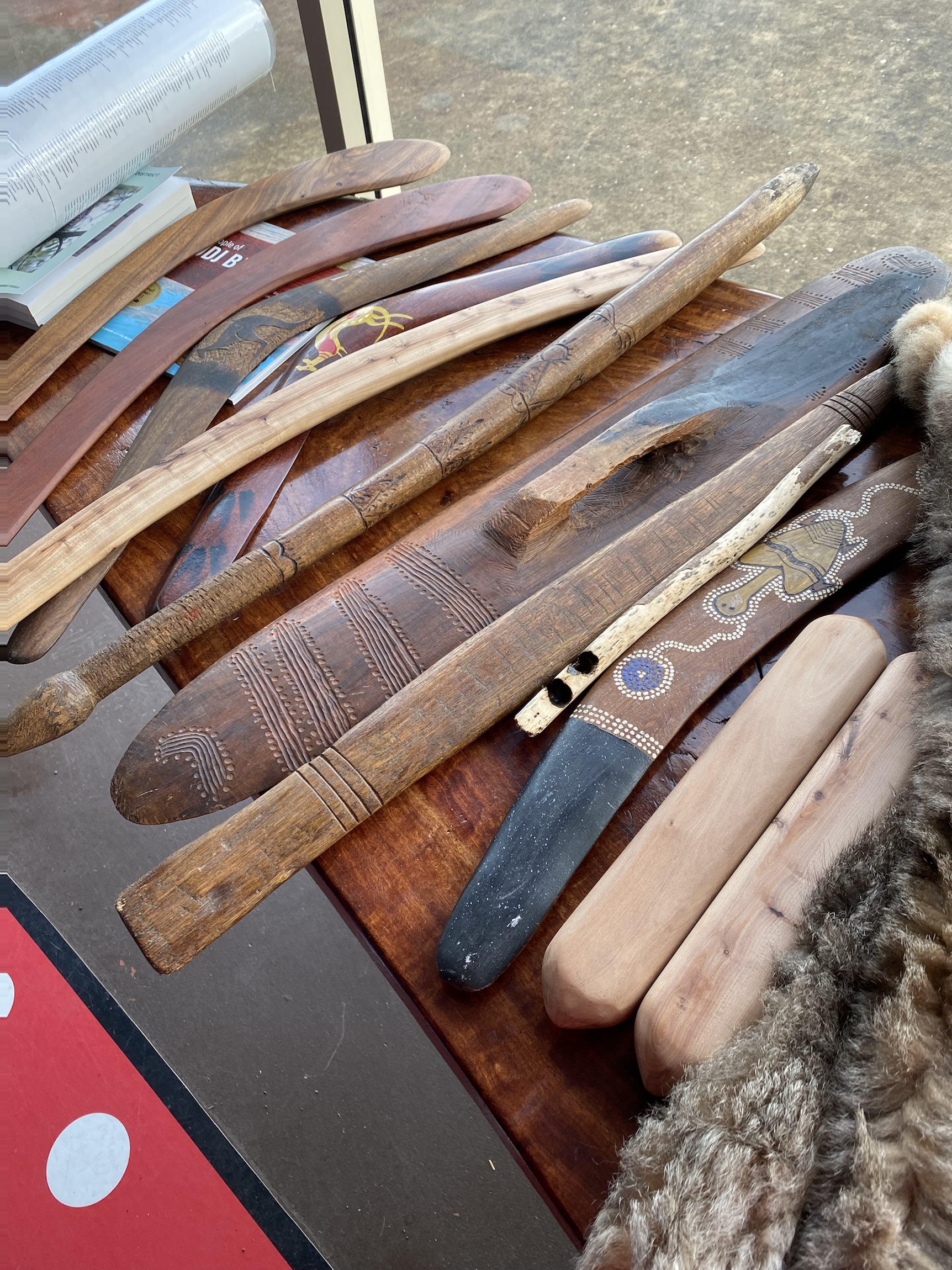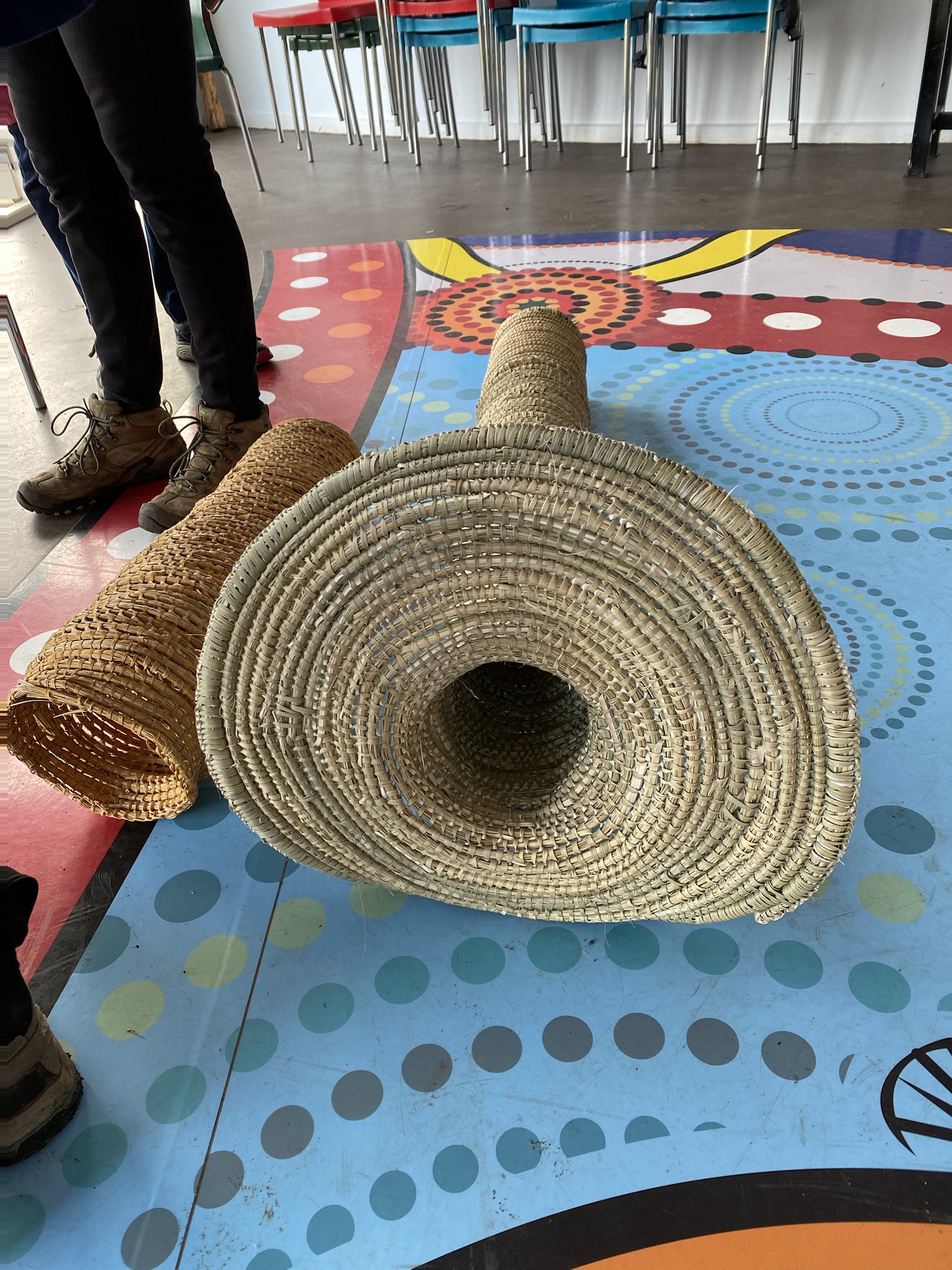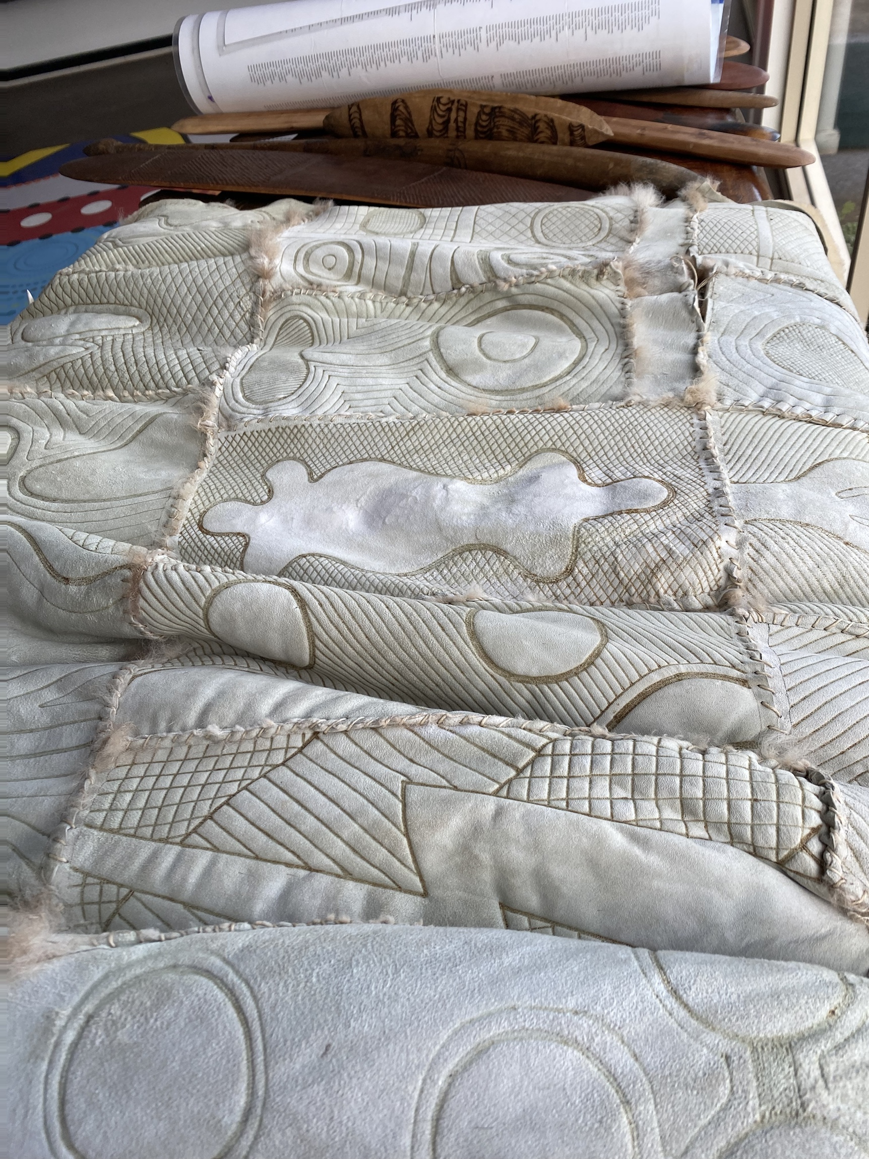 Eel trap, possum cloak on which a persons personal story was written, indigenous tools, and Koalas cuddling.