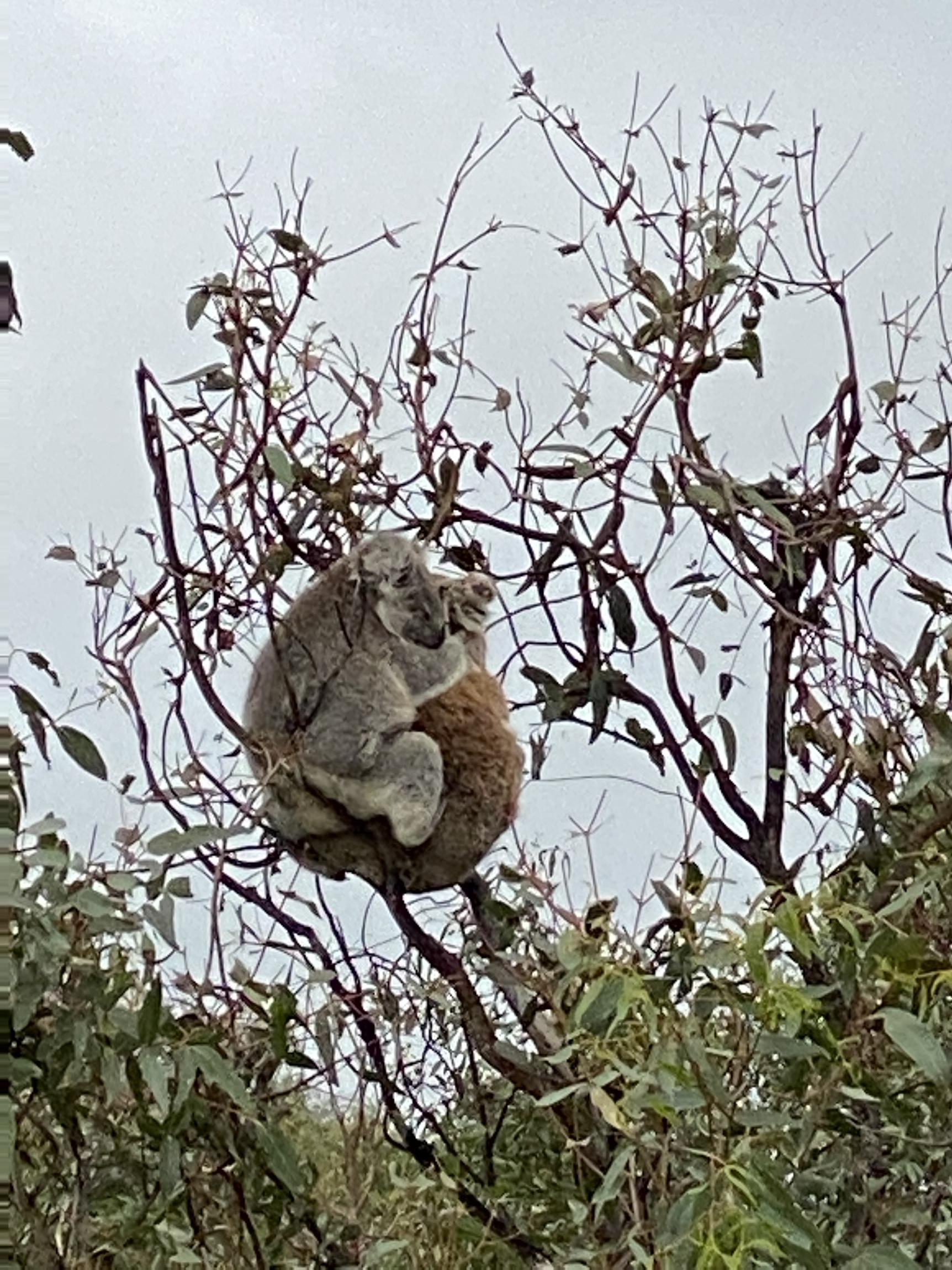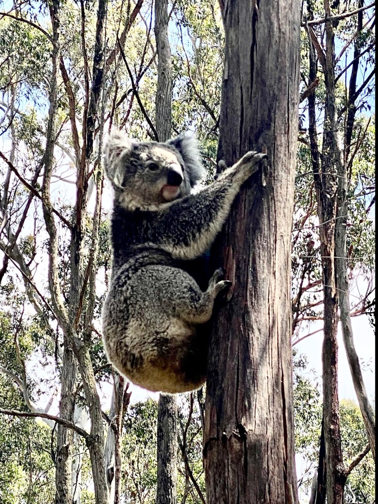 Koala in the trees where we walked. The hail storm at lunch. The forest nearby.
