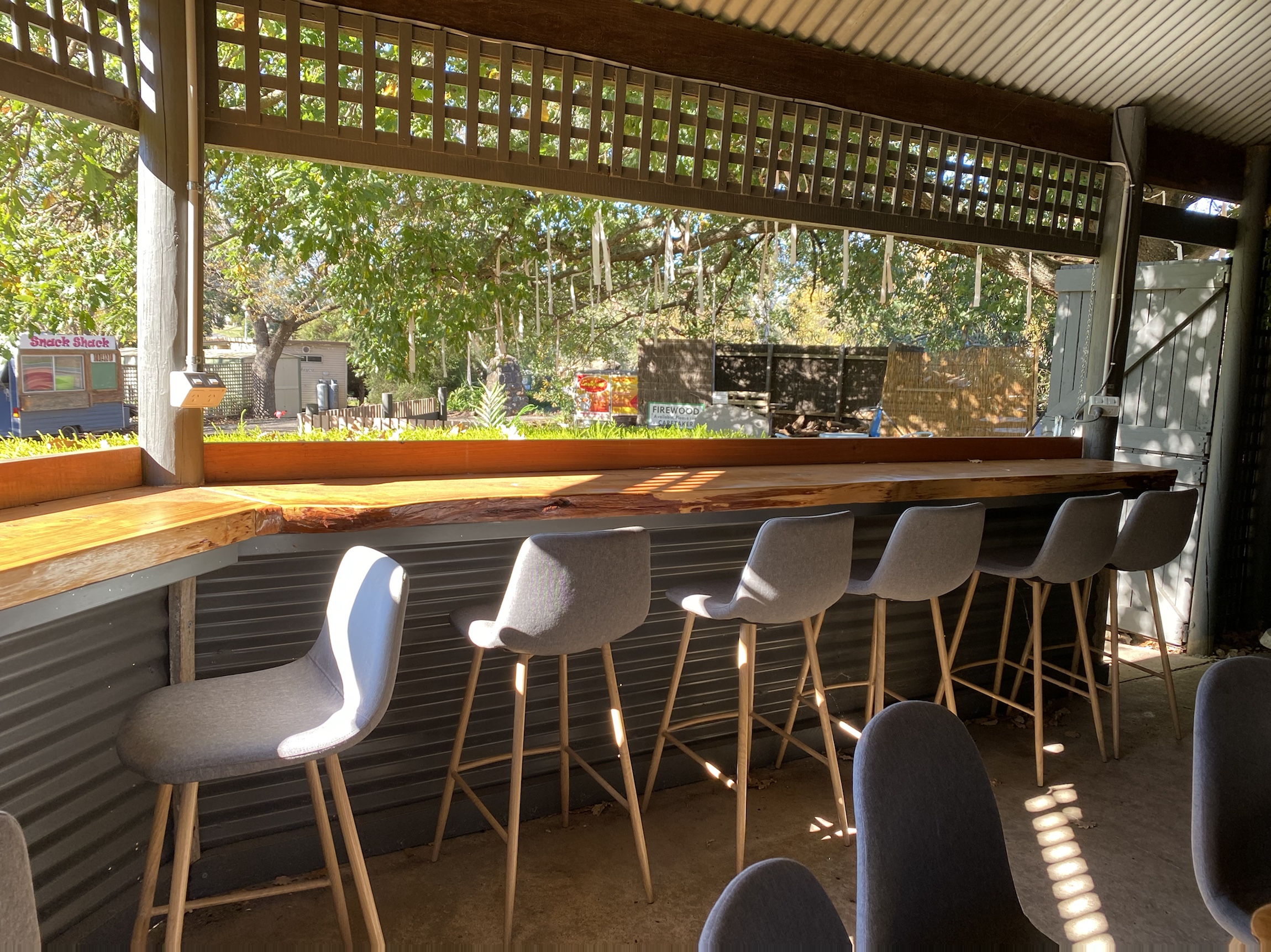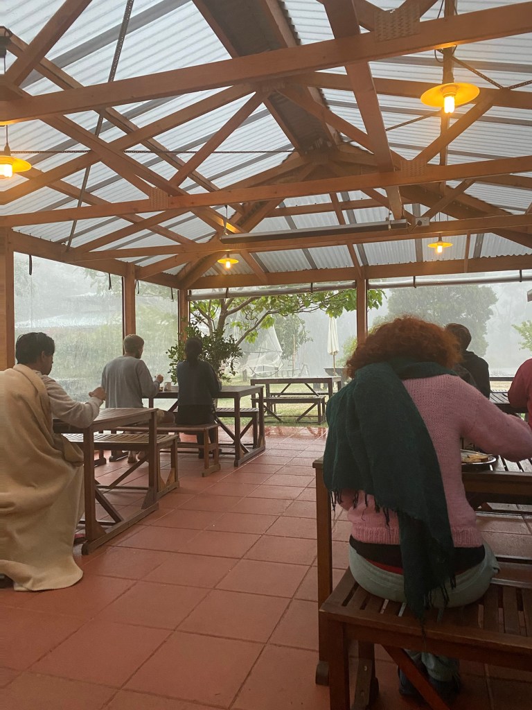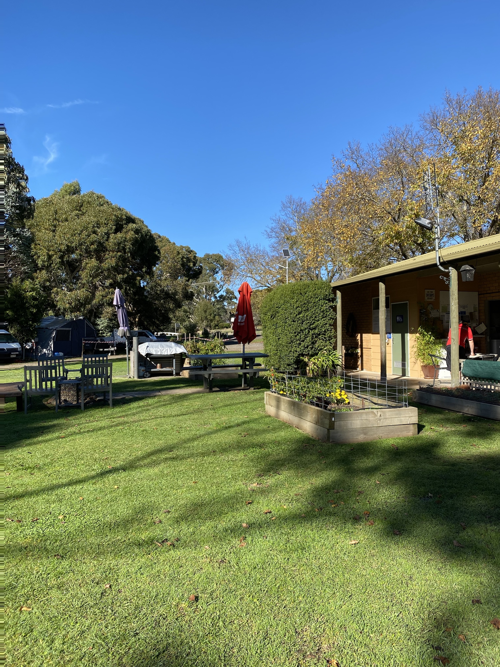 Dunkeld CP camp kitchen, garden and view to the Grampians, the BBQ areA, Lunch at the Royal Mail and desserts, Irene with tea in the garden of the Royal Mail