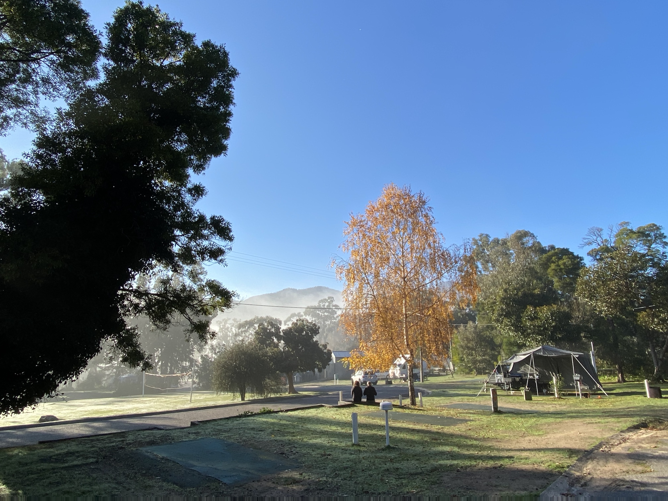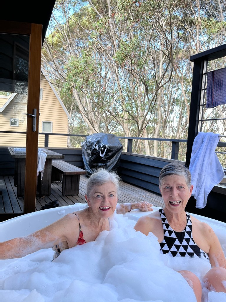 We immediately became part of the camper van crowd. Another van parked close by revealed a smaller weekend style of travel and the young couple with their dogs, were eager to share their experiences. Like us they were from Melbourne and just enjoying a break after last year’s lockdown. Finally arriving at Lorne Foreshore Caravan Park after hours, Bill backed the van into place while Irene and I guided him.