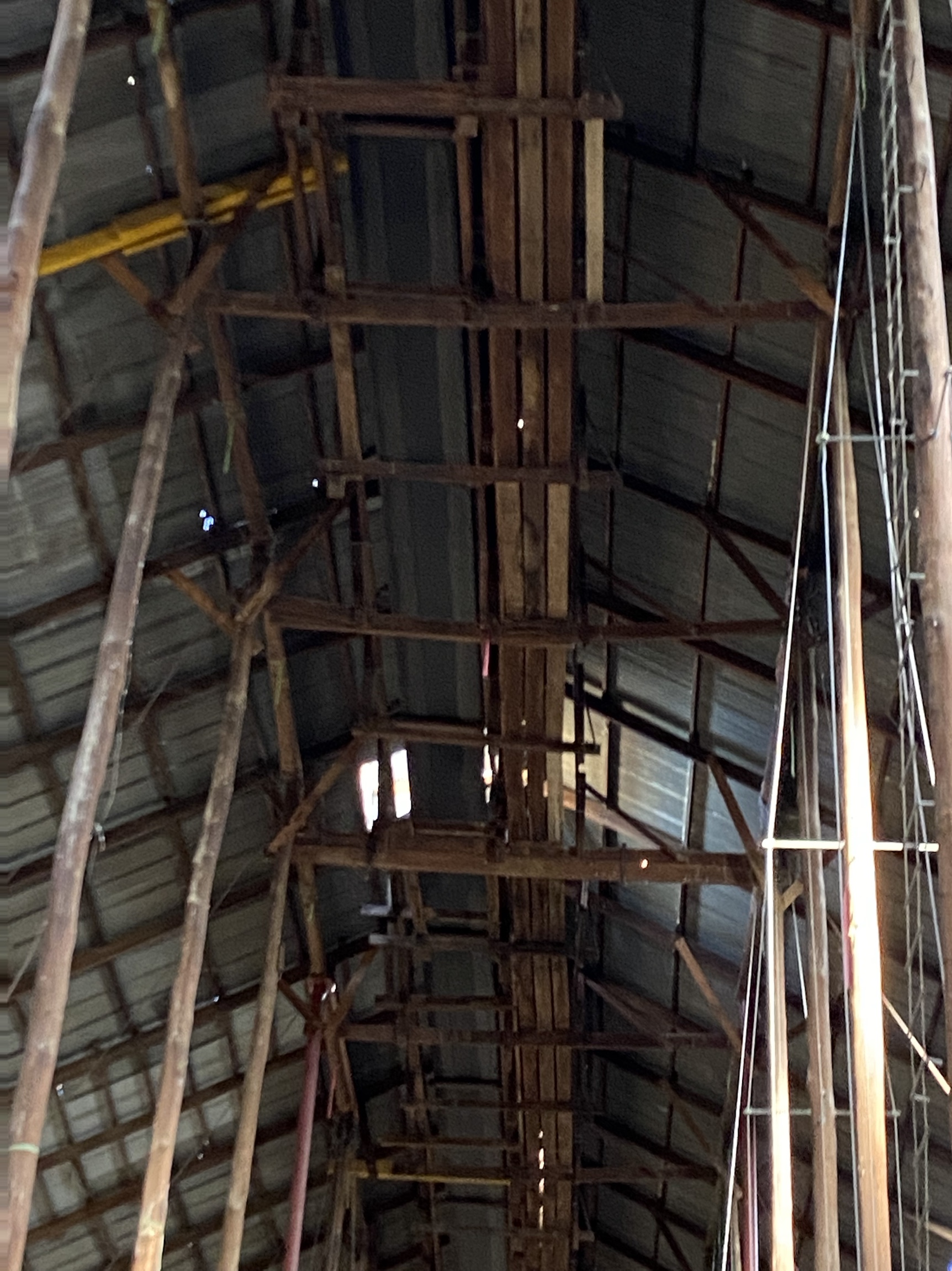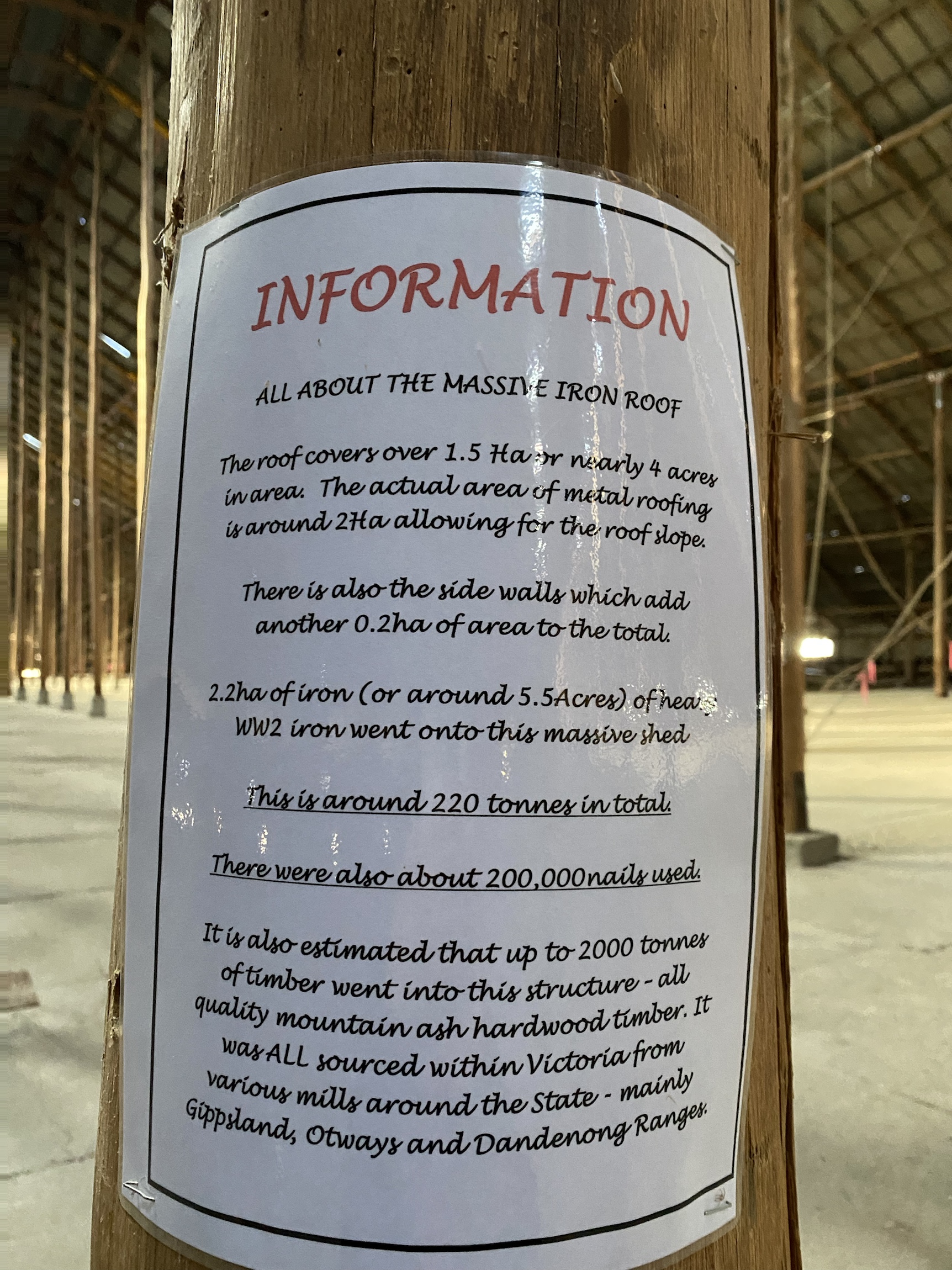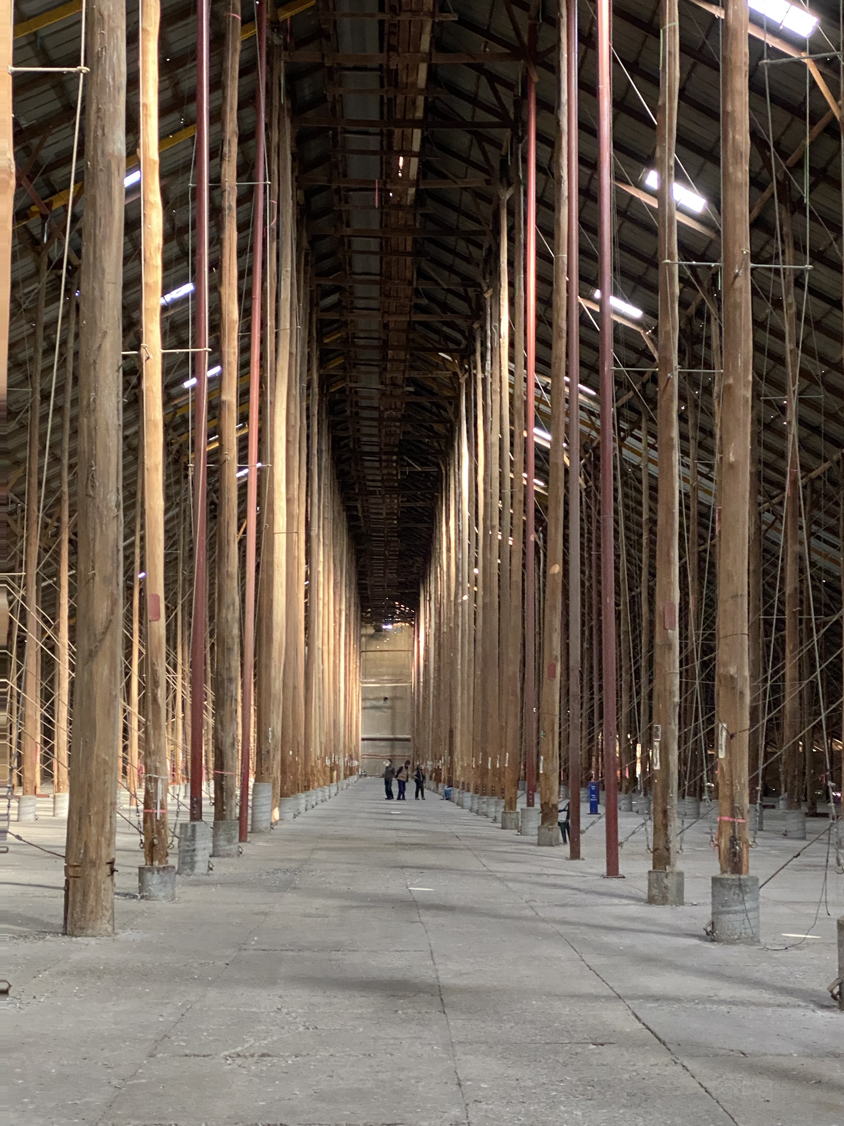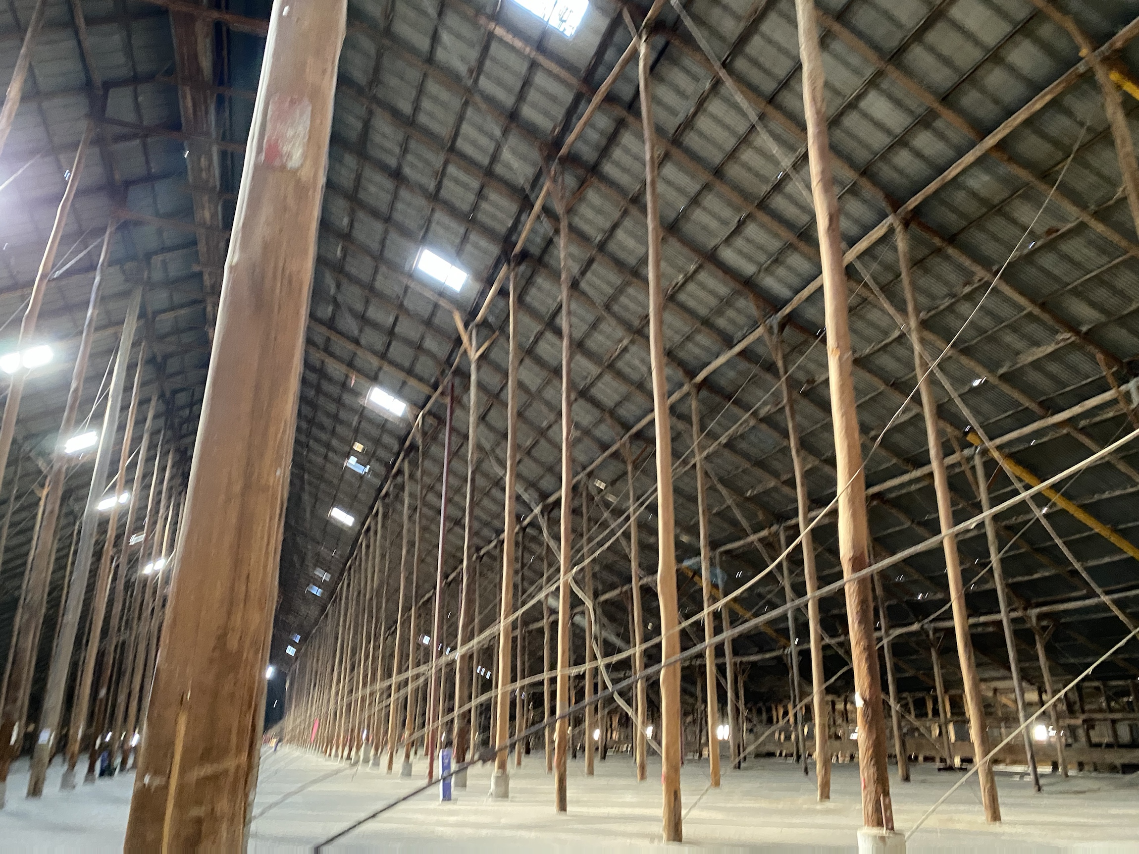 The inside is so impressive and evoked a sense of grandeur I have experienced in some Cathedrals. Whether it was the rough supports or the flexible purlines that tighten to support the building when it is windy, or just the sheer size (270metres long x 60 metres wide and about 19 metres high at the ridge) the building seems to have a soul. I could imagine a concert in there, though acoustics are probably terrible.