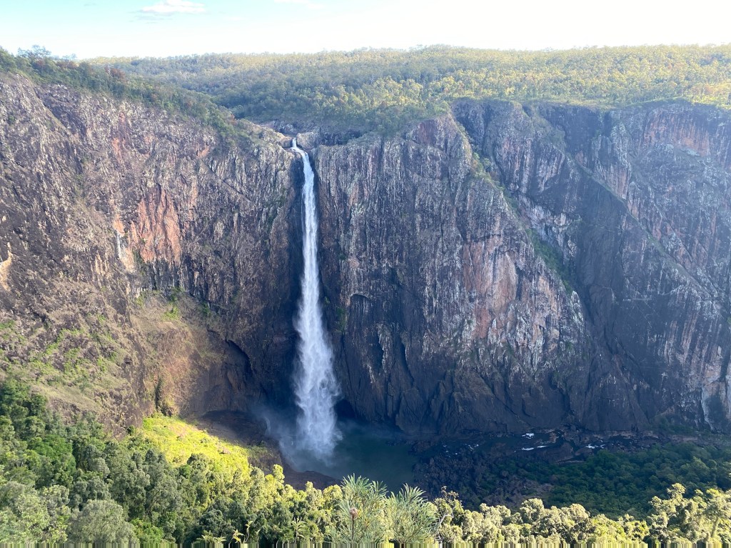 Standing at the tip of Cape York ( Pajinka) Queensland, view back to the beach, the largest Strangler Fig tree, Atherton Tableland, lava tubes, dinosaur fish, dinosaur stampede, Tree of Knowledge Barcaldine, looking up in the amphitheatre Carnarvon gorge, our Camper trailer. And the Wallaman Falls.
