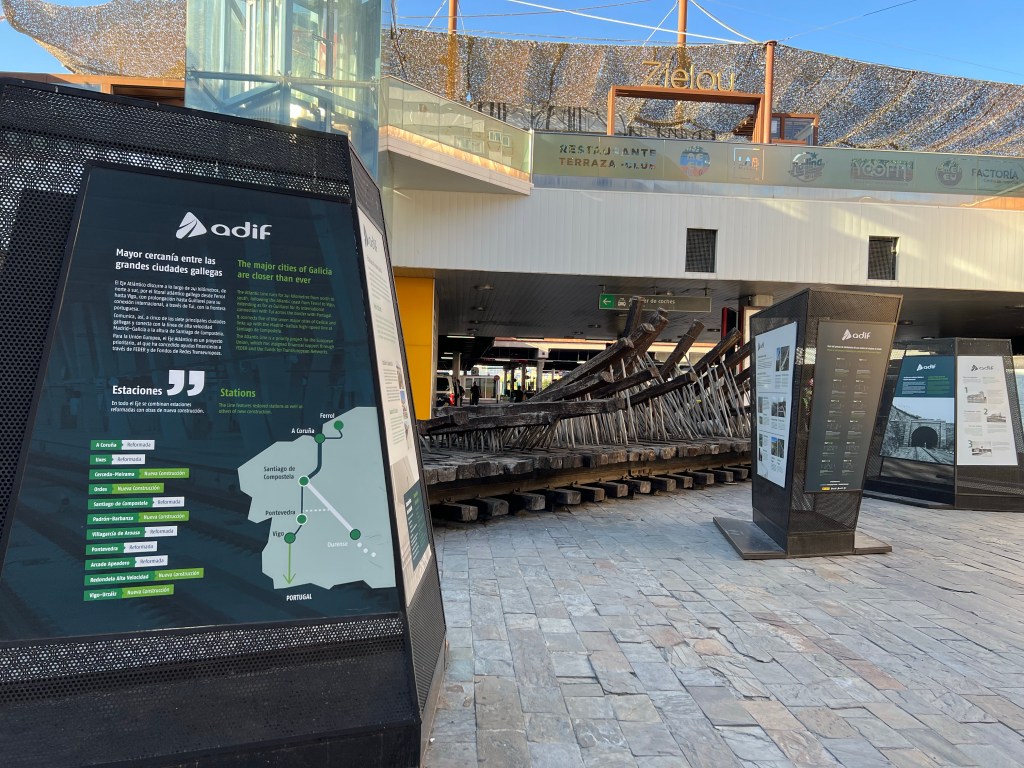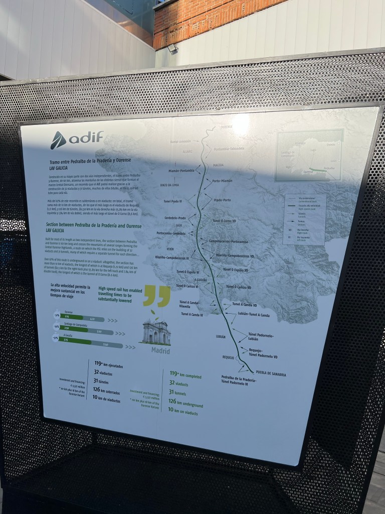 The interior of the train, the station, lunch/brunch, art around the station and a display about a new railway line that was being built and I walked near on the Via de la Plata