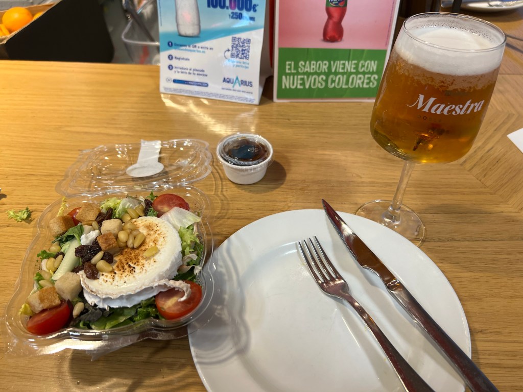 The flight was uneventful but the food was pretty average with mainly stodgy pasta or noodles so when I finally got to Madrid Chamartin train station I was craving fresh food and promptly ordered a salad with goats cheese and a beer! It is 9,00 am but feels like lunch time. The train from airport to here was only €3.10 and only a bit more into the heart of Madrid. A taxi is € 30. Brilliant service.
