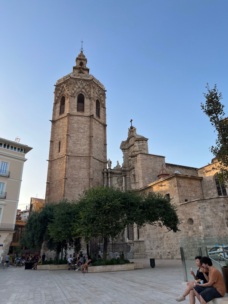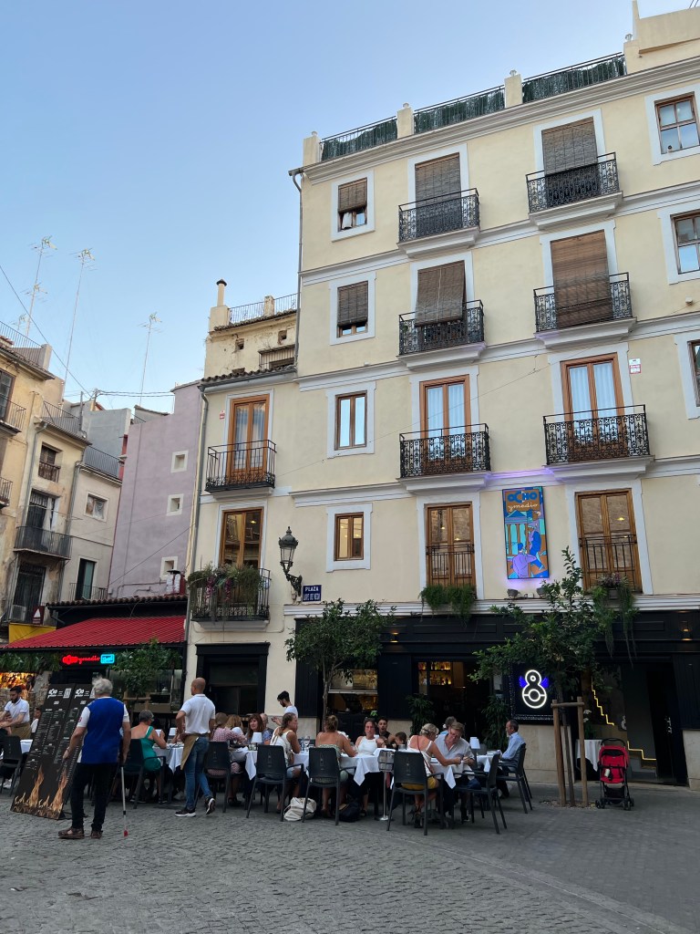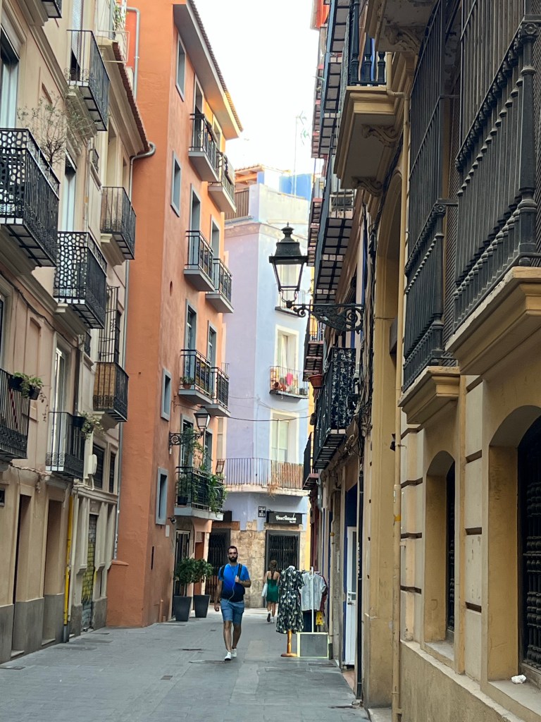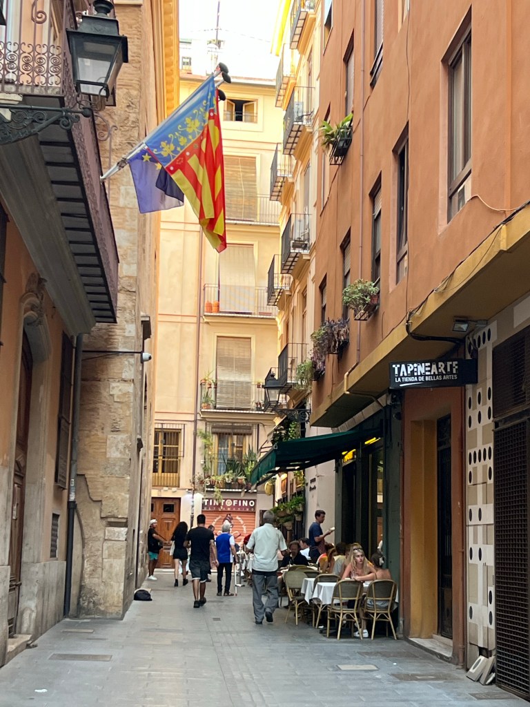 The country side looks so parched and the crops had been harvested though there were lots of olive trees and several vineyards amongst the wheat. When i arrived it was so hot that the 15 min trek to the hotel resulted in me looking like a Valencia tomato. I showered and set off to explore. Everyone is just getting out and about now after siesta. The hostal Antigua Morellana is a small pensione style right in the heart of old Valencia. Surrounded by charming narrow streets and plenty of bars and restaurants as well as shops. By now I am fading fast. After a dinner of delicious squid a la planchs – ( plain) I crashed. Satisfied that I at least made the local 9.00 pm dinner time.