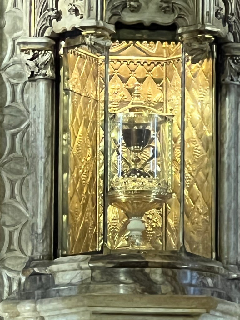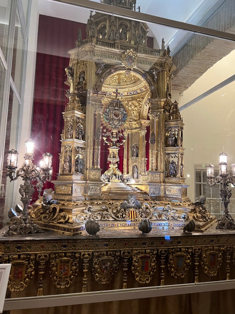 Yesterday I explored the old city and visited the Cathedral museum which is the repository for two major religions icon. The first was the Holy Grail, an alabaster cup reputed to be used by Christ at the last supper and a monstrance That is used at the feast of Corpus Christi. It is the largest in the world. I was glad I went early because when I left there was a queue! It was very interesting they also had a relic of the local Saint Vincent Martin which was his forearm and hand – quite well preserved. Mostly relics are just bones of some saint but this was pretty creepy with flesh.