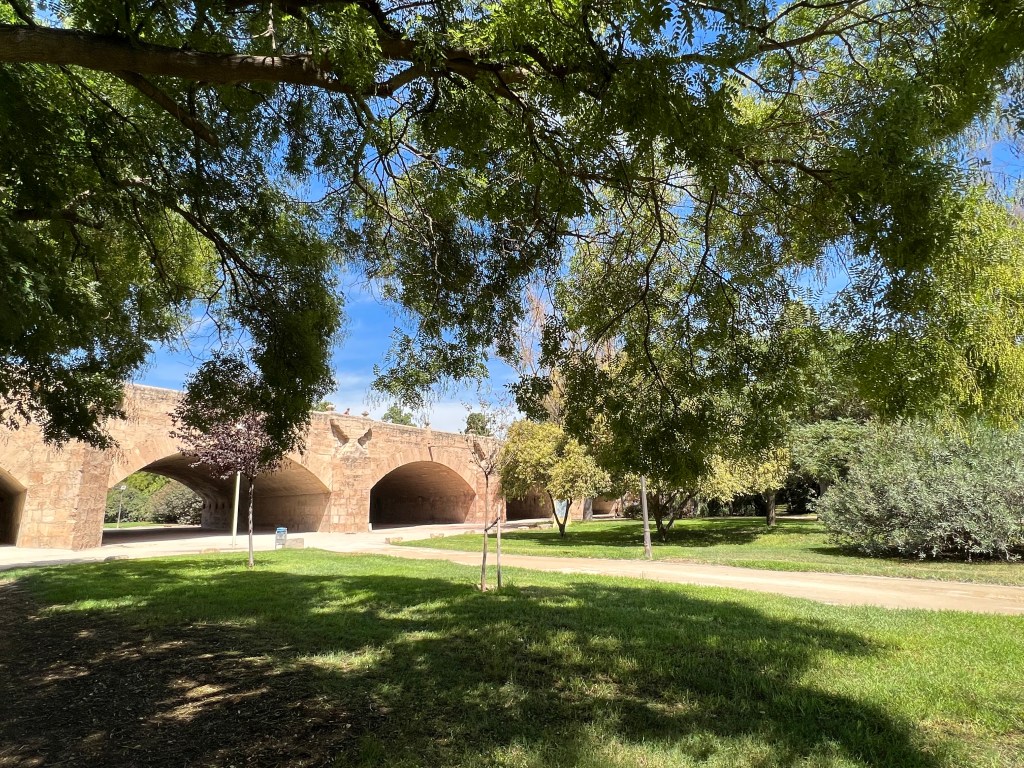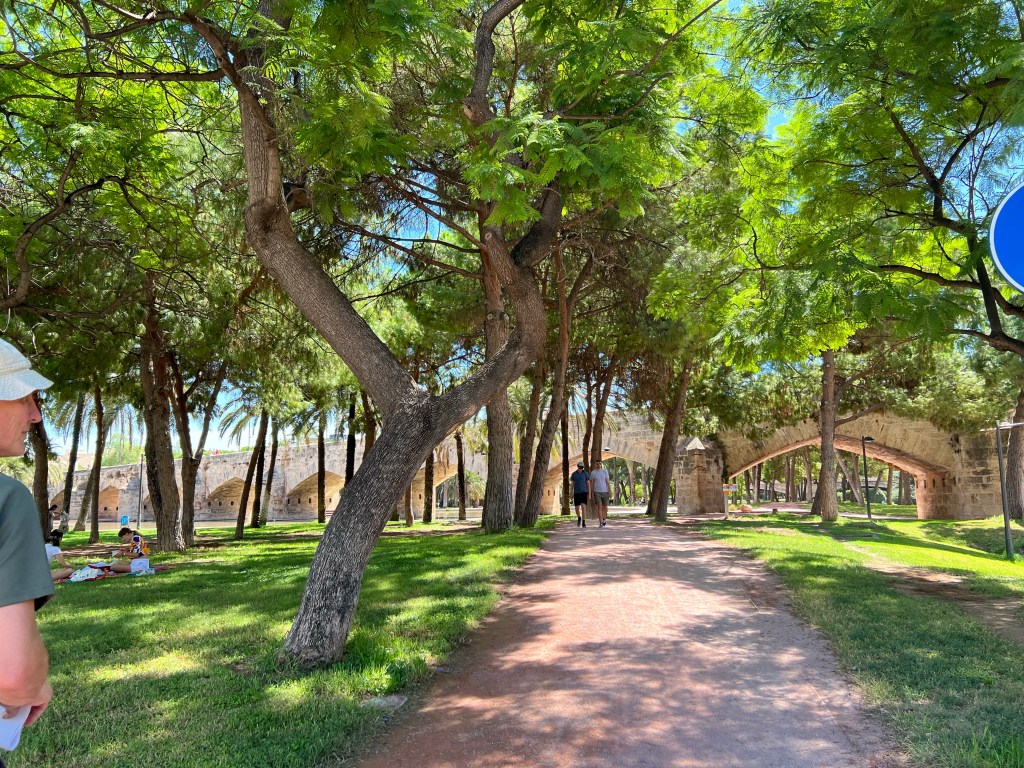It was very hot. I tooa stroll to the Turia gardens. This was the river but it has been diverted and the river bed made into playing fields and gardens. They are a delightful green space for the citizens of Valencia. Hot and weary I returned home to wait for my friends. As it happened they too suffered a delay departing and did not arrive until 9.30 pm. In the end we didn’t eat but went for a drink at a nearby restaurant bar. We just talked till midnight like the locals!