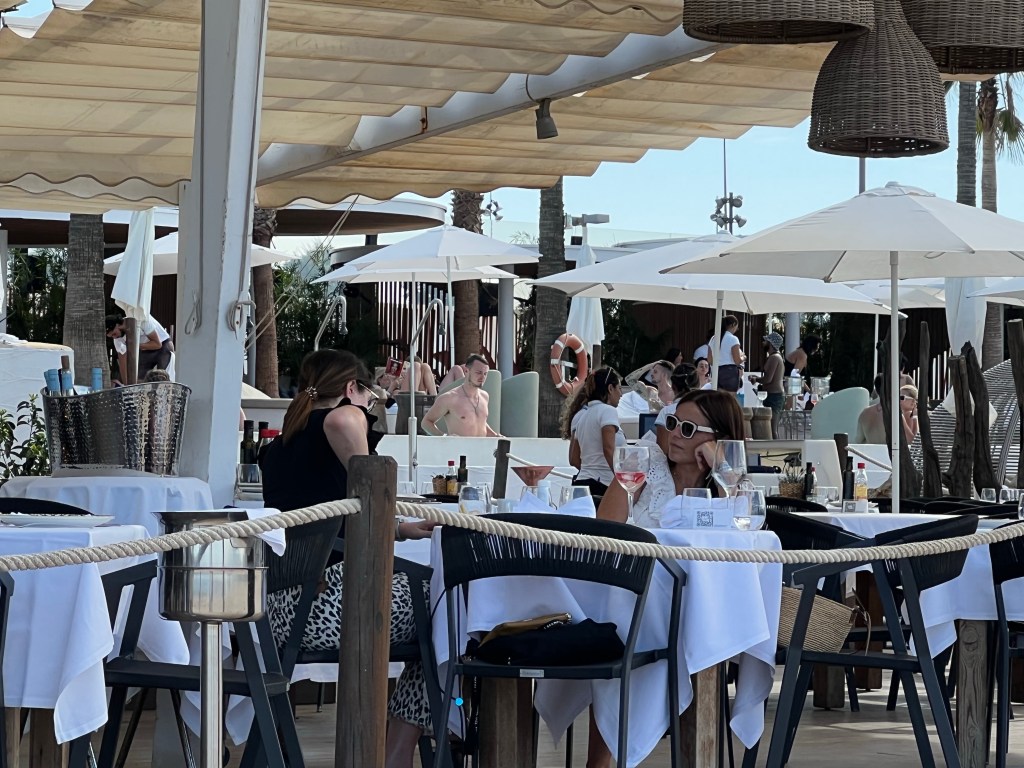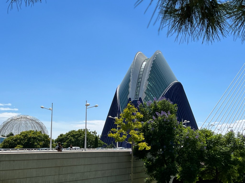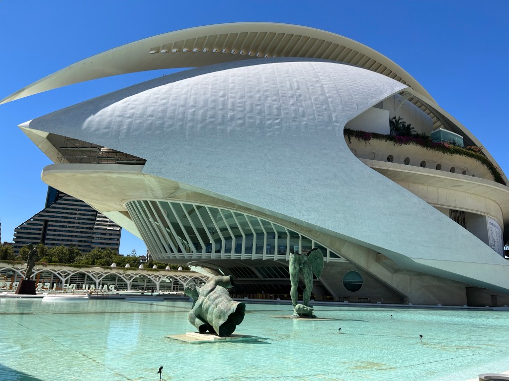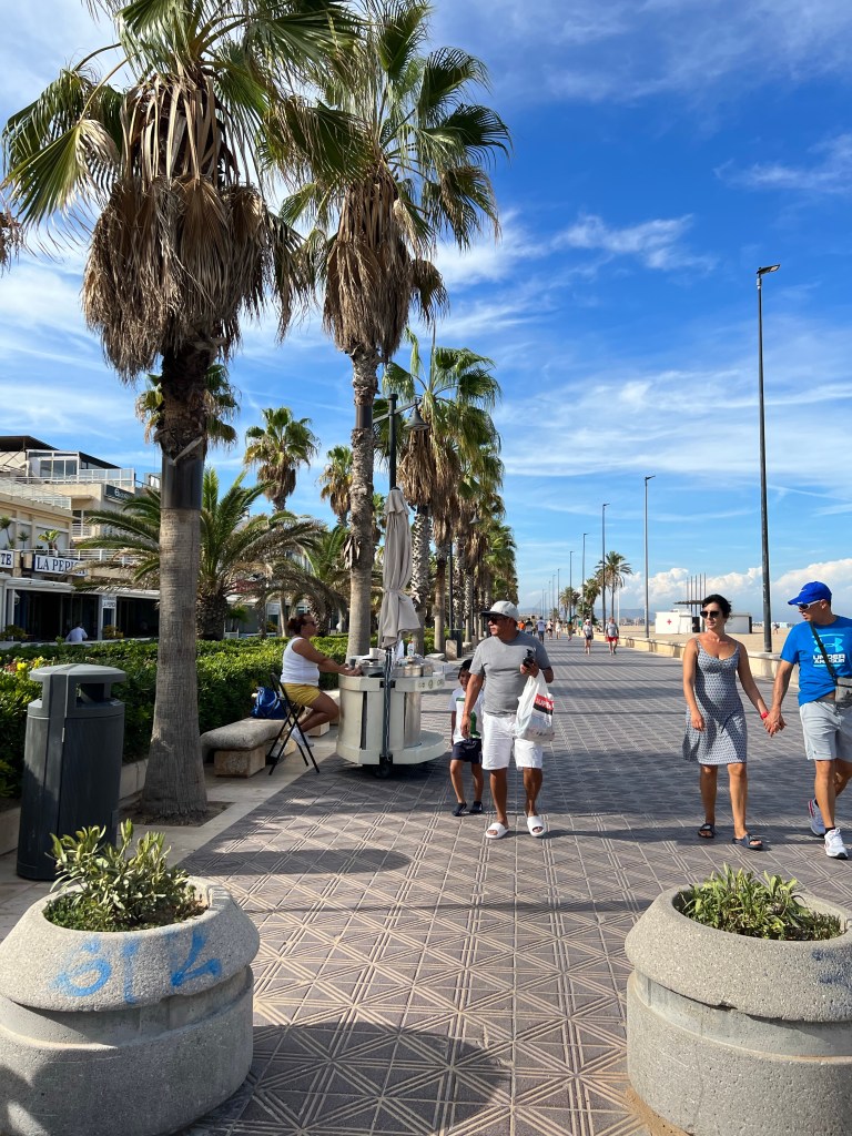 Once more we set off, this time for lunch and drinks, the temperature rising steadily. No orange juice! There seems to be a shortage of oranges this year or they are all being juiced in the heat! We decided to walk through the Turia gardens for the shade and explore. A delightful range of trees from Boabs to an Umbre tree, Oaks and Jacarandas as well as Oleander bushes and others I didn’t know. Valencia is full of cyclists riding around in normal clothes at a leisurely pace. Such a contrast to the manic Melbournians in Lycra. We came across a construction that intrigued us until we realised it is Gulliver laid low by the Lilliputians. Eventually we arrived at the centre for Arts and Sciences. What a fantastic building. The surrounding pools of water were so inviting in the now extreme heat but the only things in the pools were marvellous bronze sculptures, though around the corner there were kids in rowboats and paddle boards. We rested and had icy poles. Karen was beginning to feel the effects of the heat. Despite this we pushed on towards the beach. Where we were greeted by pulsing music and a very glamorous restaurant/ poolside bar and lounging area.